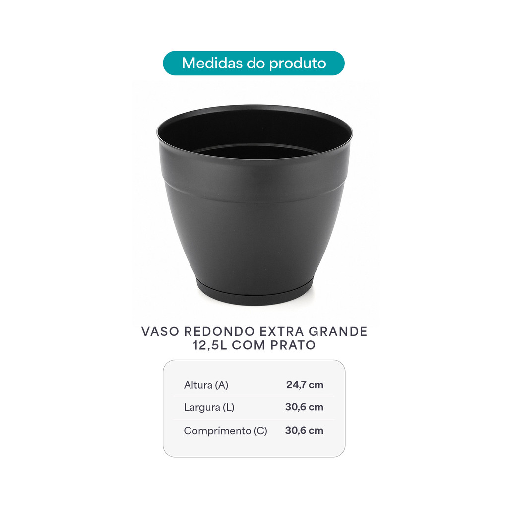 Vaso Redondo Plástico Extra Grande 12,5L com Prato Anti-Dengue para Jardim Varanda e Interior