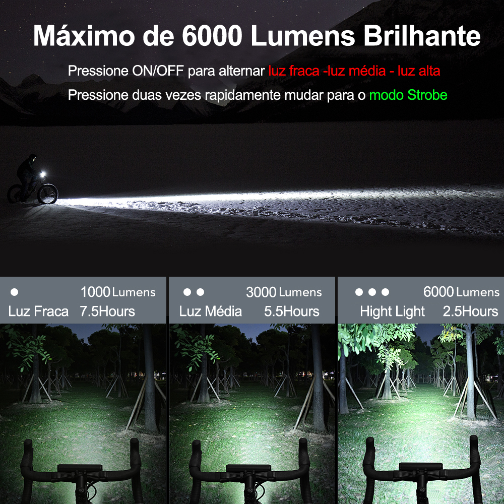 NEWBOLER Luz Frontal De Bicicleta 6000 Lúmens USB Recarregável 8000mAh IPX6 À Prova D'água Flash Light Aluminum Shell Acessórios