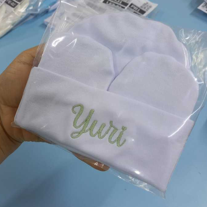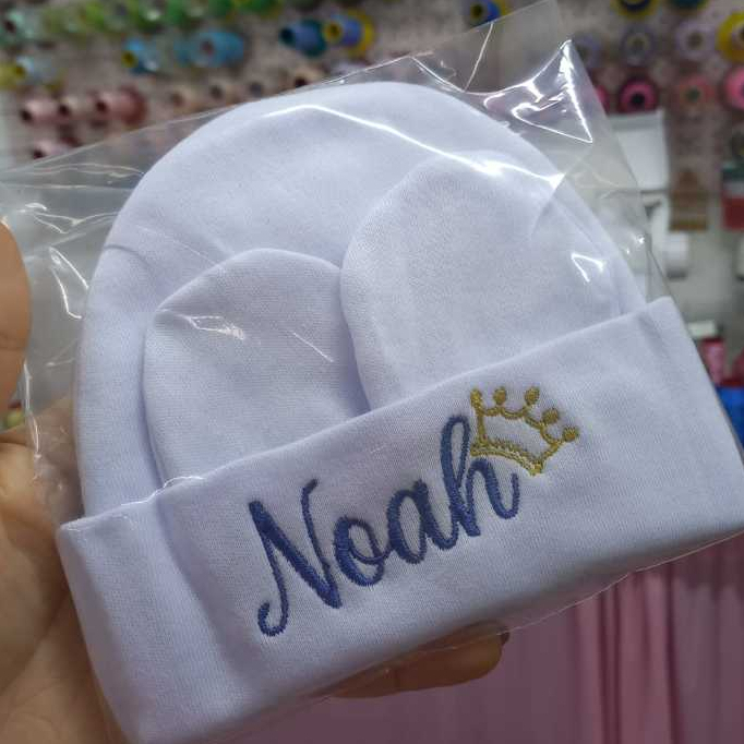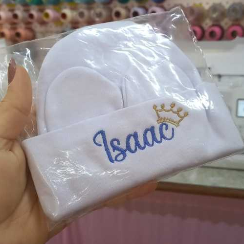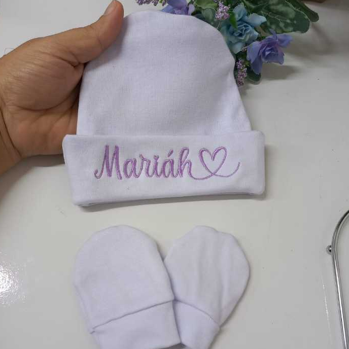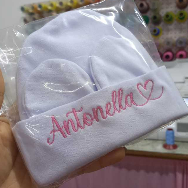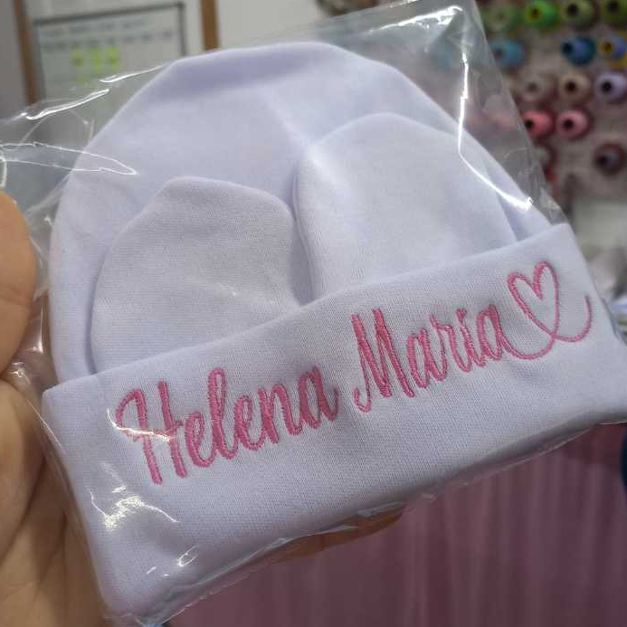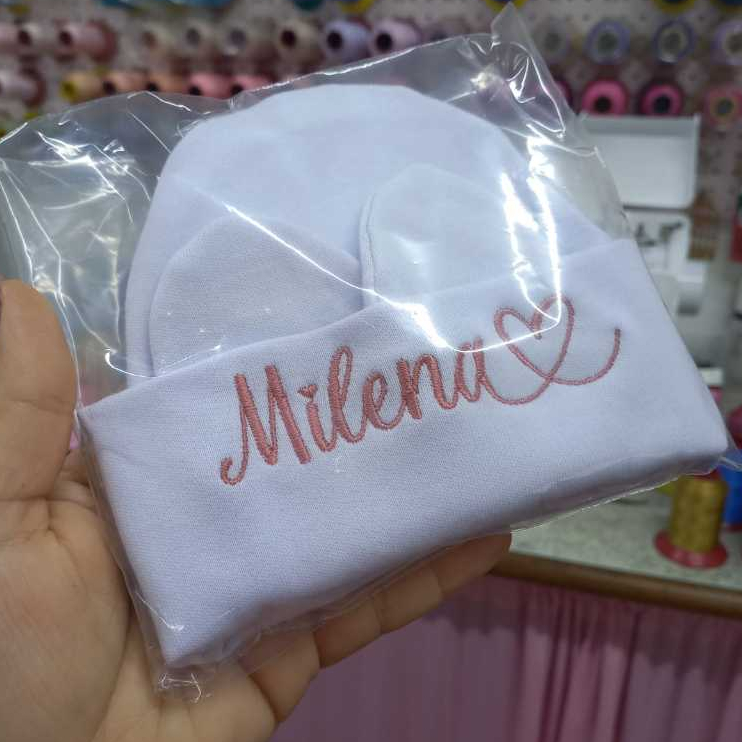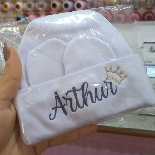 Kit Touca e Luvas Personalizado Maternidade Recém-Nascido Super Macia Malha Algodão RN