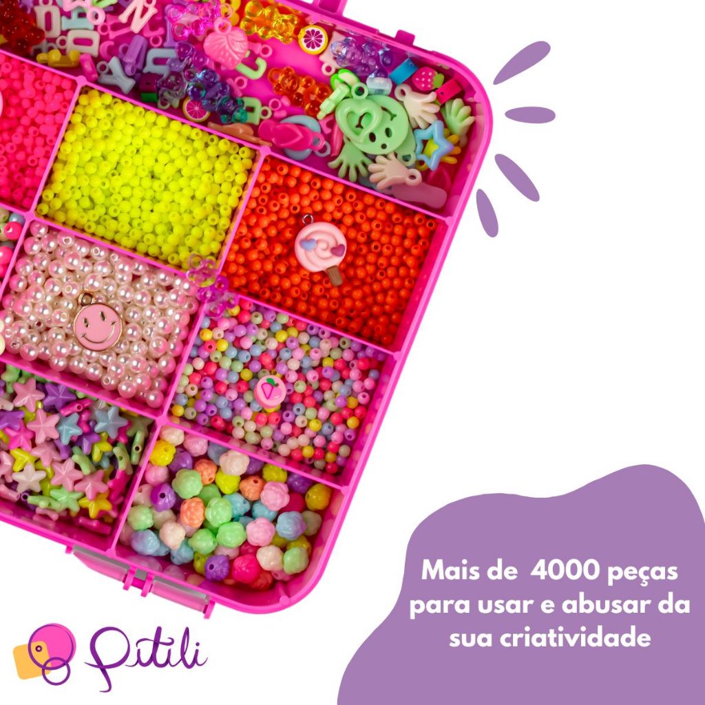 Kit Miçangas 4000 Peças para Fazer Pulseiras + Fio Elástico | Maleta Organizadora Bijuteria Infantil