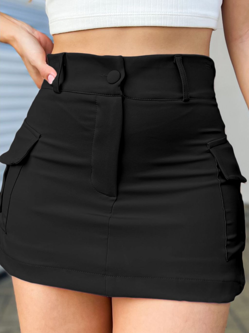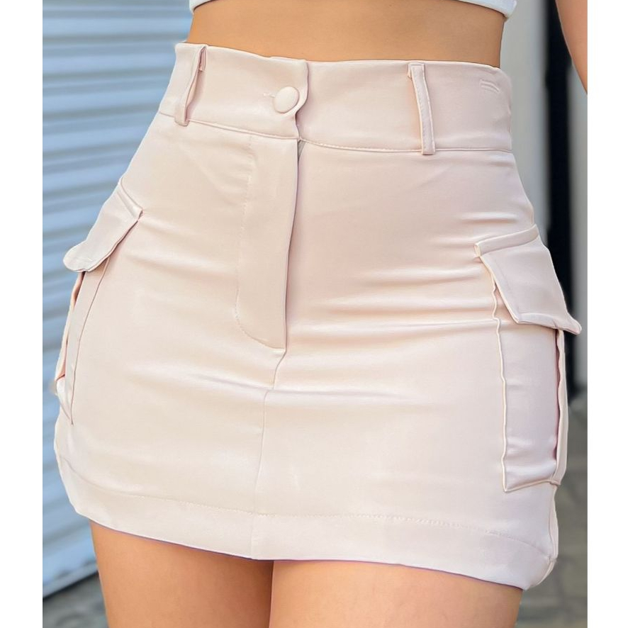 LuluRunModa Short Saia Alfaiataria Bolsos Cargo Feminino Liso e Botões - S546