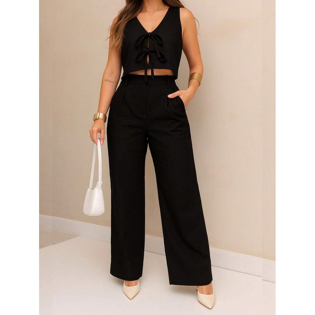 Lulurunmoda -Conjunto Feminino de Viscolinho com Colete Decote Em ``V`` -S905