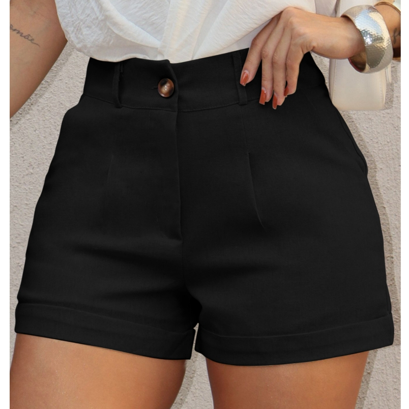 LuluRunModa Short de Linho Casual Feminino Detalhes Botões de Madeira e Bolsos/ Possui Forro S533