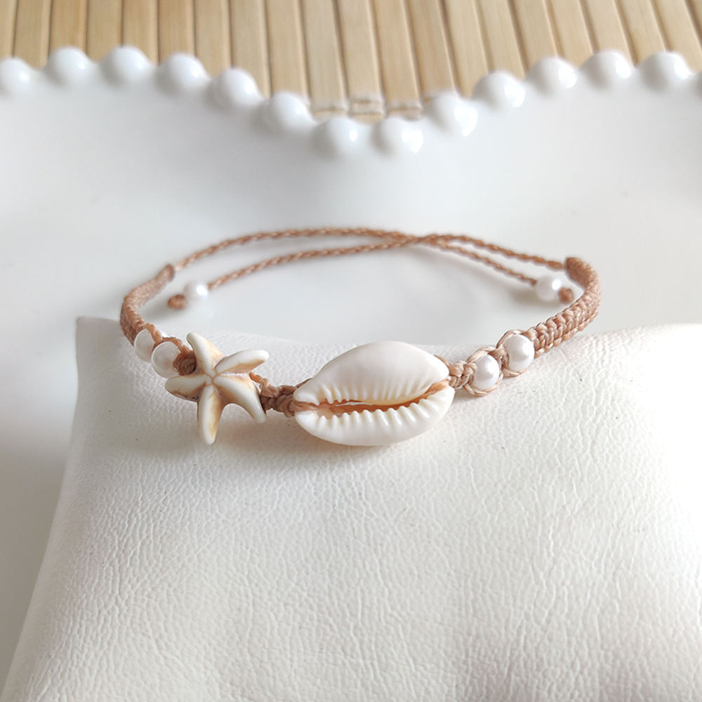 Tornozeleira praiana com búzio estrela e pérolas macramê artesanal feminino concha verão praia amarração