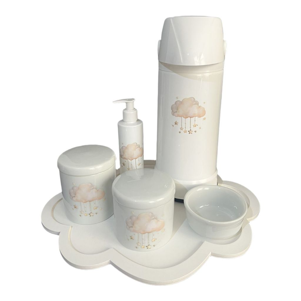 KIT HIGIENE PORCELANA BANDEJA NUVEM DESENHO NUVEM GARRAFA GRANDE COMPLETO