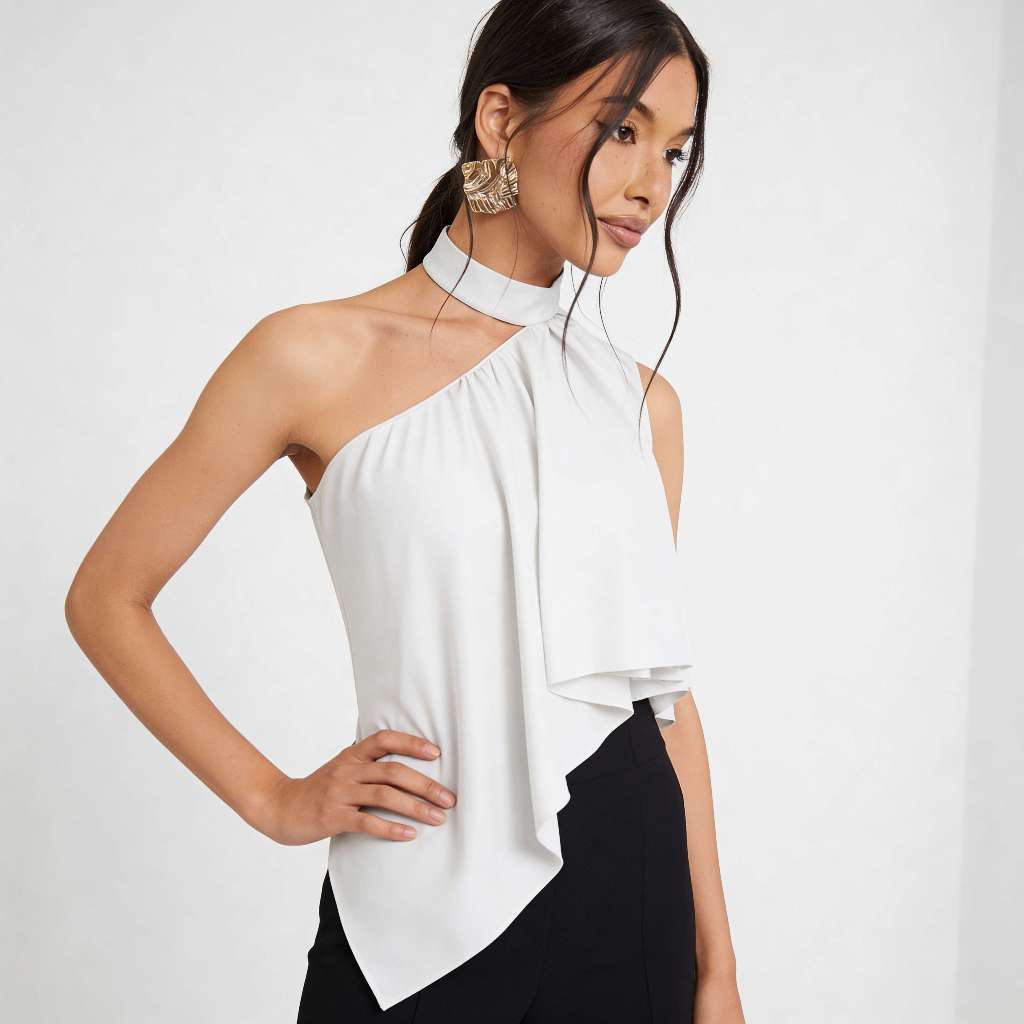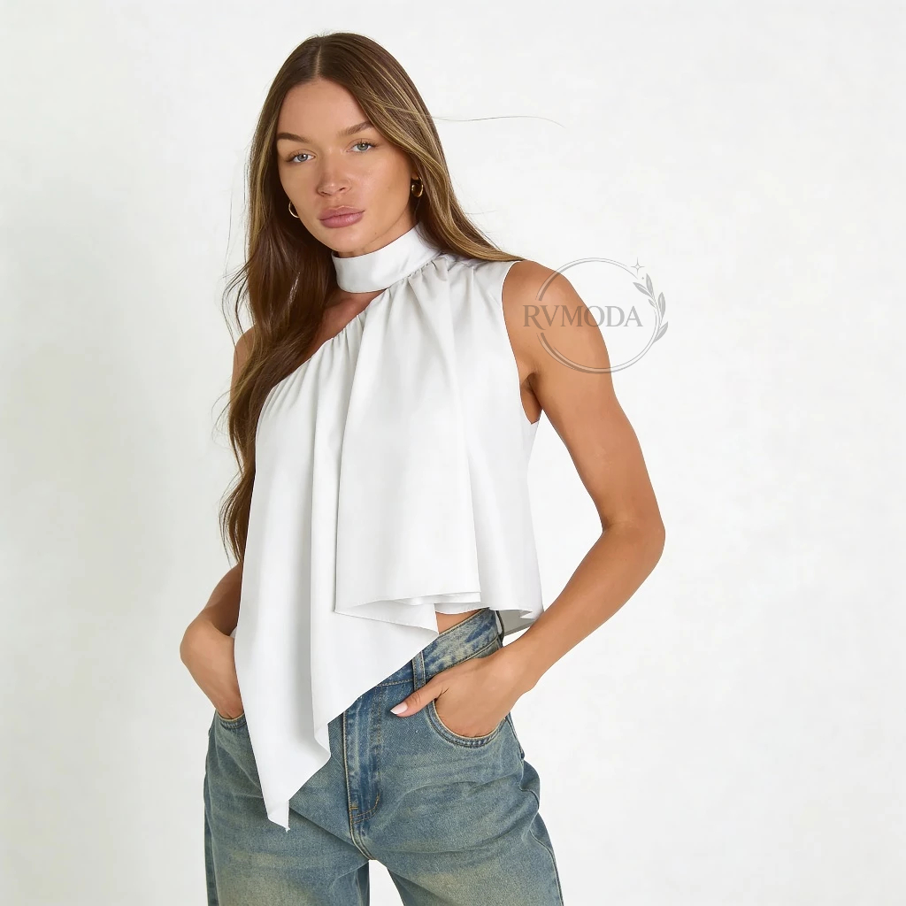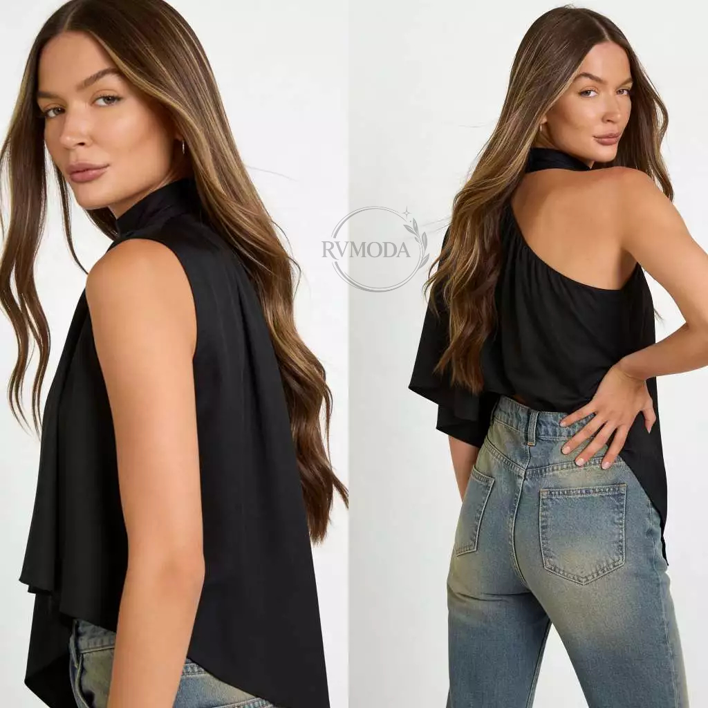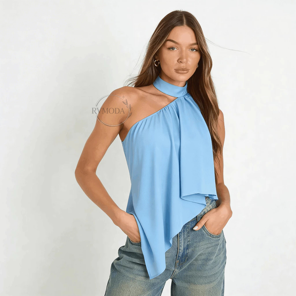 Blusa Feminina Frente Única Gola Alta Assimétrica Boho Chic Elegante Festa Tendência 2026
