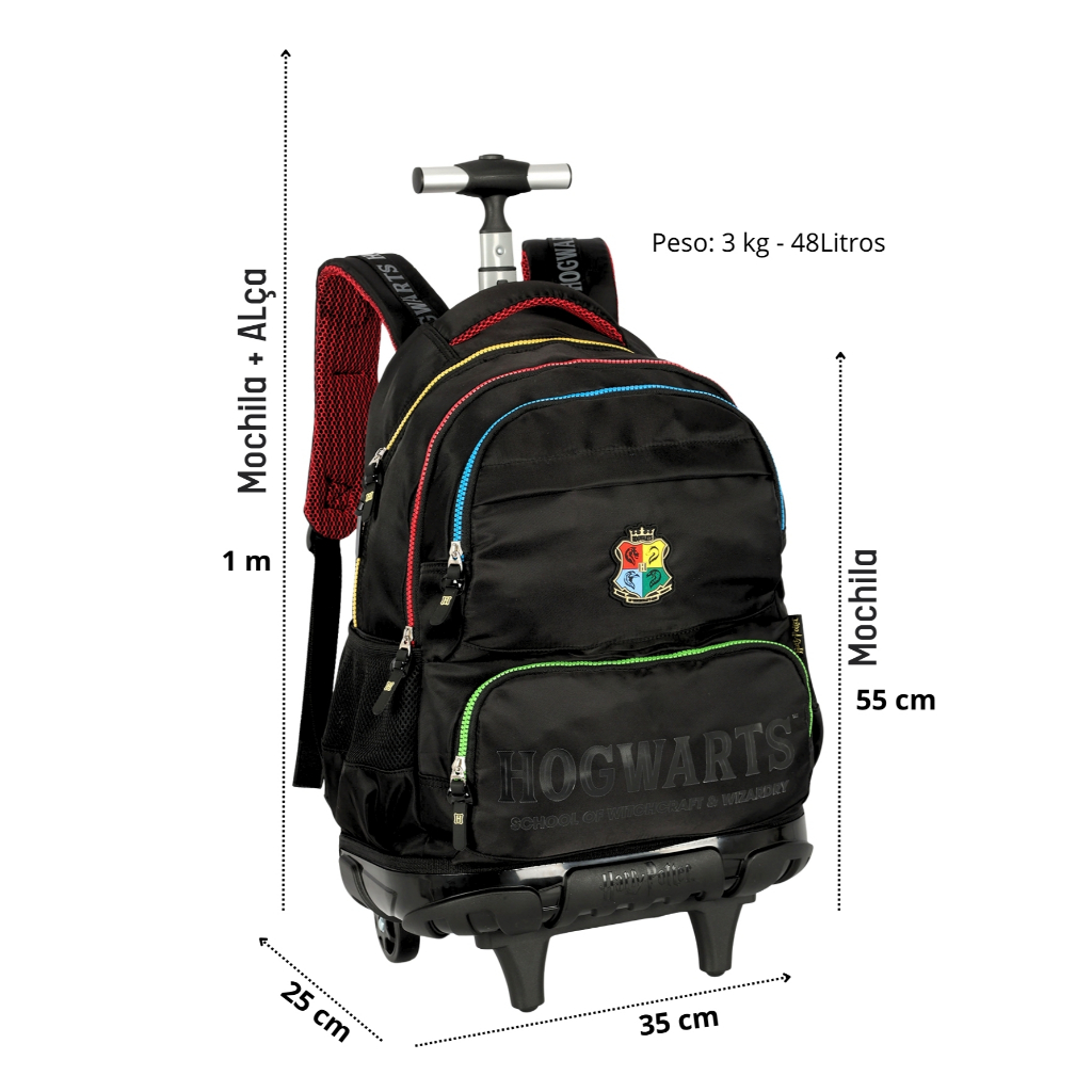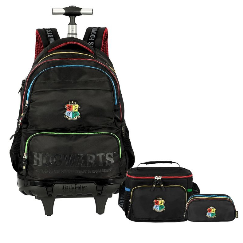 Kit Conjunto Escolar Preto Juvenil Harry Potter Hogwarts Mochila Rodinhas+ Lancheira + Estojo Triplo