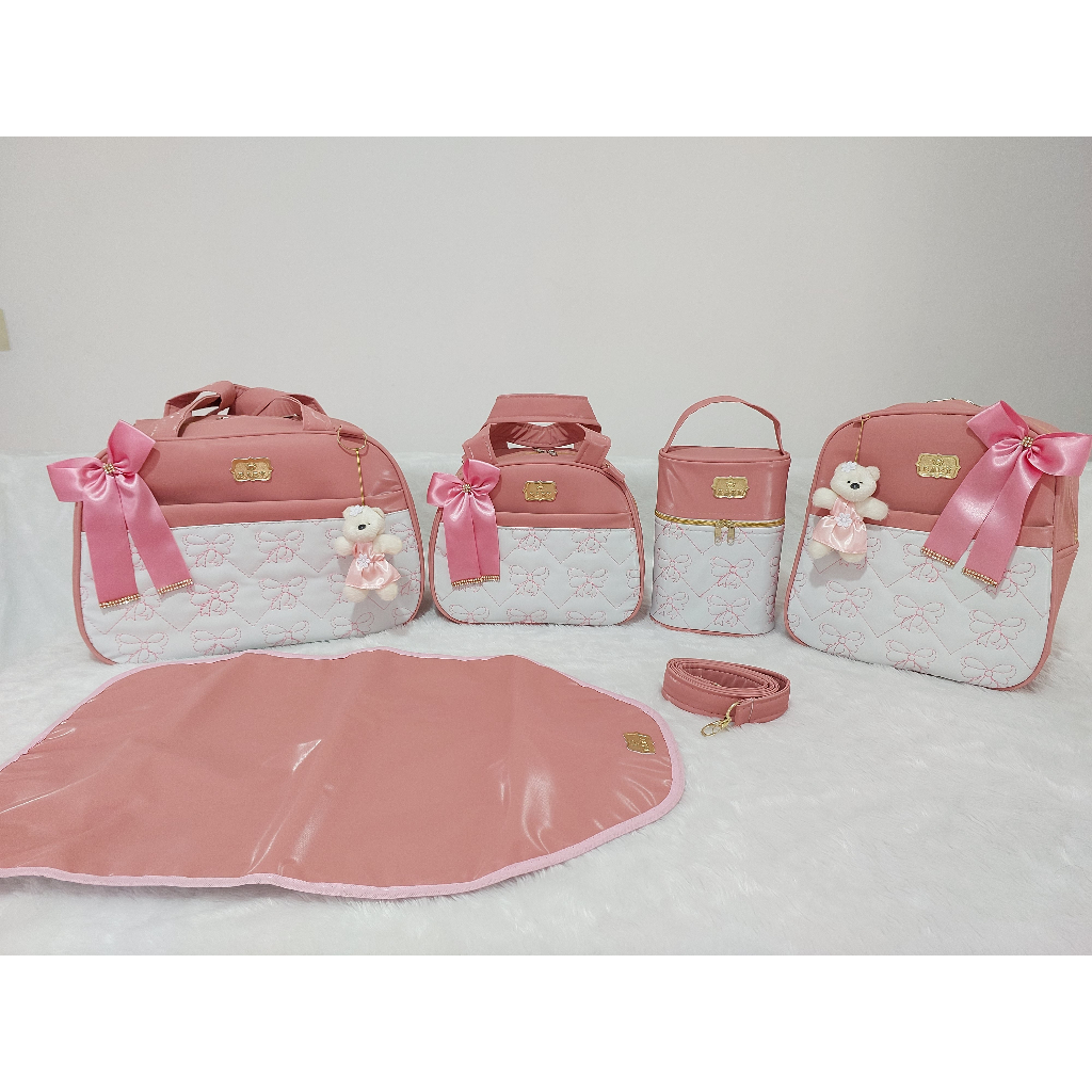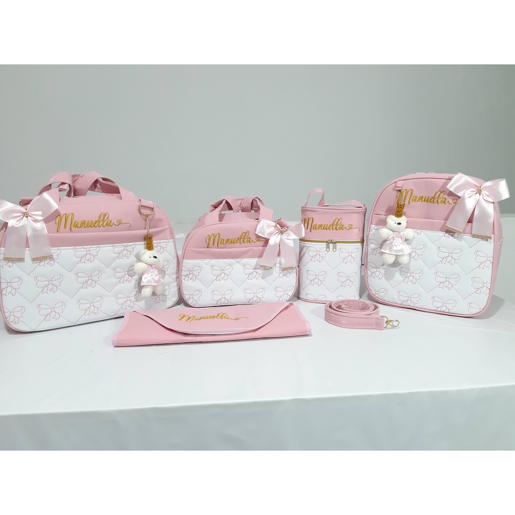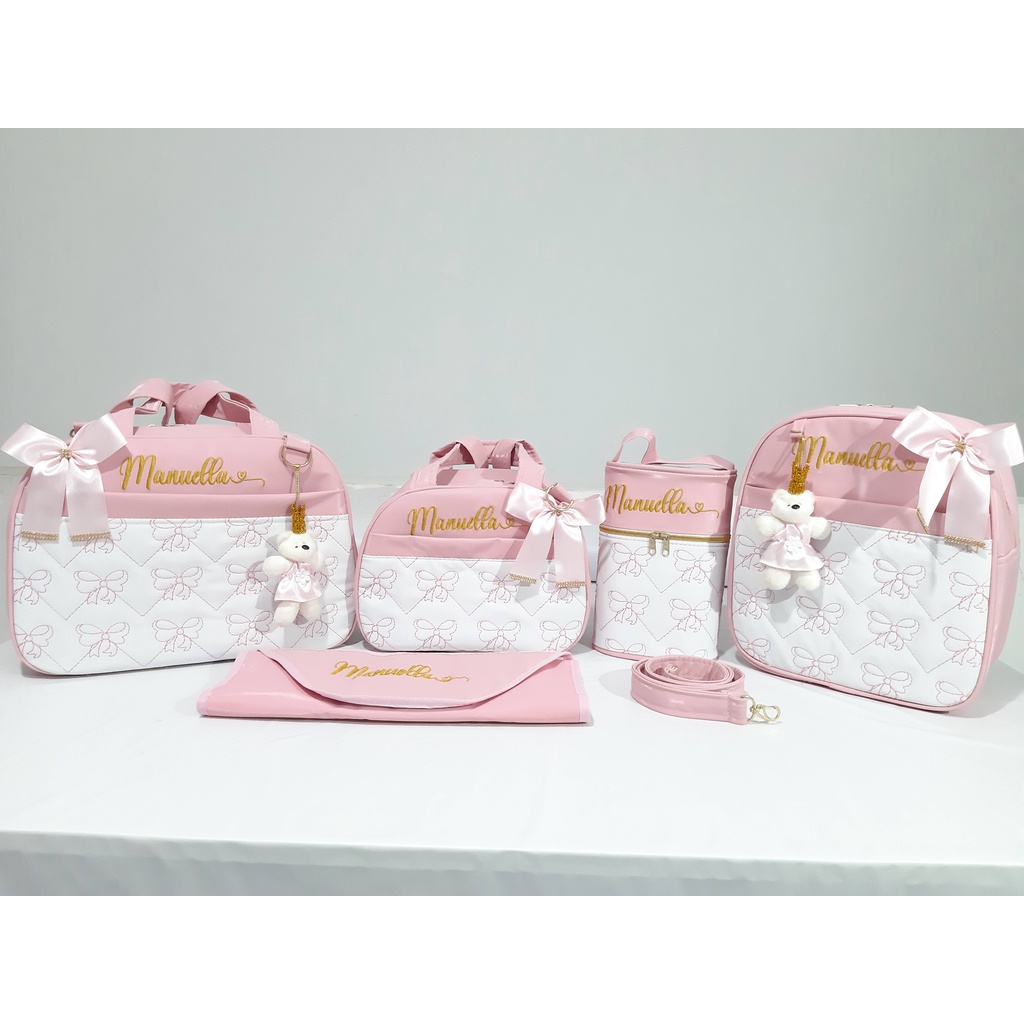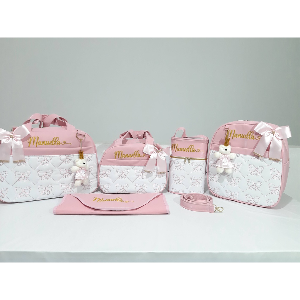 kit bolsas maternidade luxo laçinho 5 pç rosa personalizada