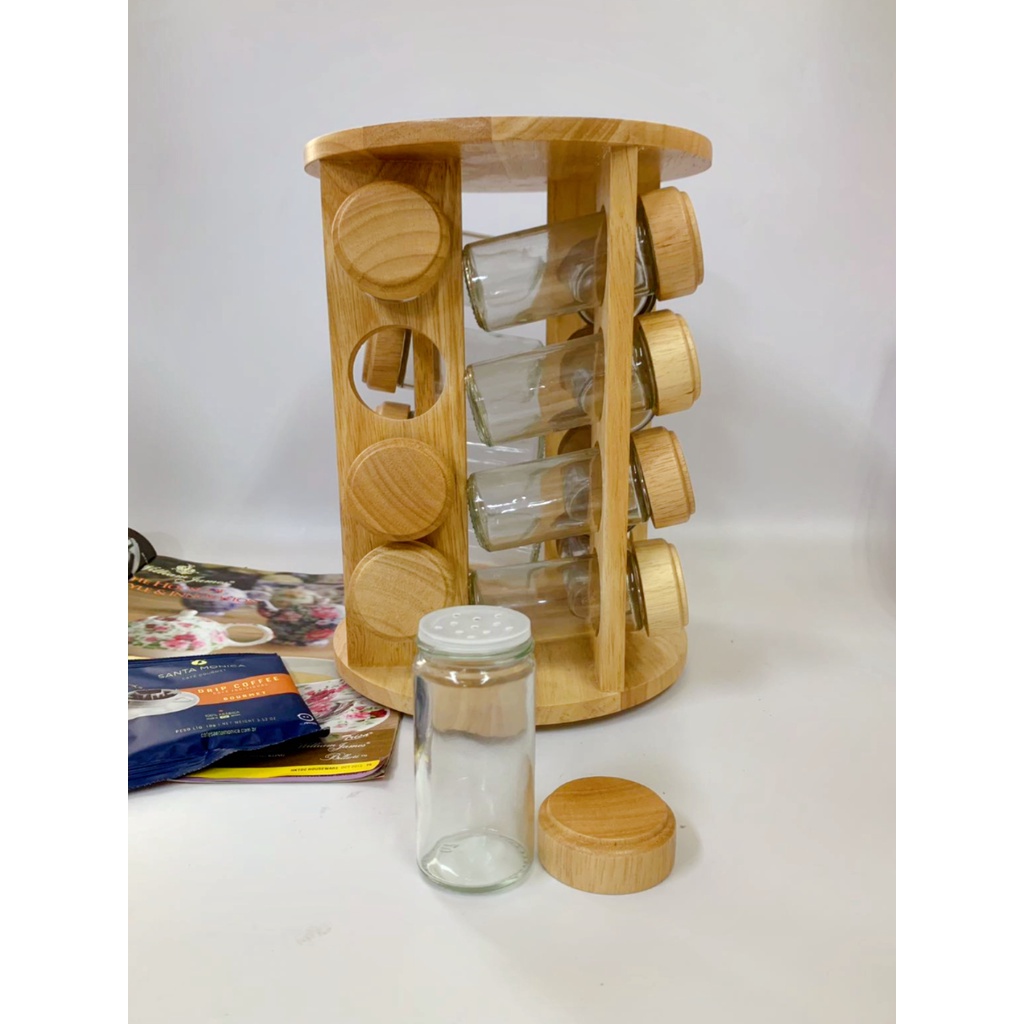 Porta Tempero Condimentos De Madeira Com Potes de Vidro Quantidade 16 Potes + Suporte Giratório