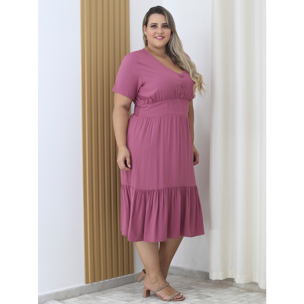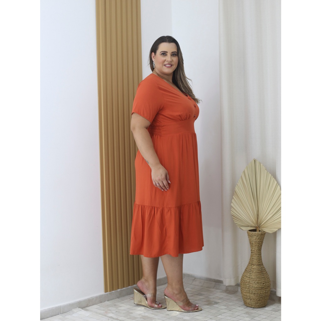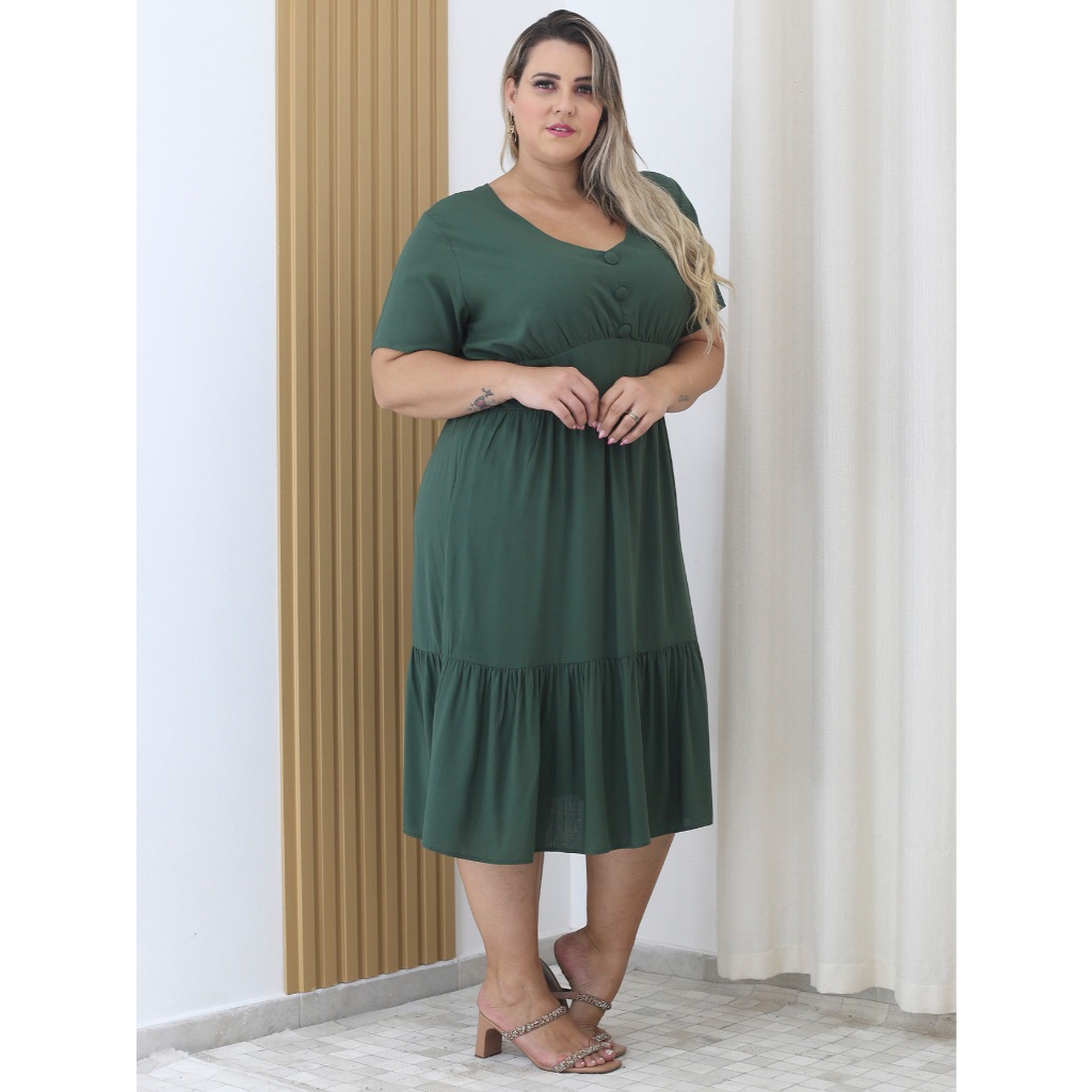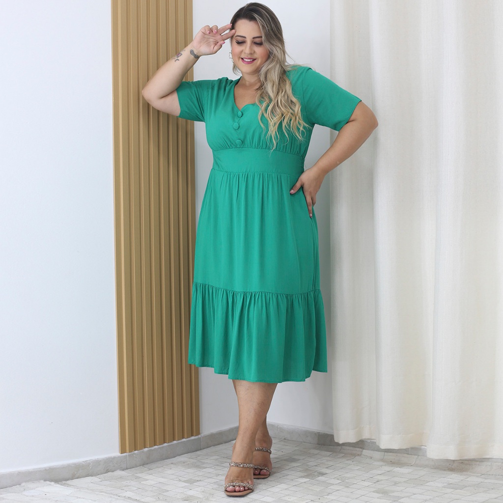 Vestido Viscolinho Midi Plus Size Com Botão Decote V