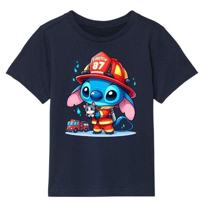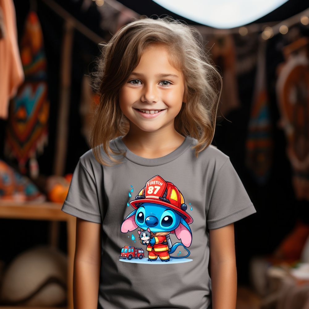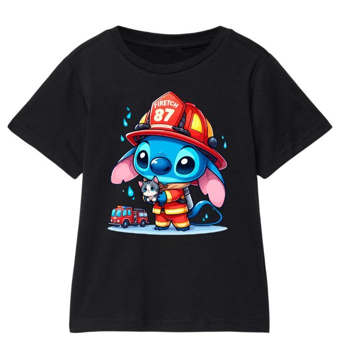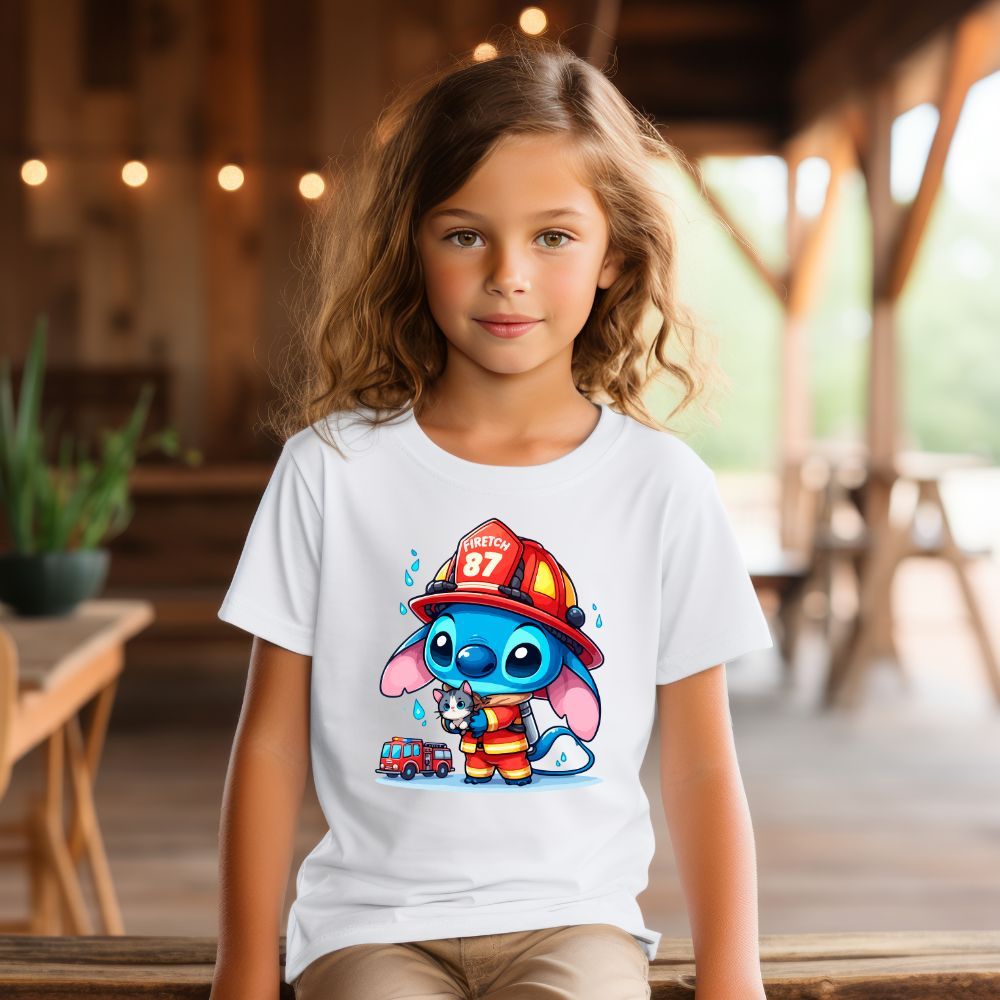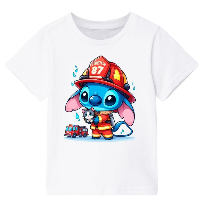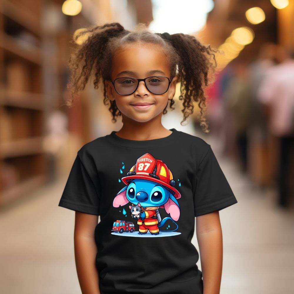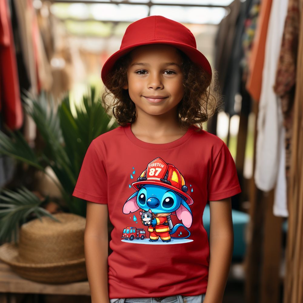 Camiseta Infantil Bombeiro Lilo Stitch Fantasia Blusa Algodão Criança Meninas