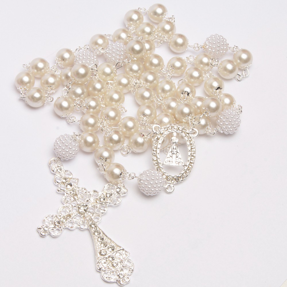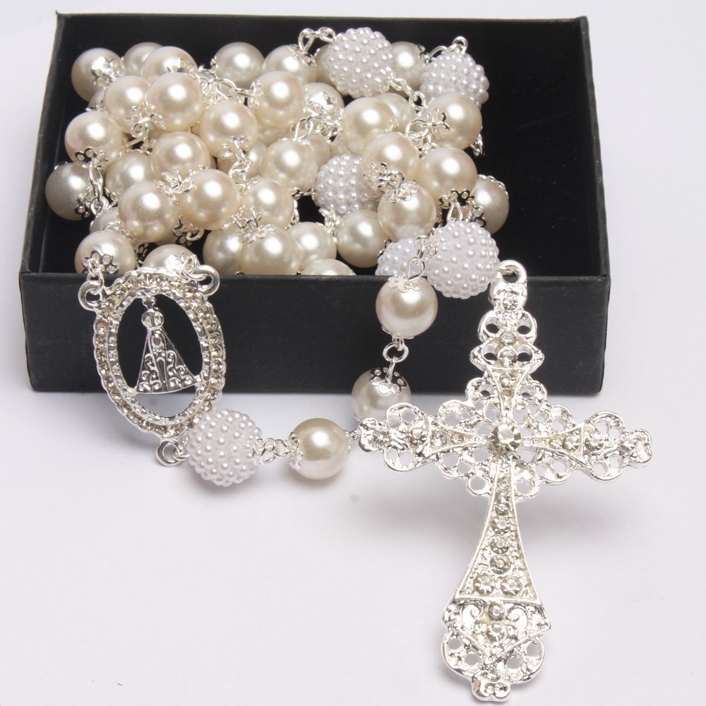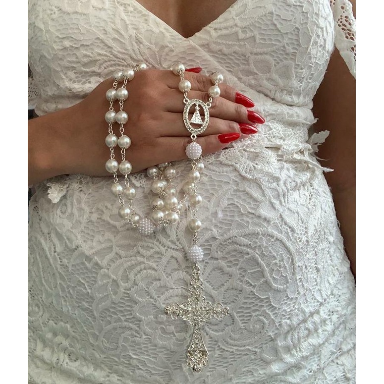 Terço De Noiva Folheado A Prata Perolas Brancas Aparecida