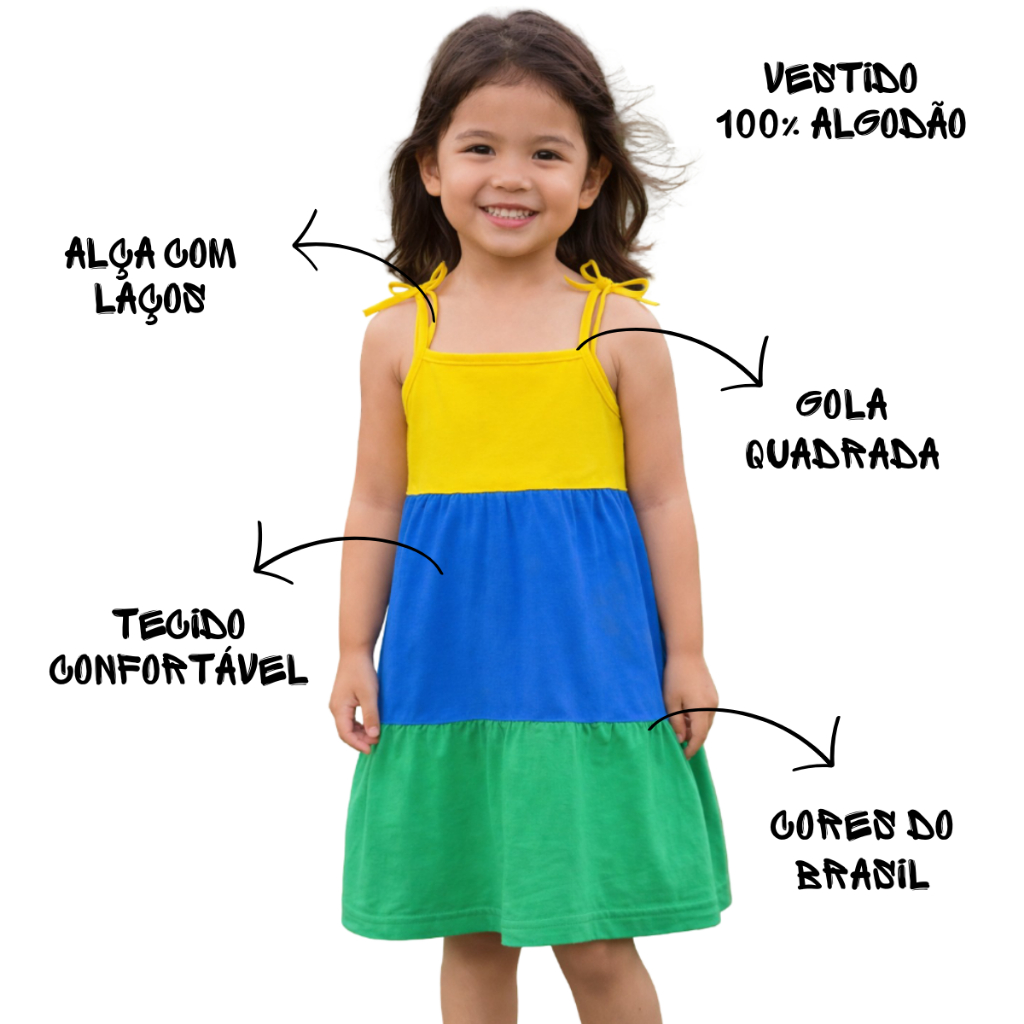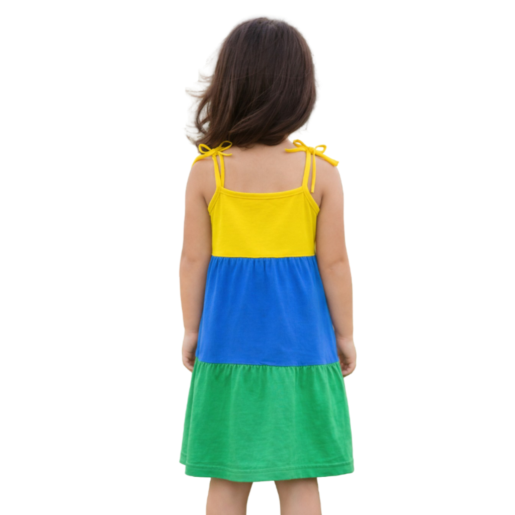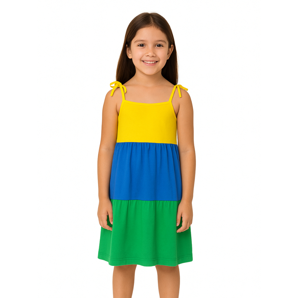 Vestido Infantil Alças com Laço Tricolor Amarelo Azul Verde