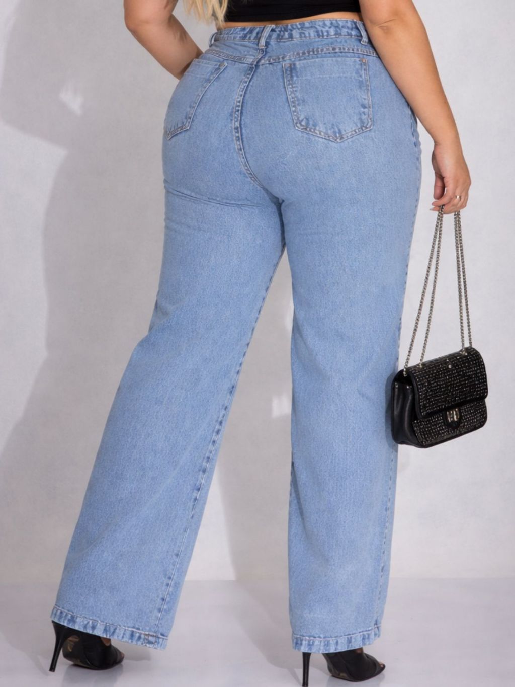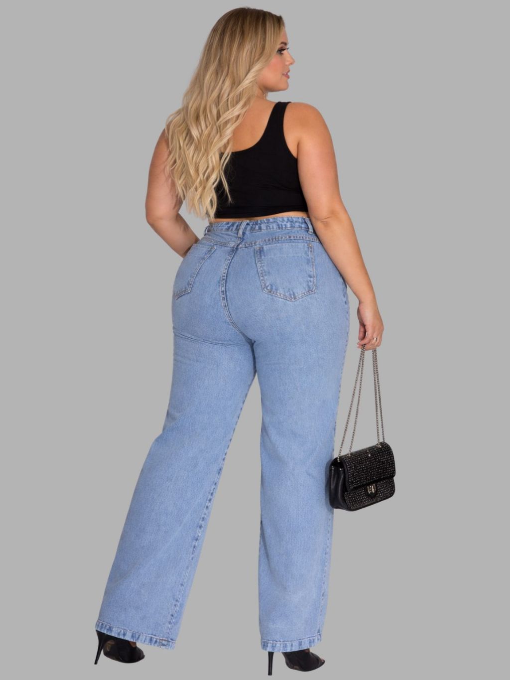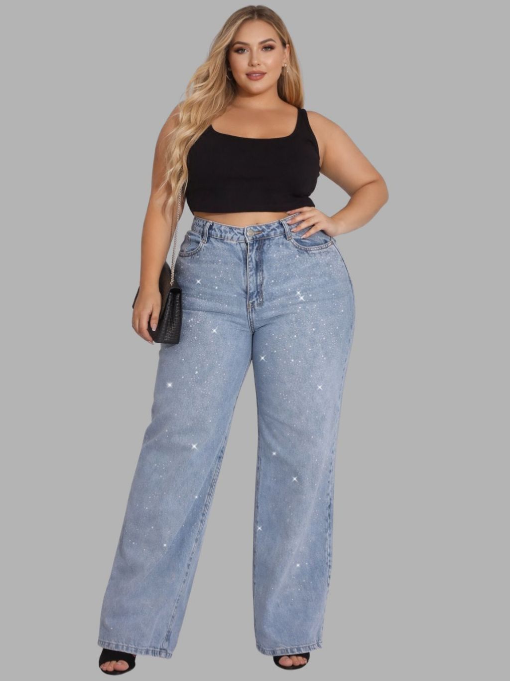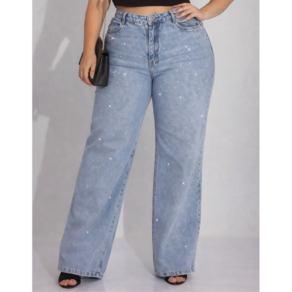 Calça Jeans Feminina Plus Size Wide Leg Com Brilinhos Strass
