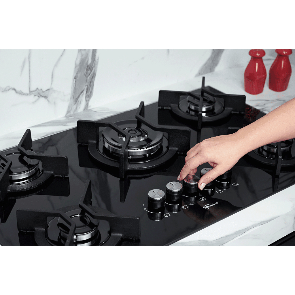 Fogao Cooktop Fischer 5 Bocas Infinity a Gas Mesa de Vidro Preto Acendimento Automatico Alta Potencia