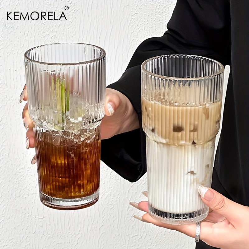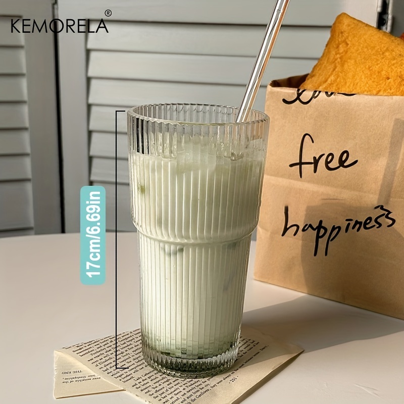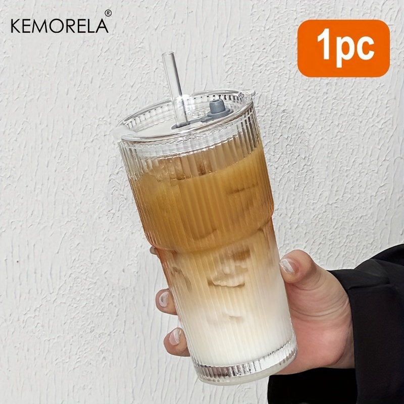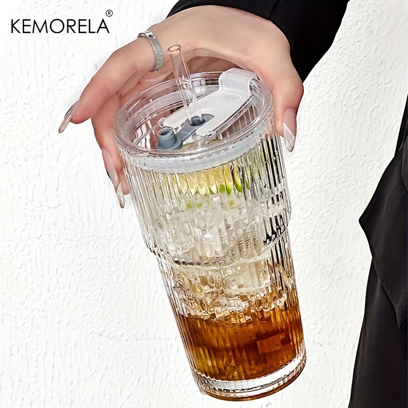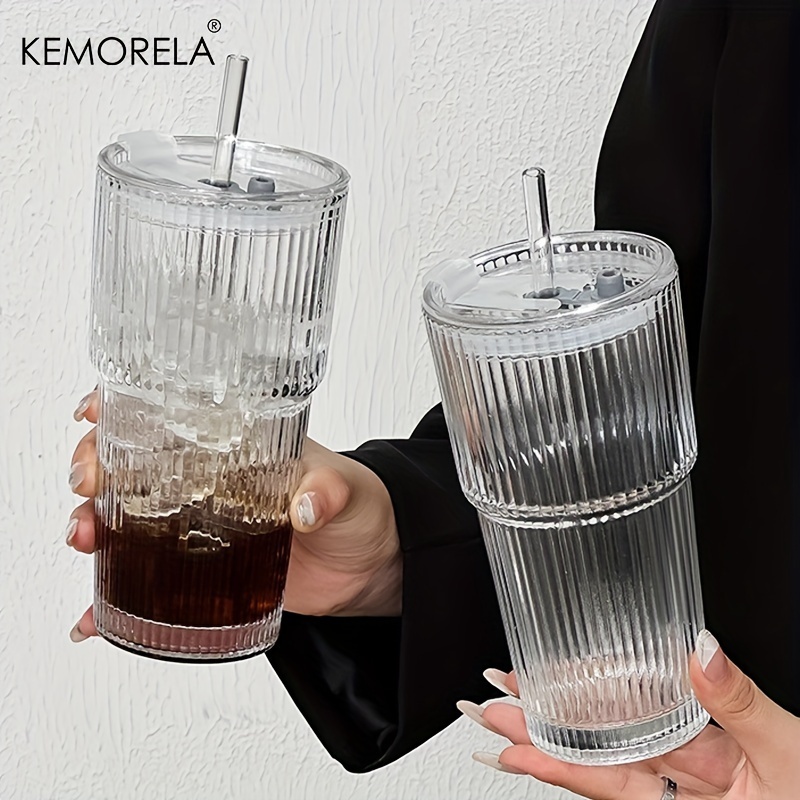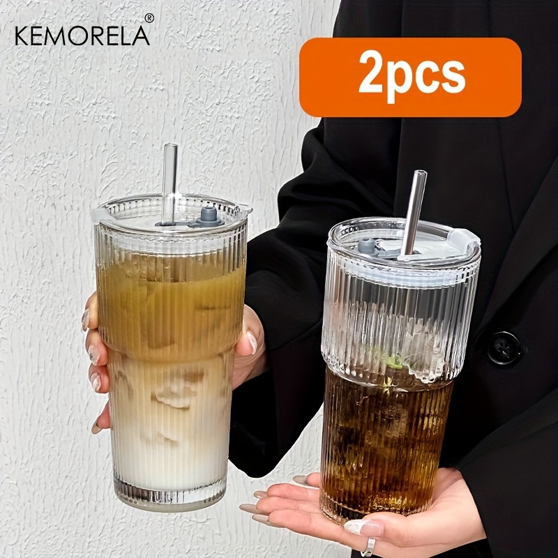 Copo De Vidro Listrado Vertical INS 1/2 Unidades Com Tampa E Canudo-Ótimo Para Café Gelado , Suco , Chá Leite-Adequado Água Ao Ar Livre , Escolar