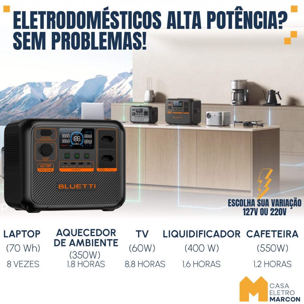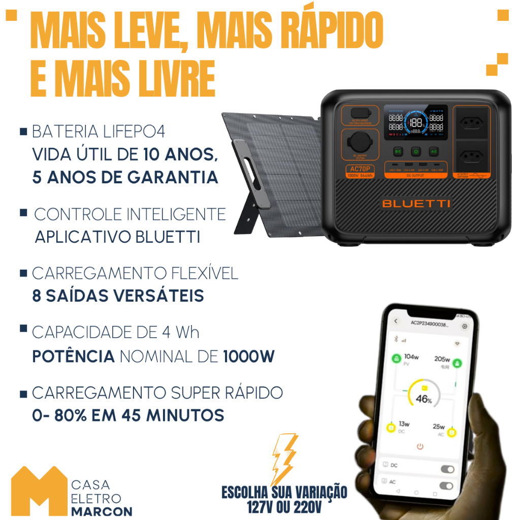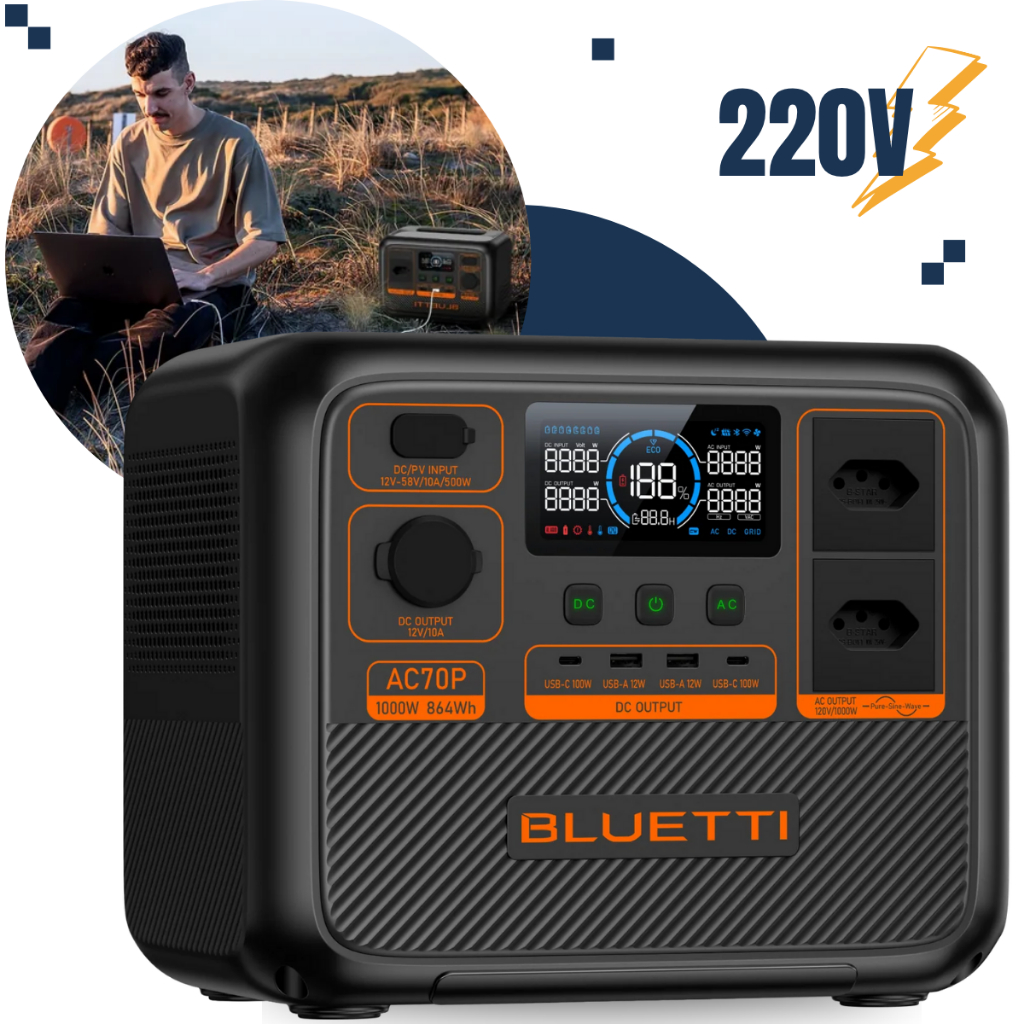 Estação Energia Solar Portátil Bluetti AC70P Gerador 1000 W / 864 Wh / 110V/220V