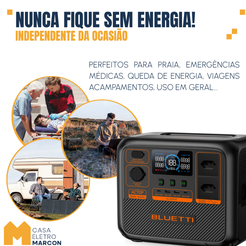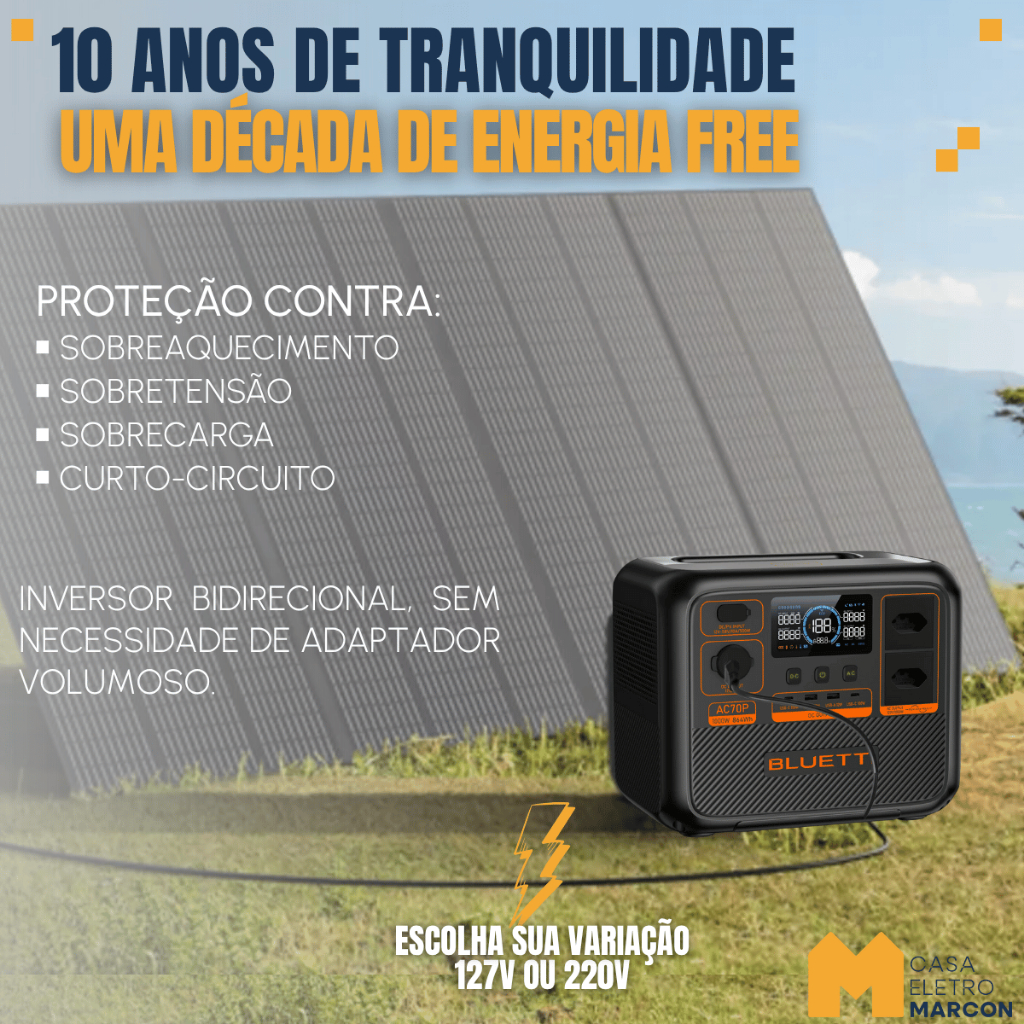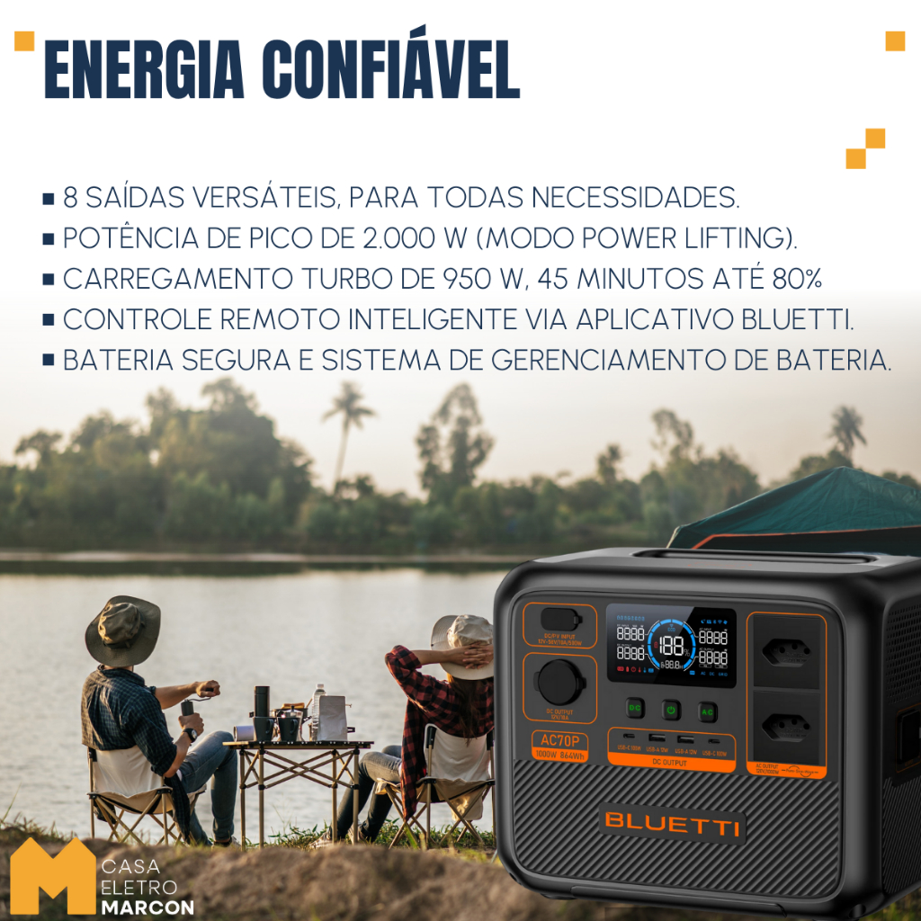 Estação Energia Solar Portátil Bluetti AC70P Gerador 1000 W / 864 Wh / 110V/220V