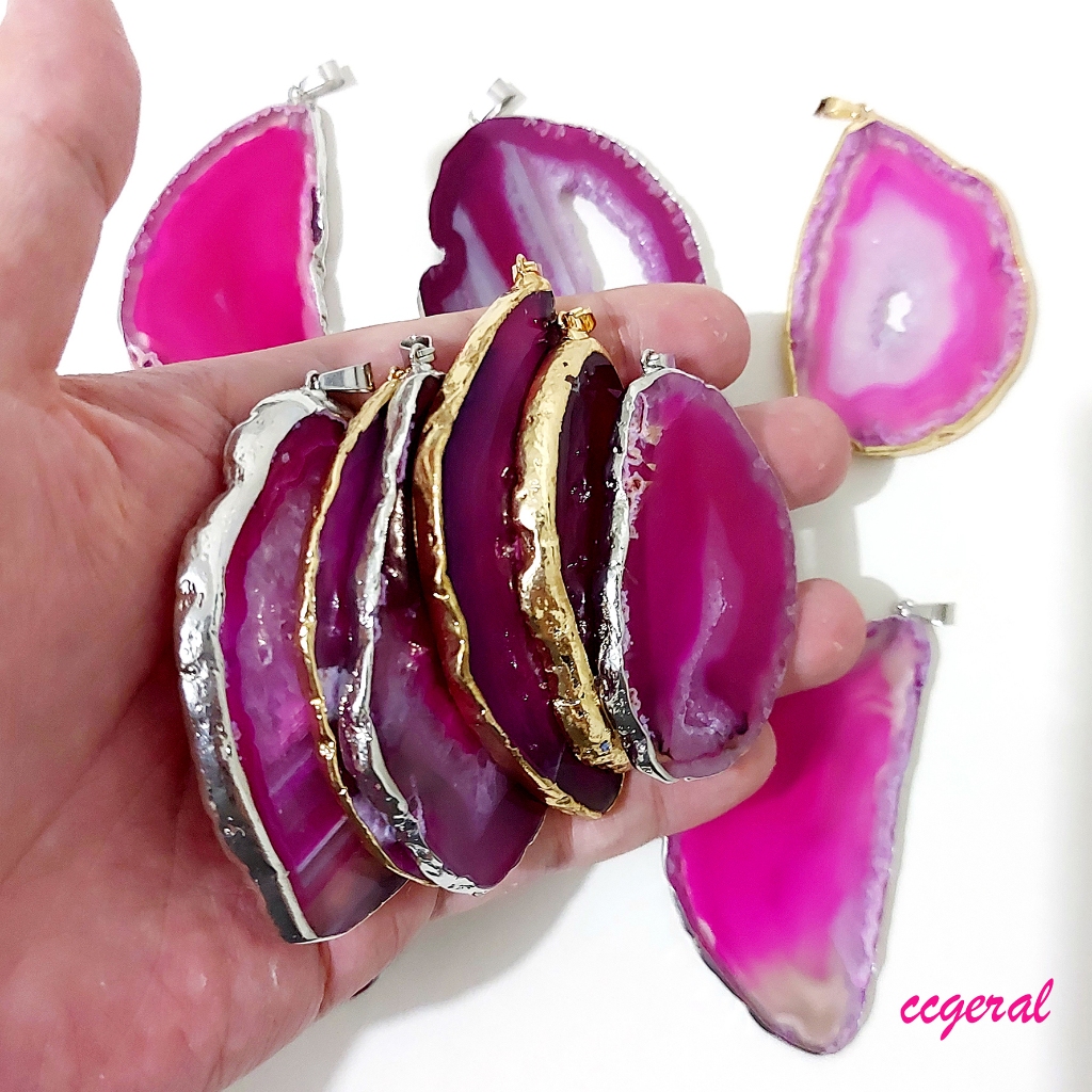 Pingente Pedra Chapa de Ágata Rosa Dourada e Prateada Energética