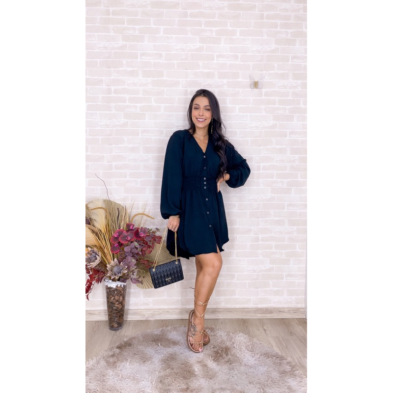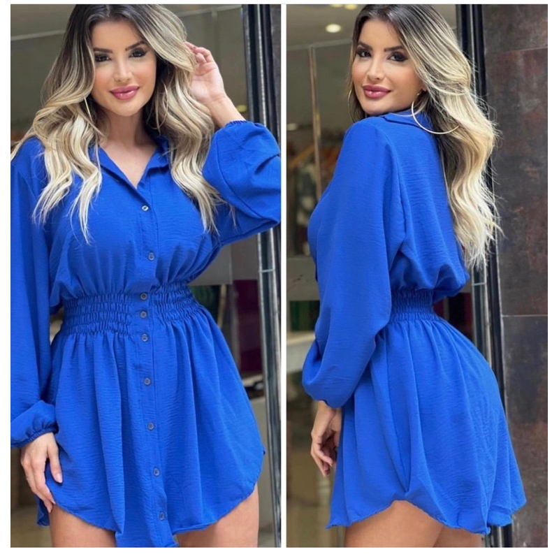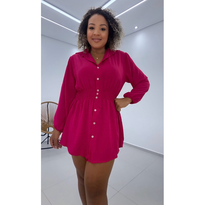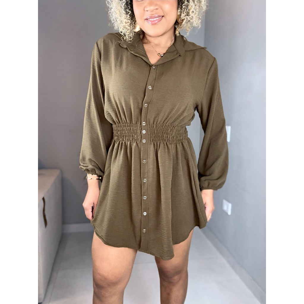 Chamise Manga Longa de Botões Lastex na Cintura, Vestido Feminino.