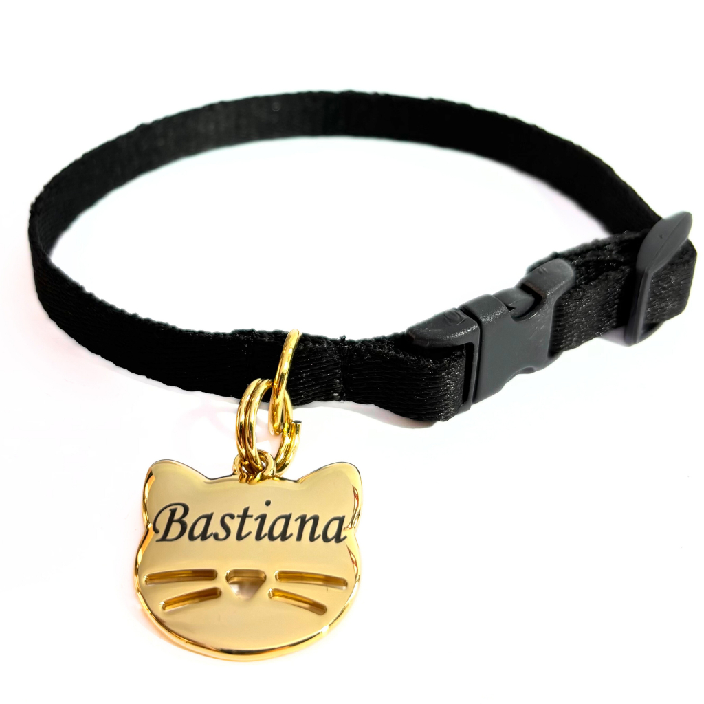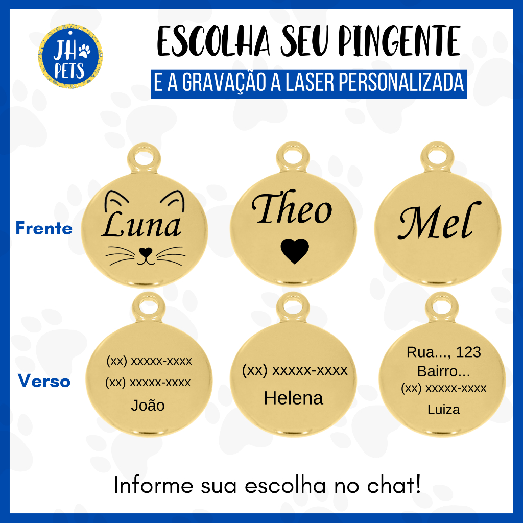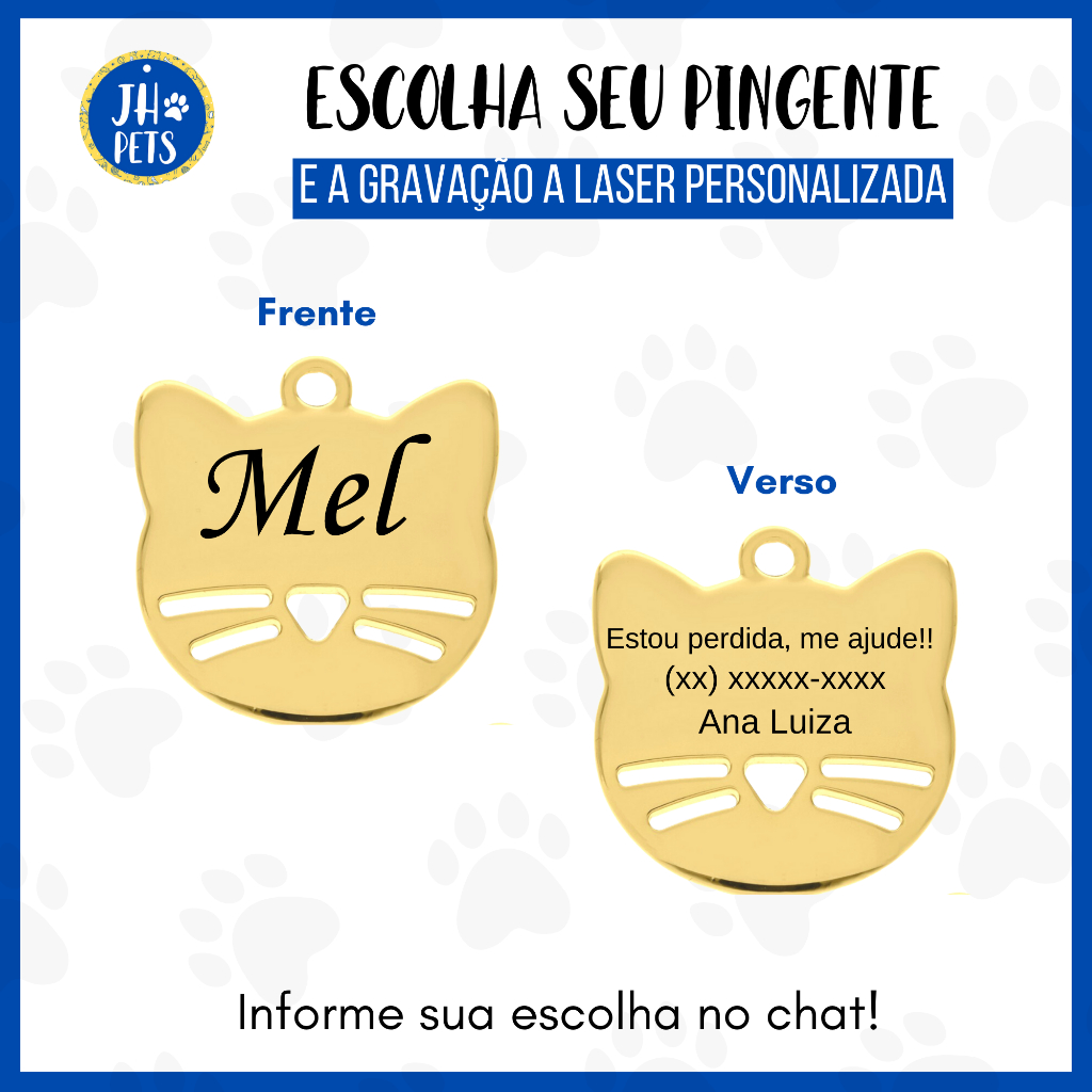 Coleira para gato de luxo dourado com nome gravado e telefone
