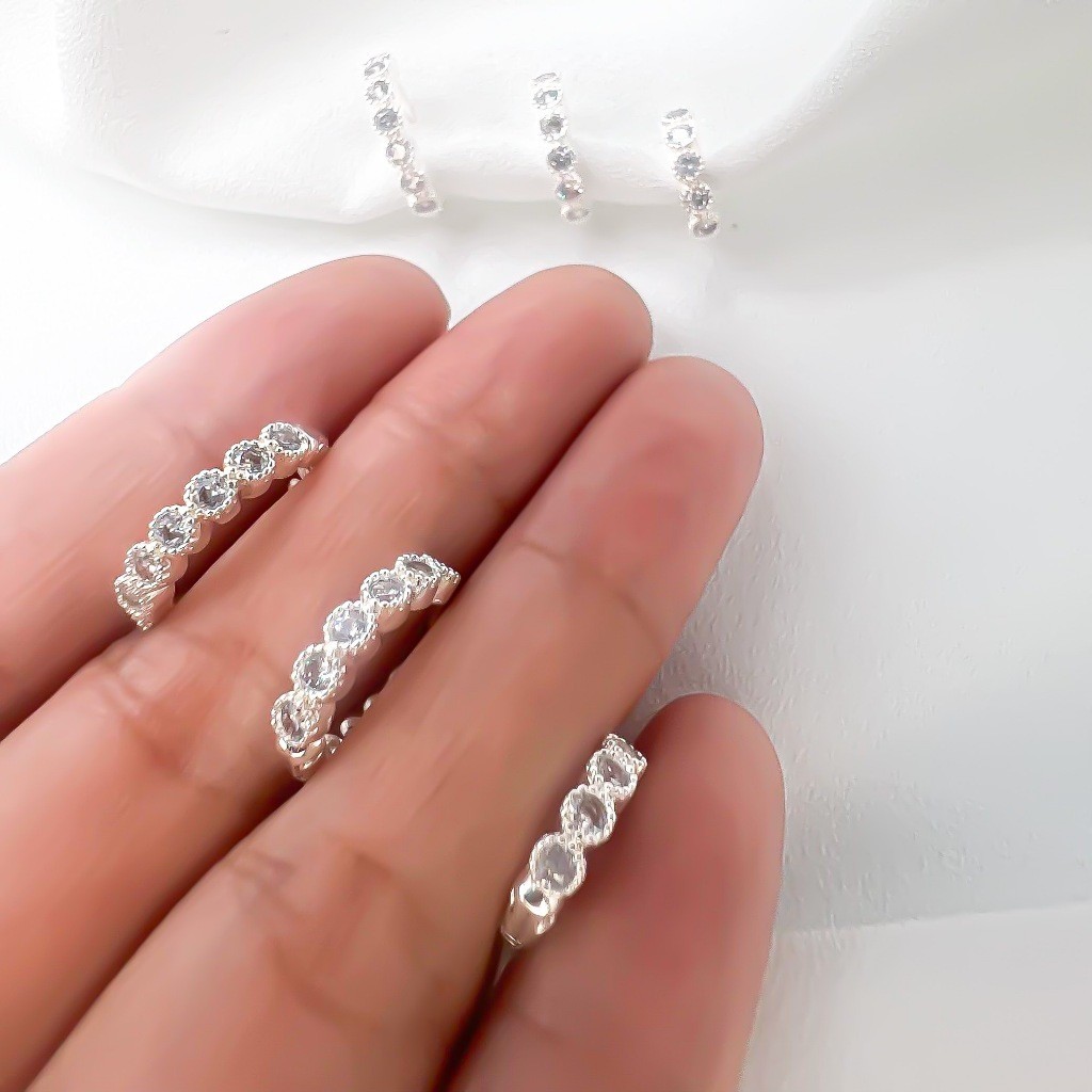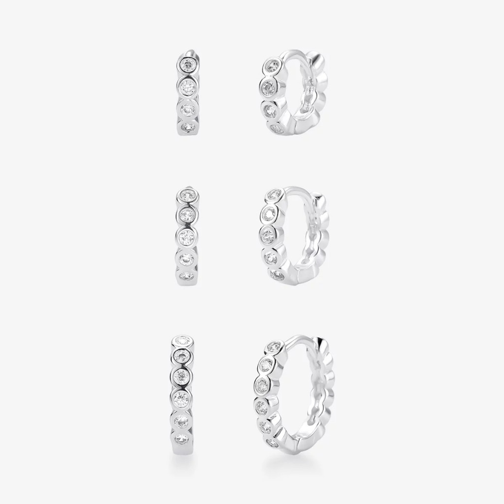 Trio de Brincos Argolas Laterais Arredondadas Cravejada Pedra de Zirconia de Prata 925