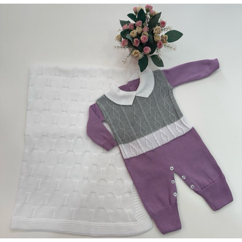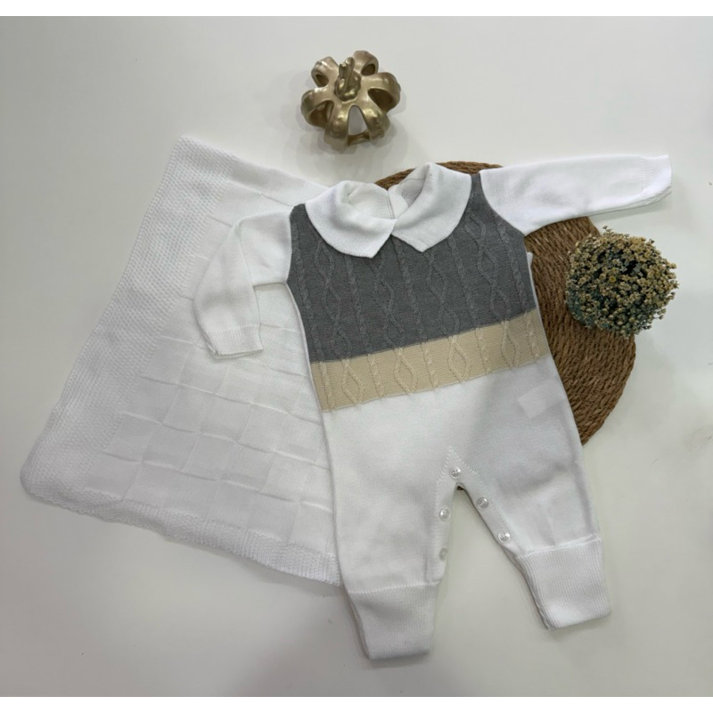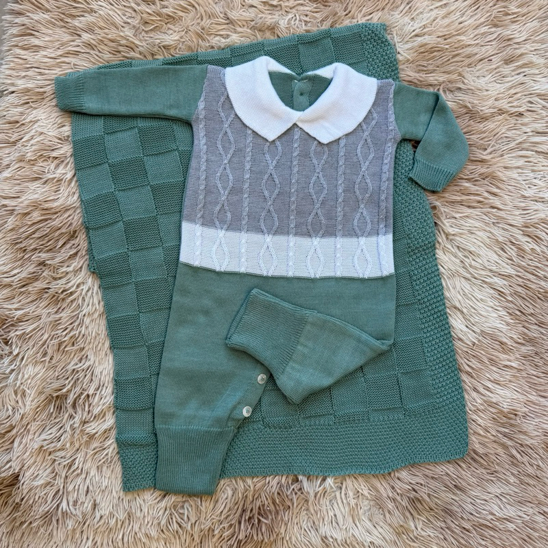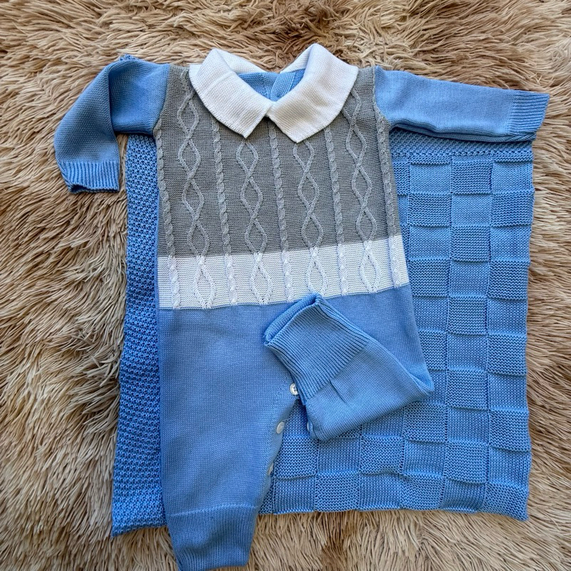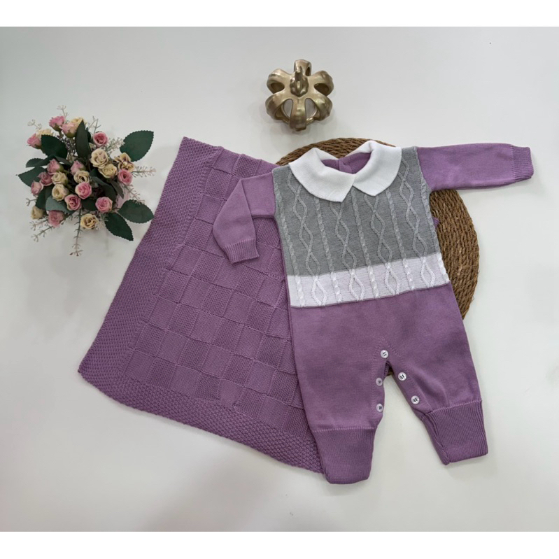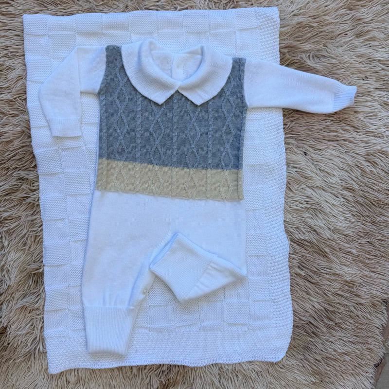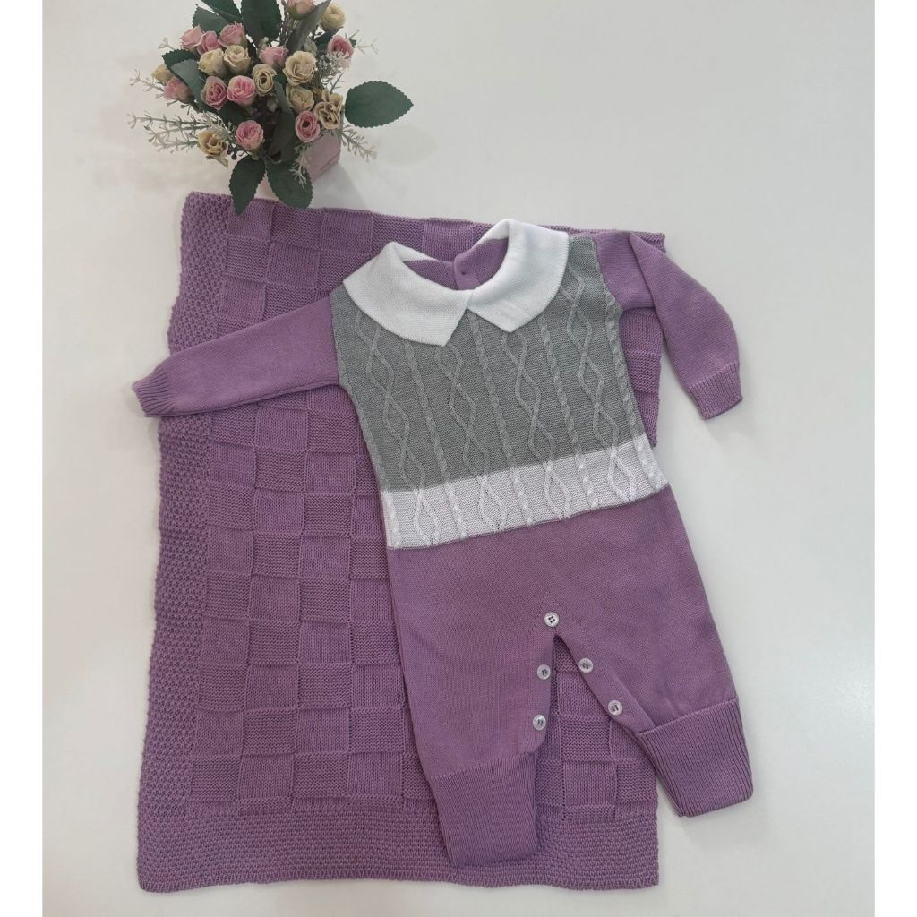 Kit Saída Maternidade Tricô Manta+Macacão P/ Bebê Menina e Menino