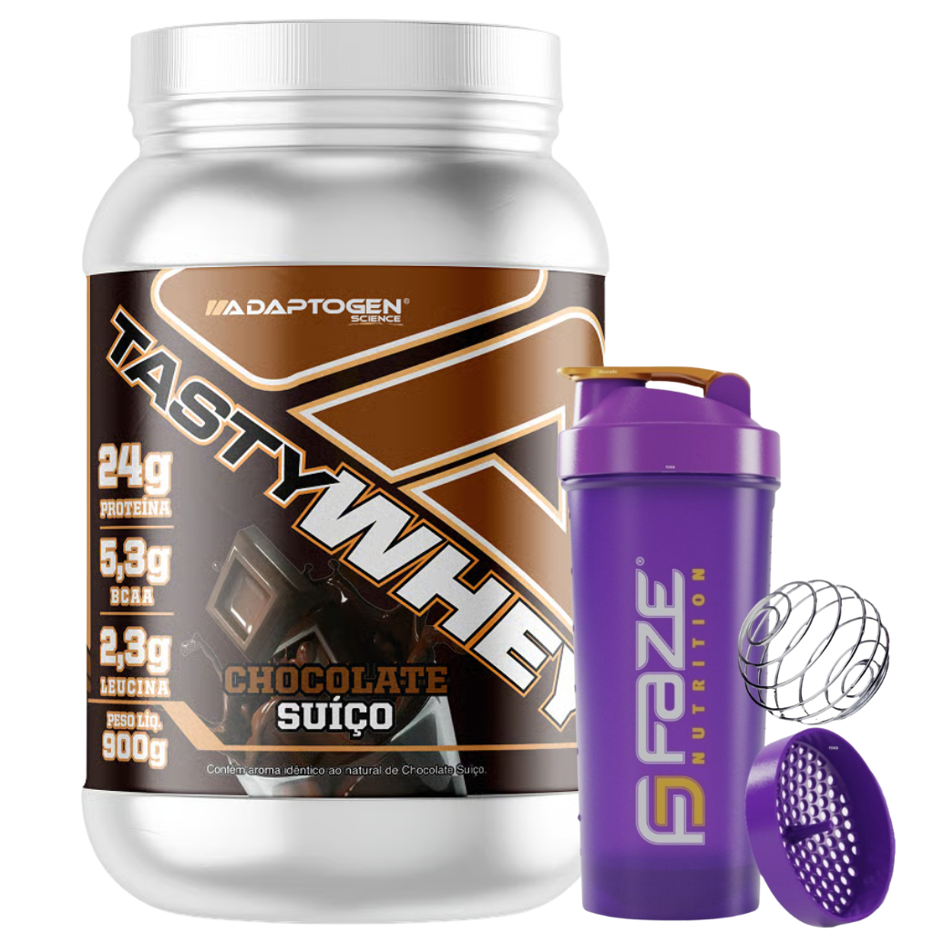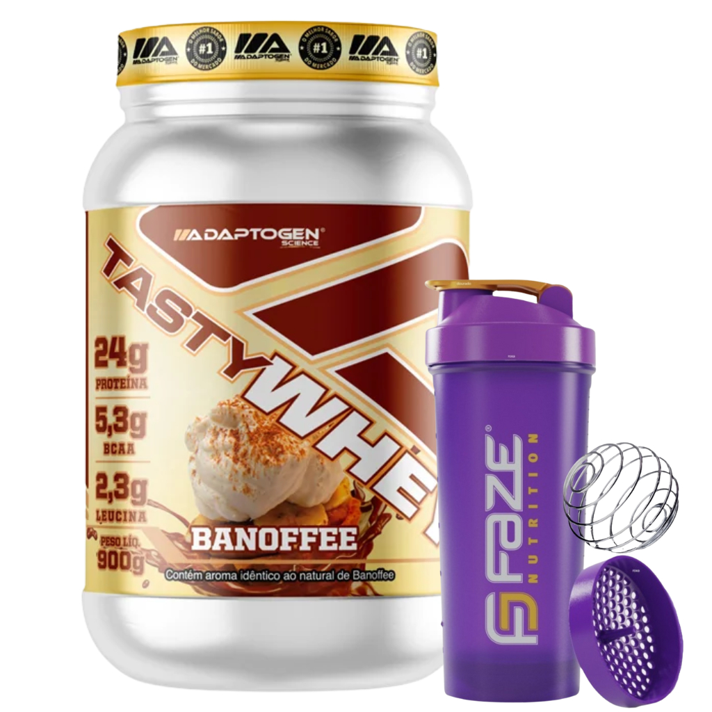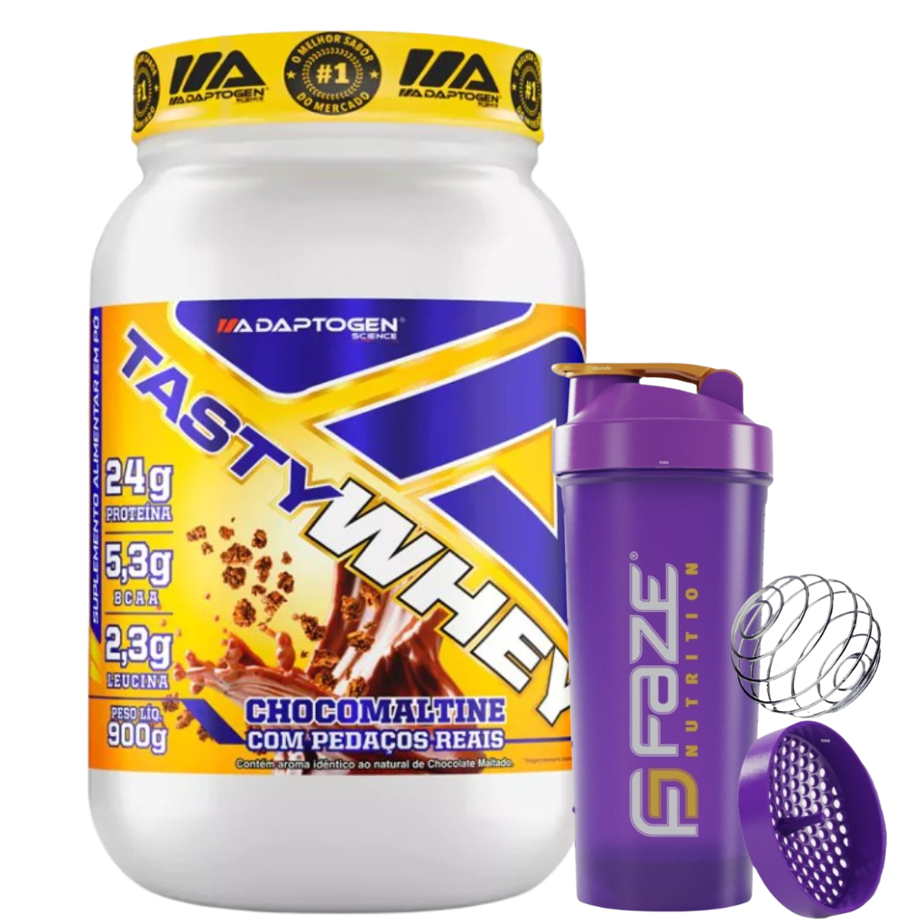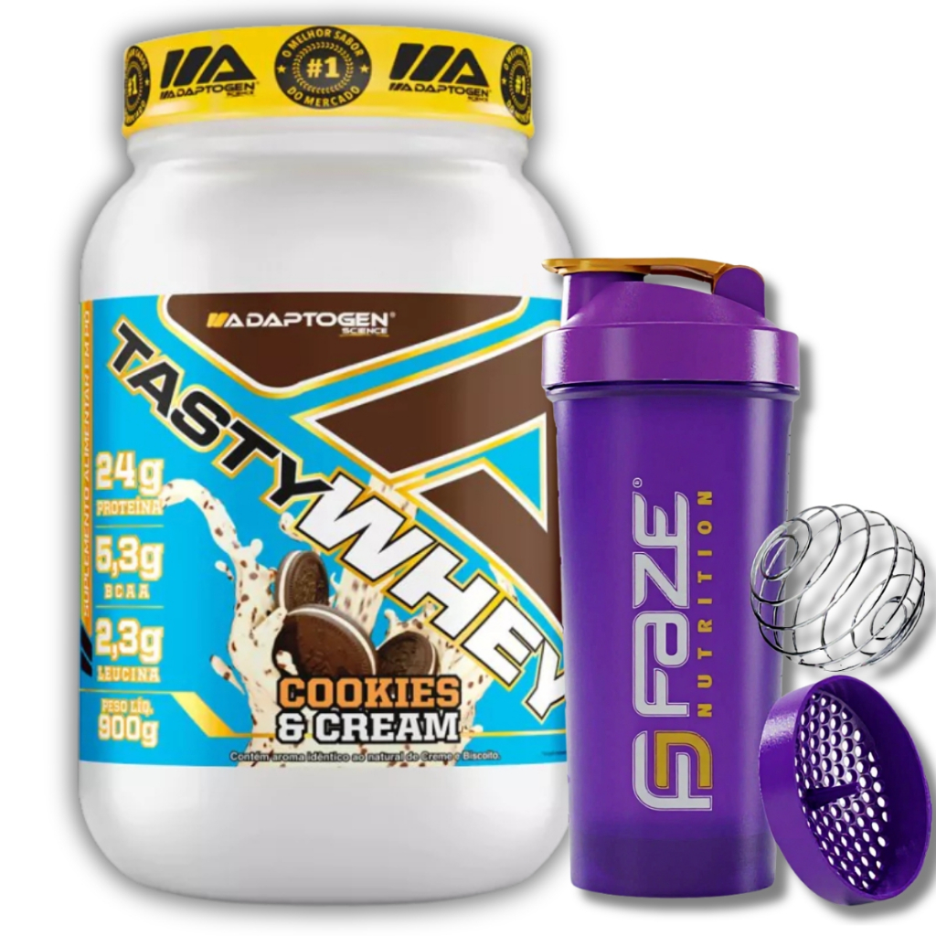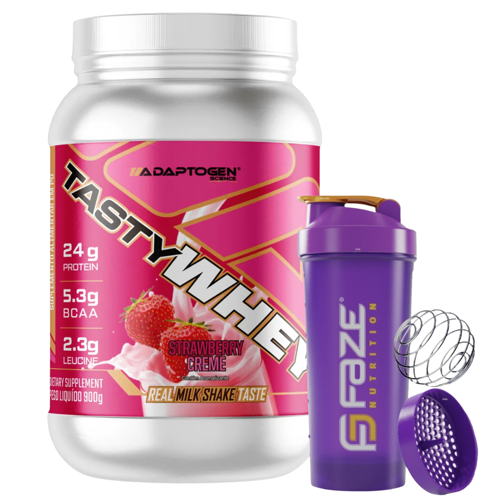 Kit Tasty Whey Protein 900g Adaptogen Proteína Isolada Concentrada Hidrolisada + Coqueteleira