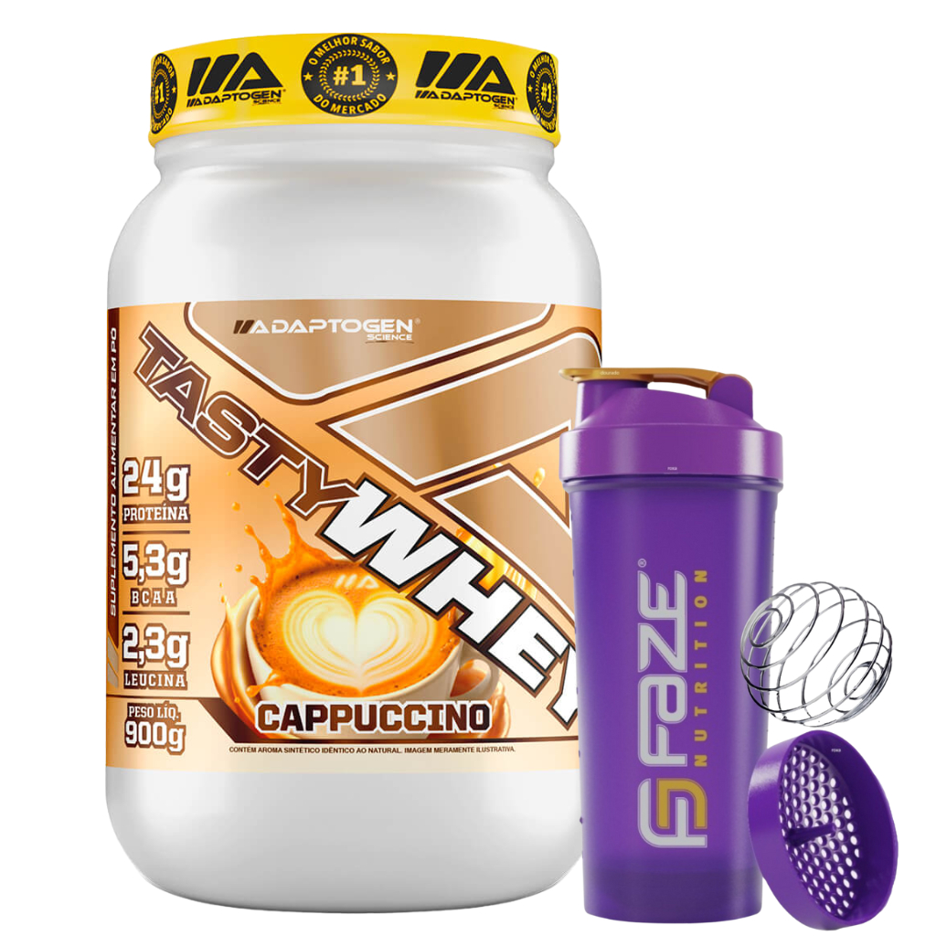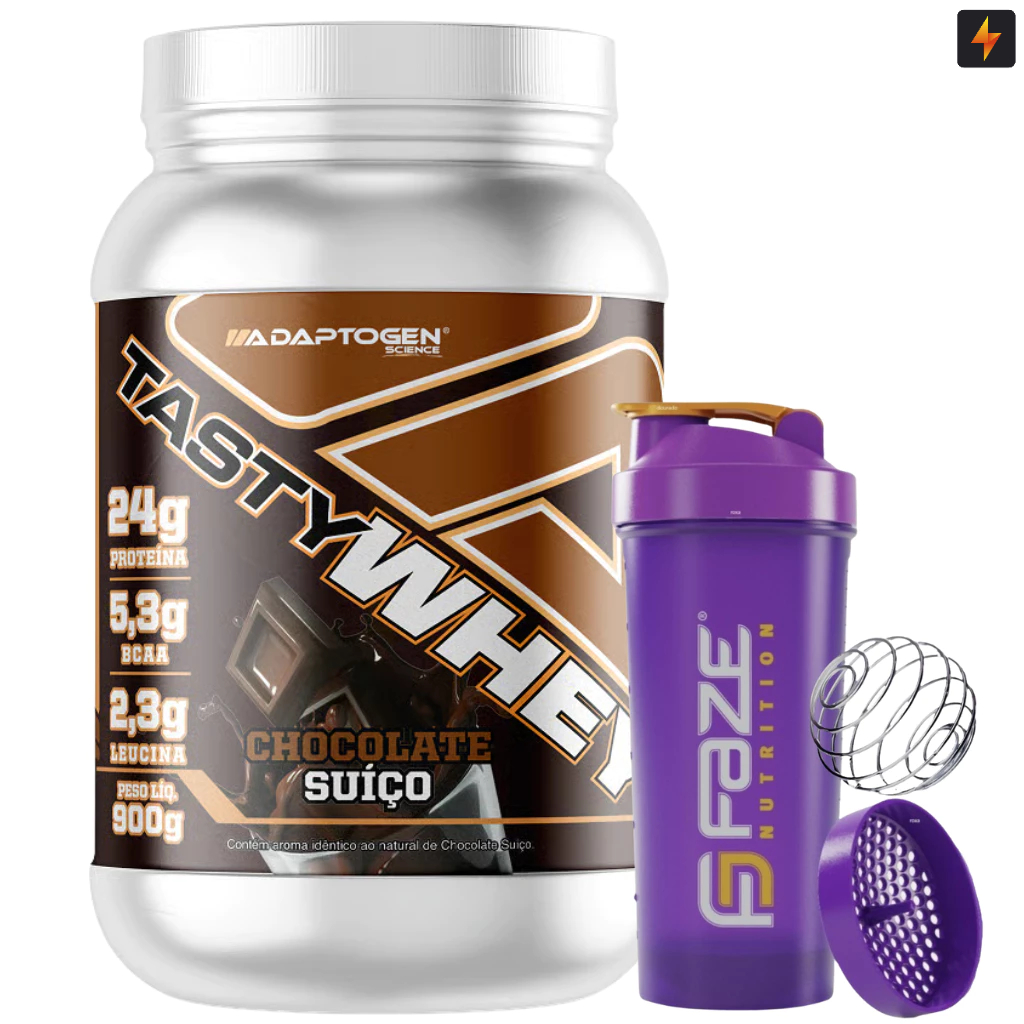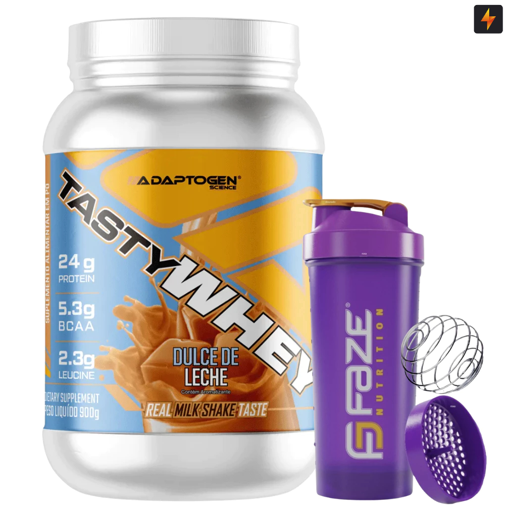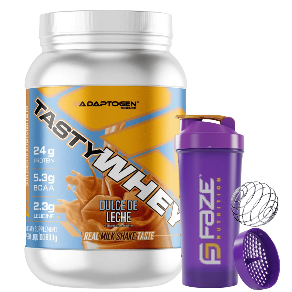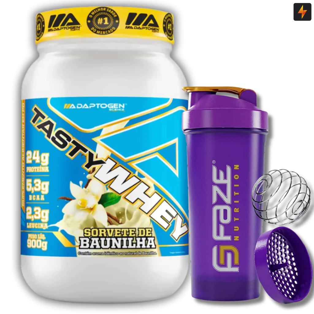 Kit Tasty Whey Protein 900g Adaptogen Proteína Isolada Concentrada Hidrolisada + Coqueteleira