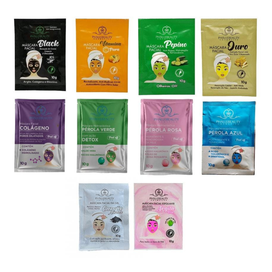 Kit 10 Máscaras Faciais Sachê PhálleBeauty