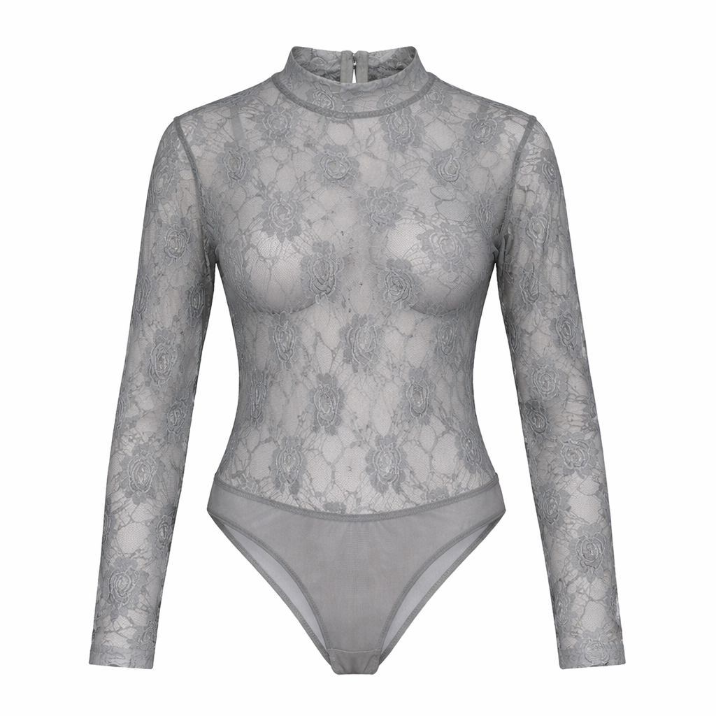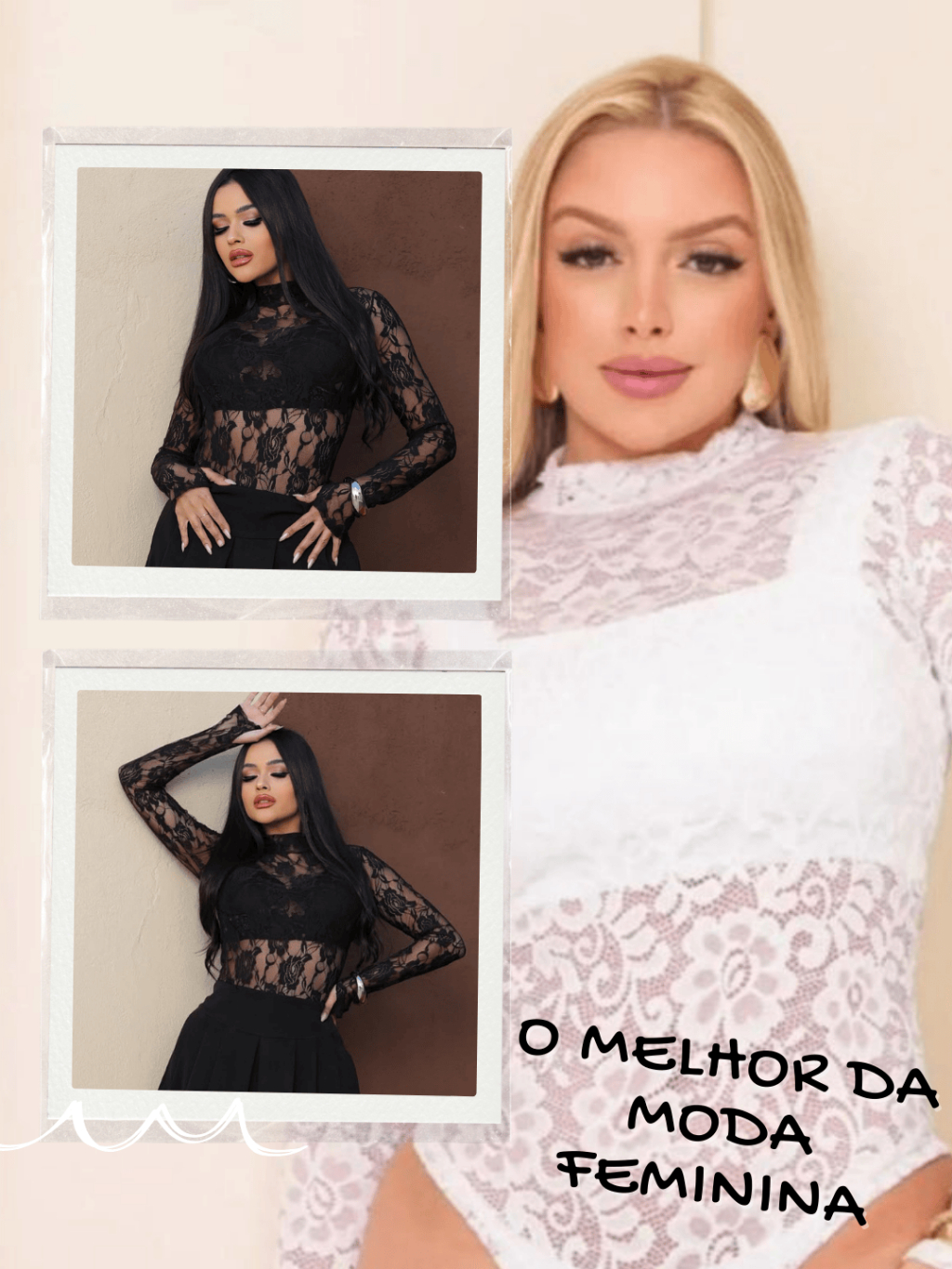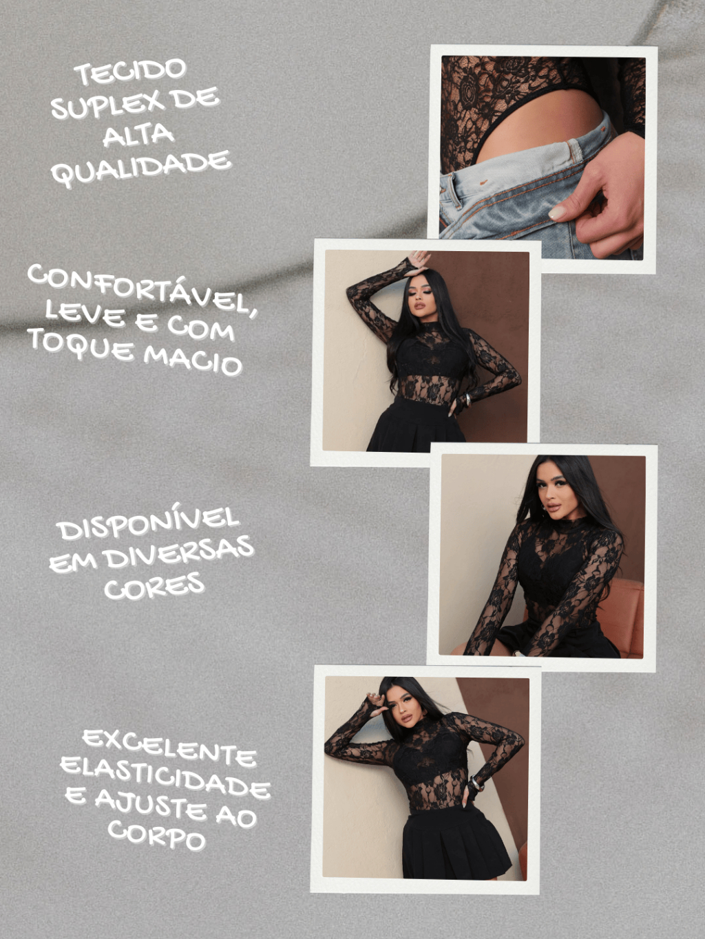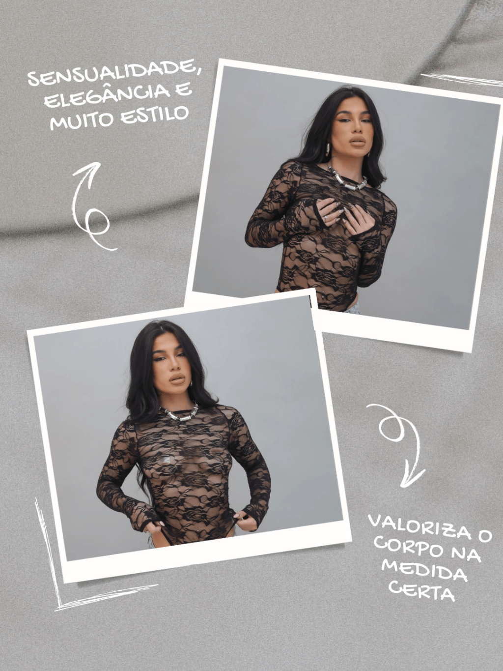 Body Feminino Manga Longa Renda Transparente Sexi Tule Festa Balada Look Noite