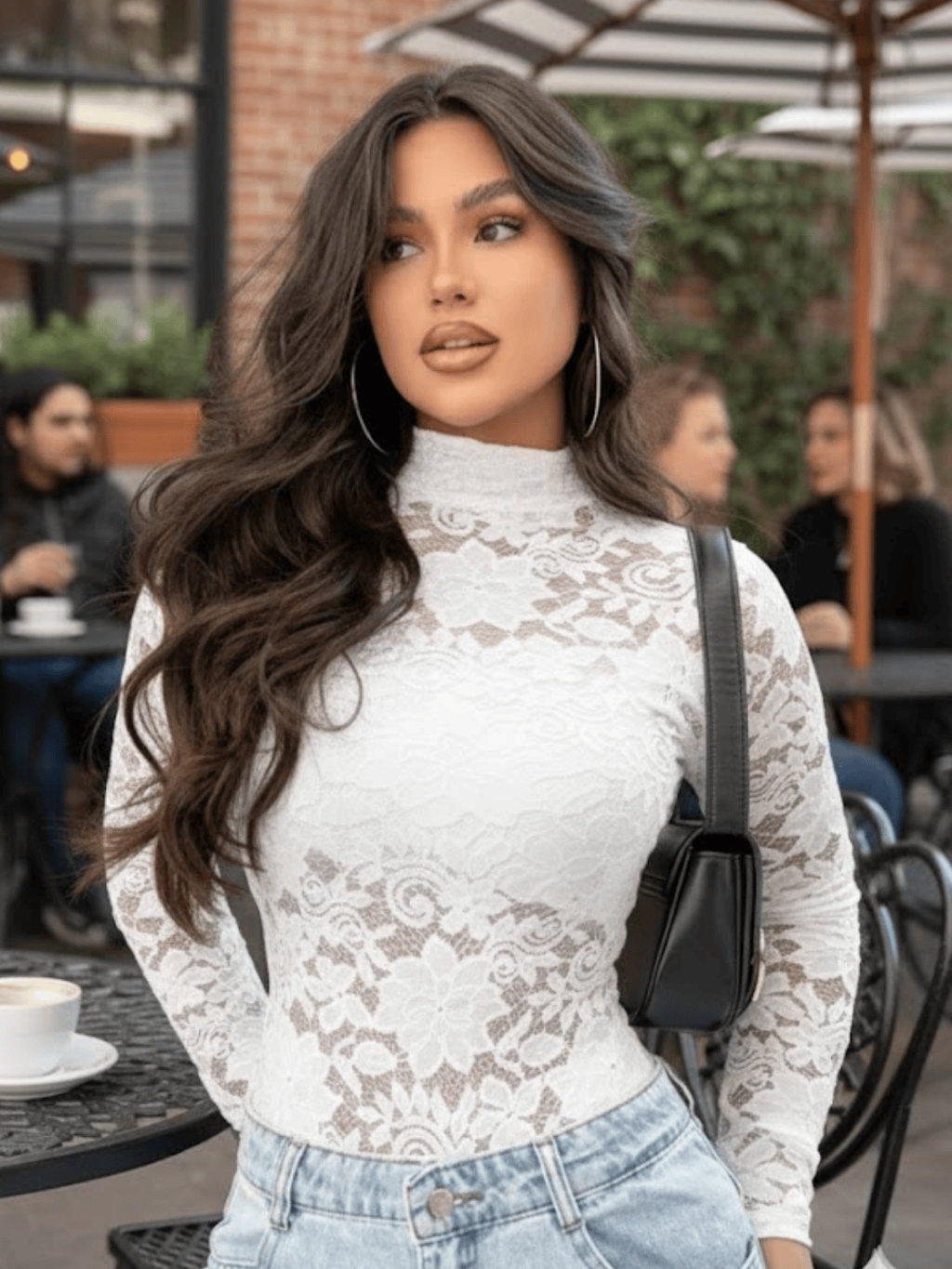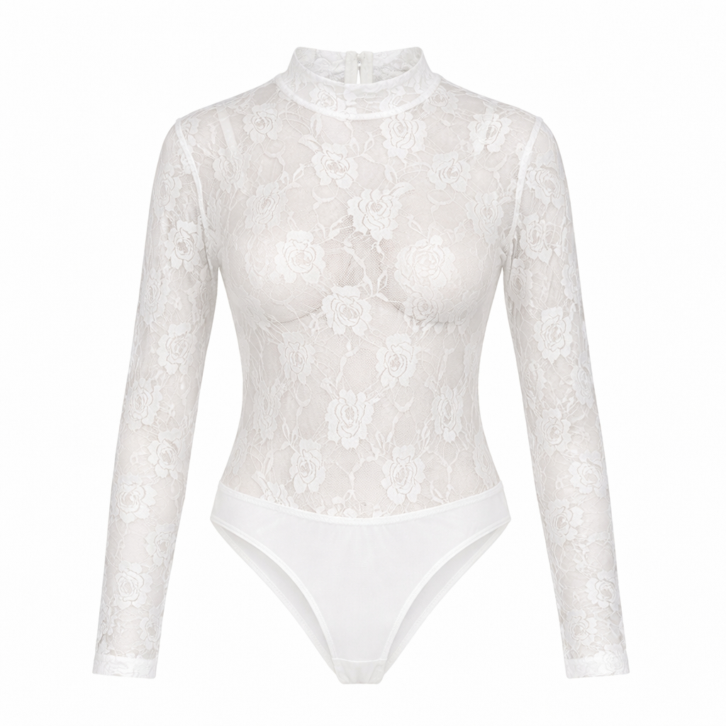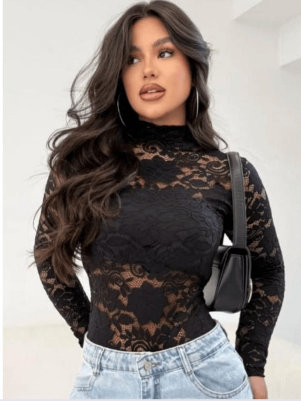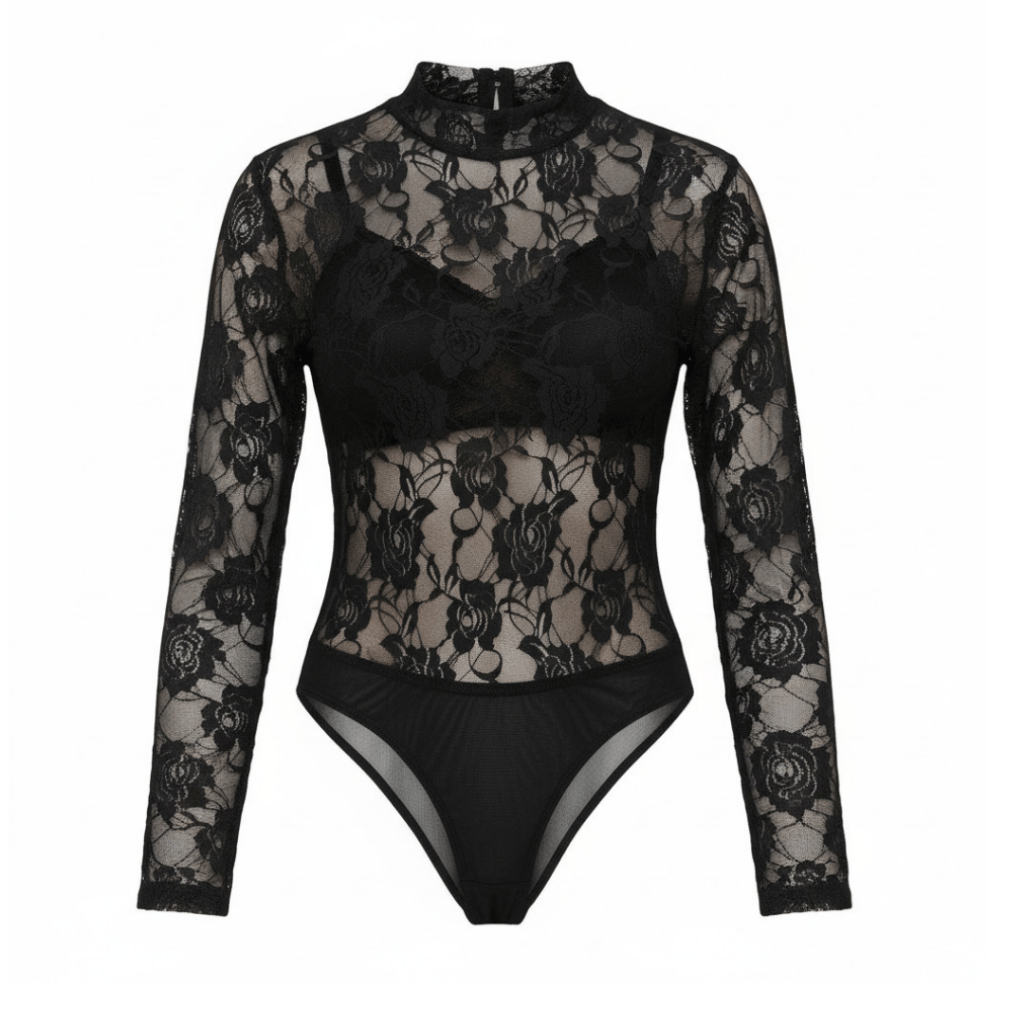 Body Feminino Manga Longa Renda Transparente Sexi Tule Festa Balada Look Noite