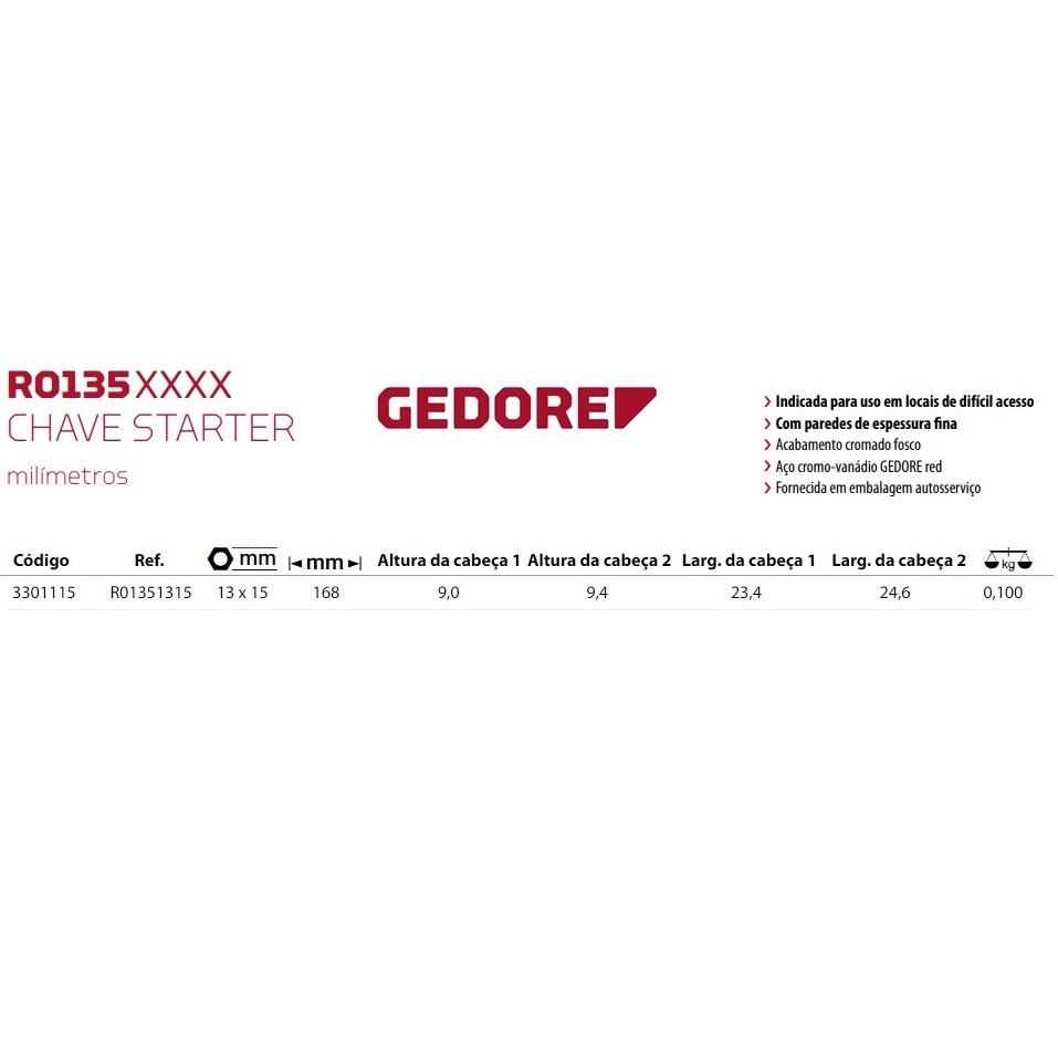 Chave Meia Lua Starter 13x15mm Gedore Red R01351315