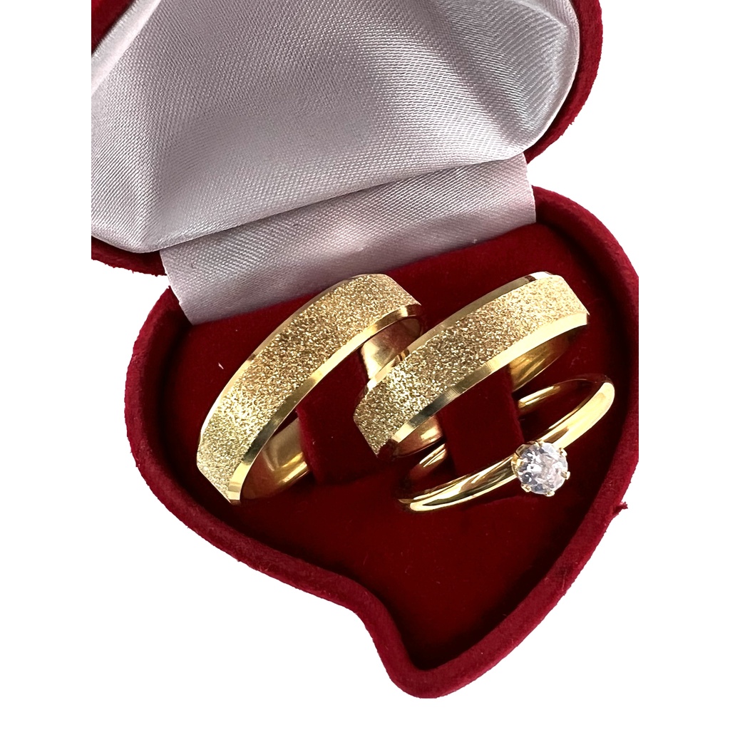 Par Aliança 6mm de Casamento e Noivado Jateada Diamantada + Anel Solitário Pedra Zircônia