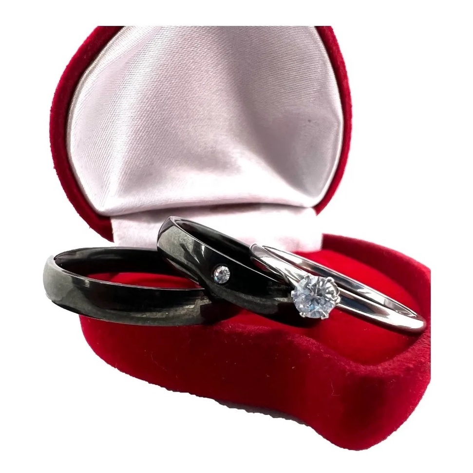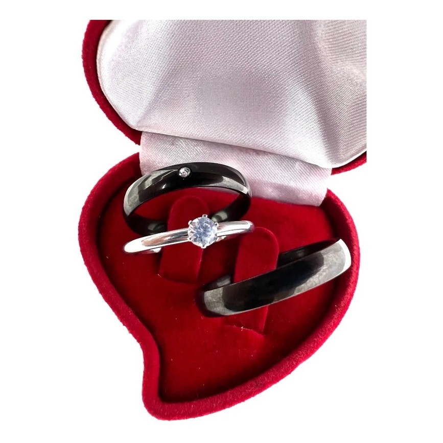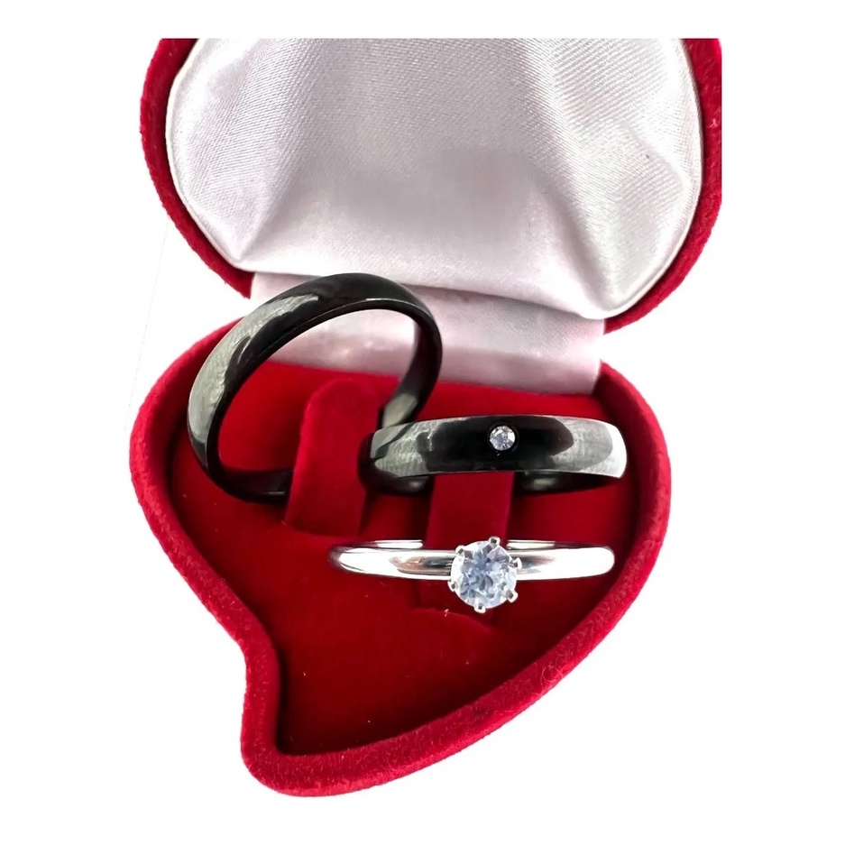 Par Aliança Preta Fina Lisa 4mm com Pedrinha + Anel Solitário 2mm