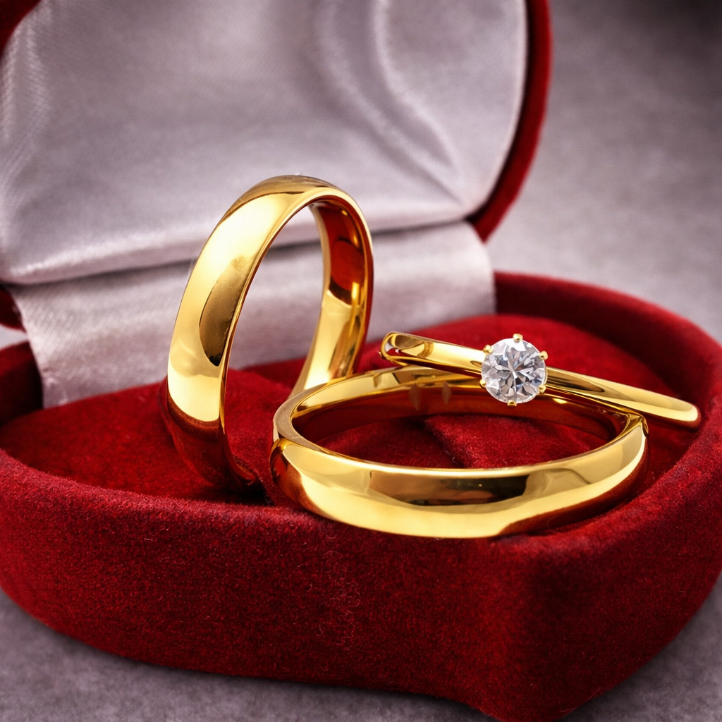 Par de Aliança de Casamento e Compromisso Fina 4mm Lisa Tradicional Banhada Premium + Anel Solitário de Noivado