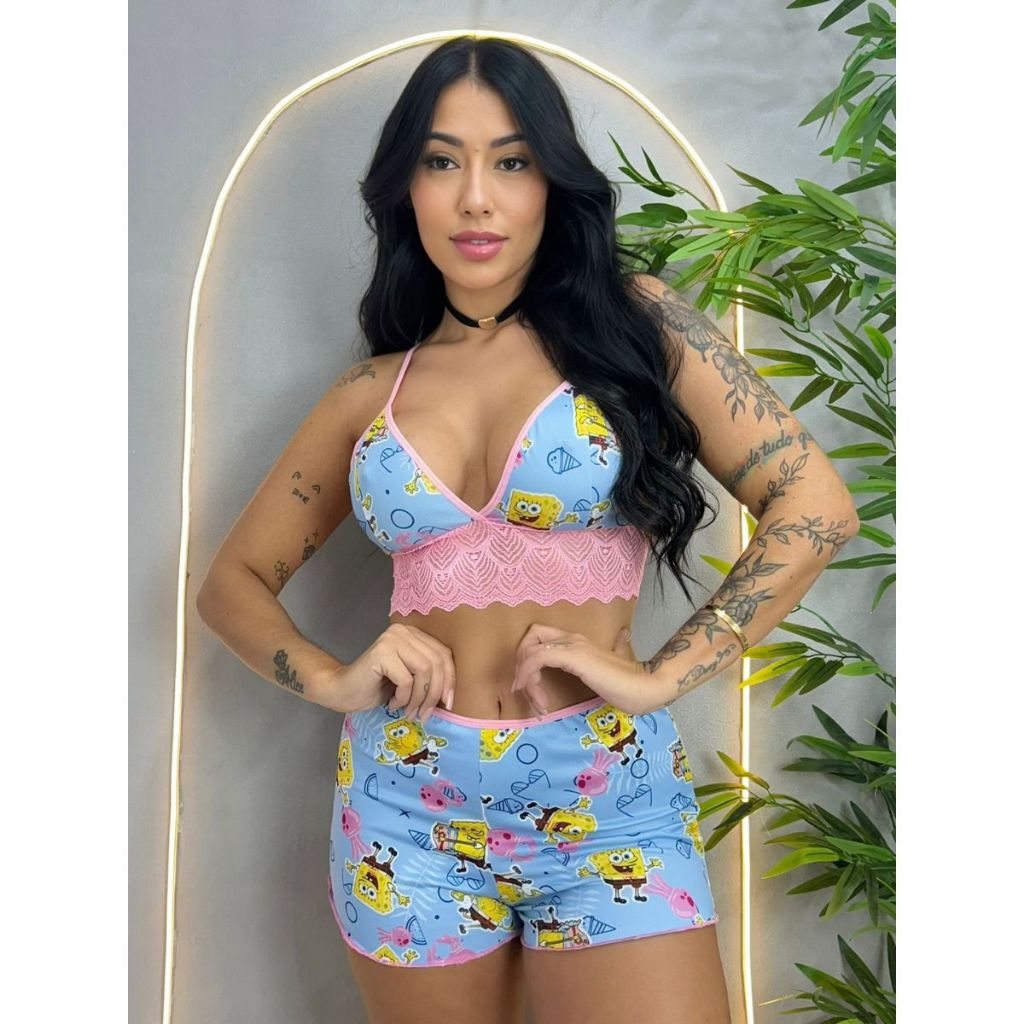 2 Baby Doll Feminino Estampado Renda Personagem Stiich Pijama Dormir Short Cropped 603