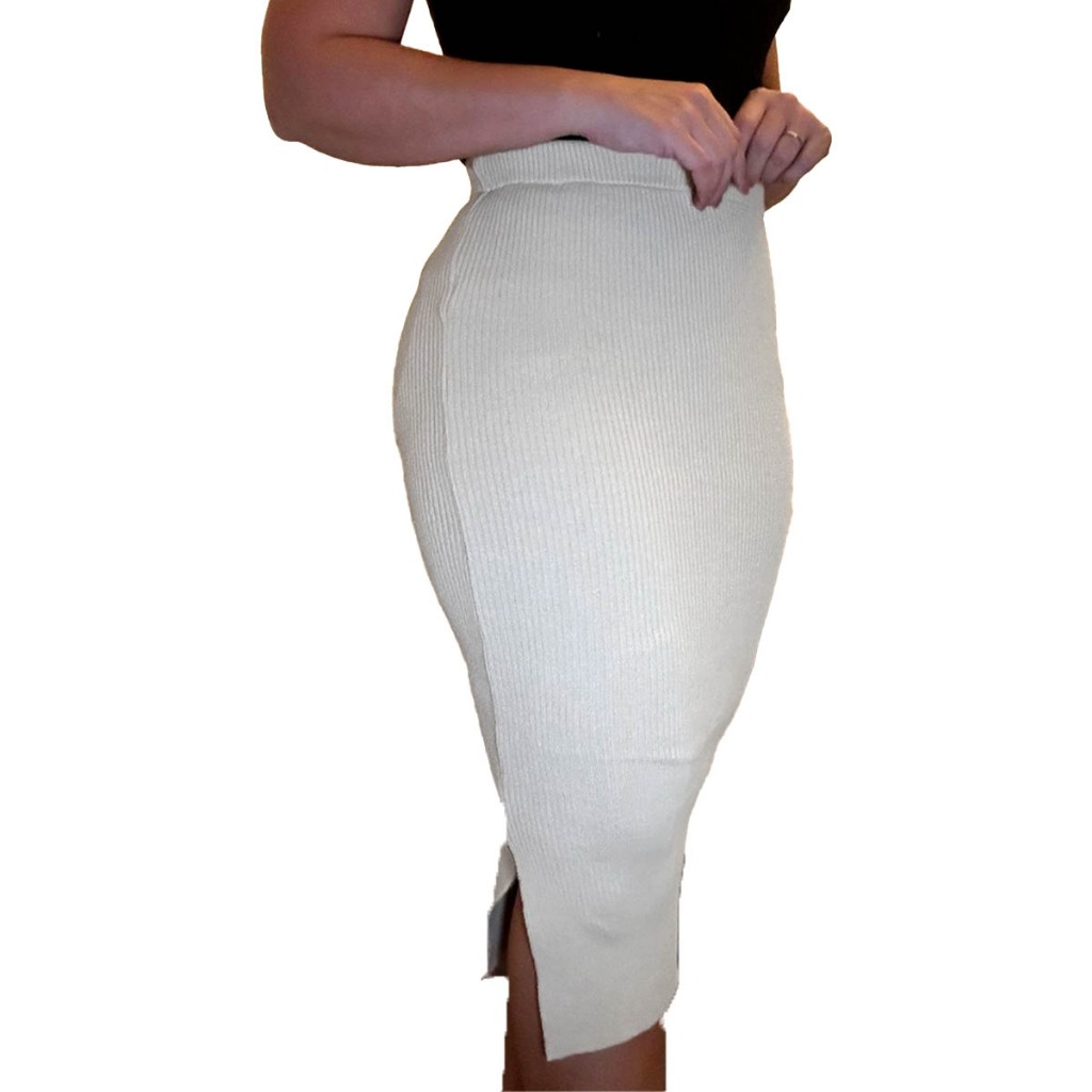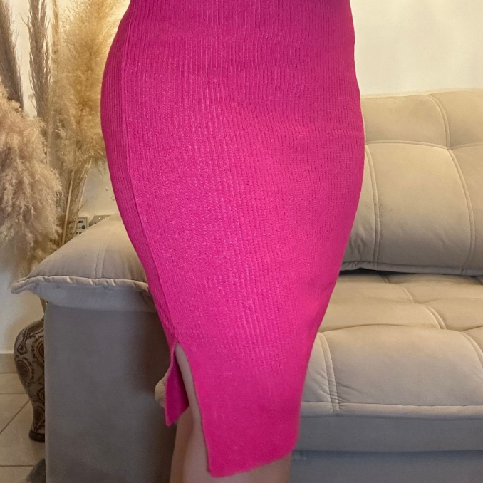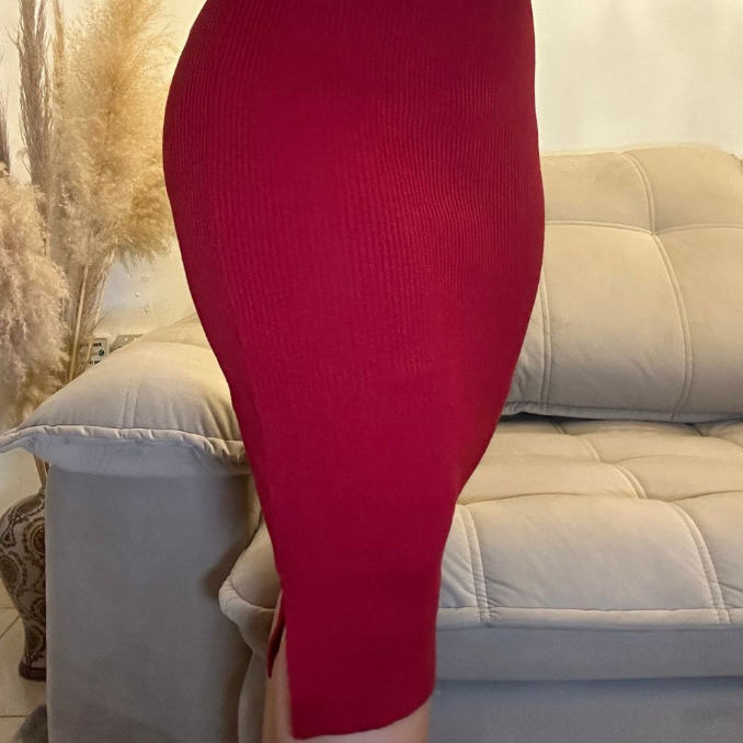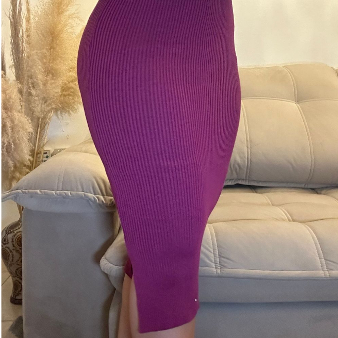 Saia Midi Tricô Tricot com Elasticidade Fenda Lateral Canelado