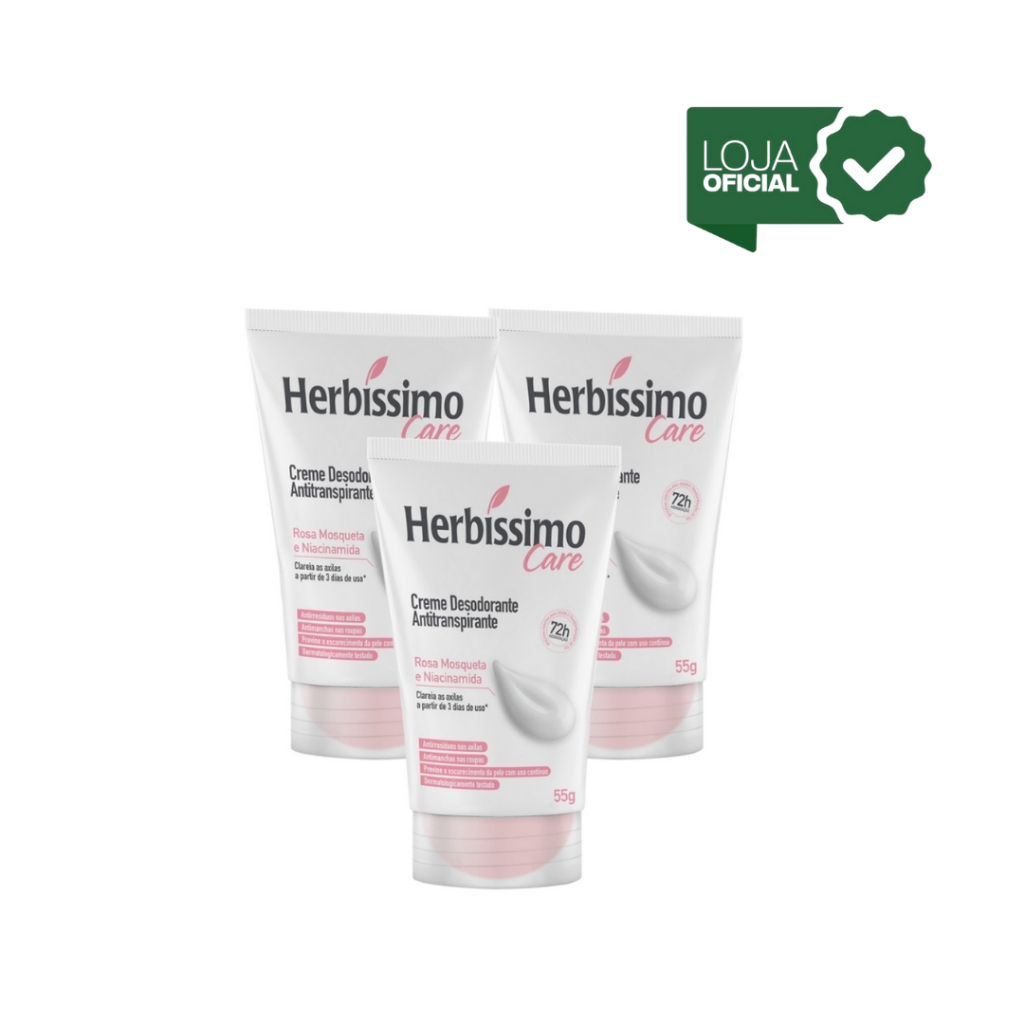 Kit 3 unid - Desodorante Creme Antitranspirante Herbíssimo Bisnaga Rosa Mosqueta e Niacinamida 55g