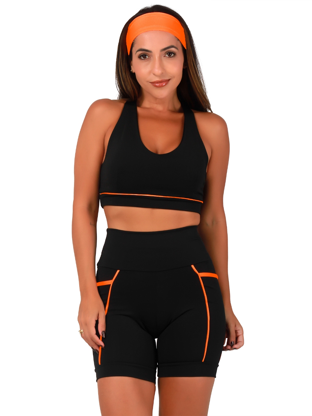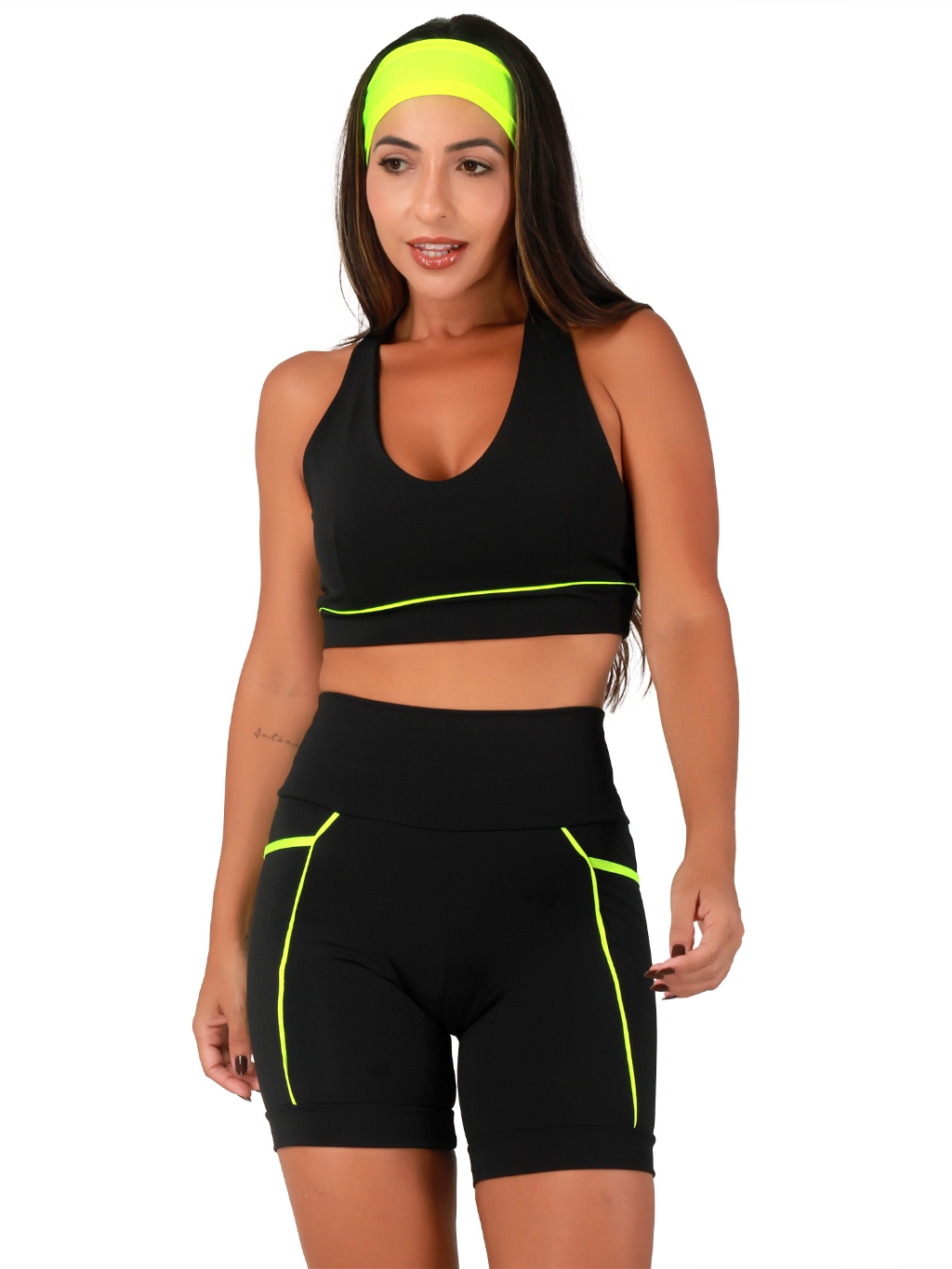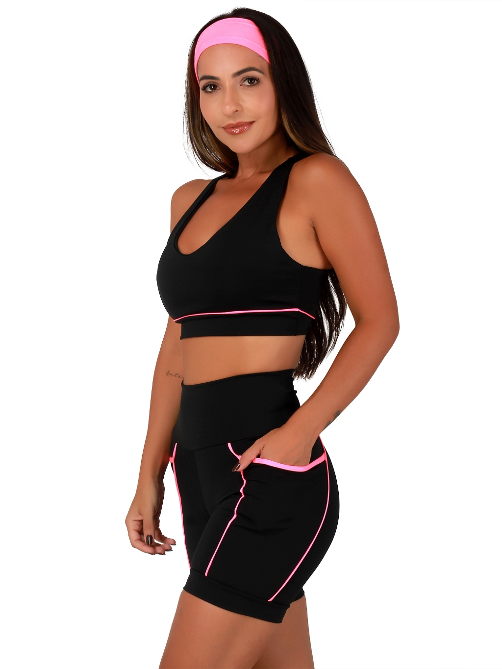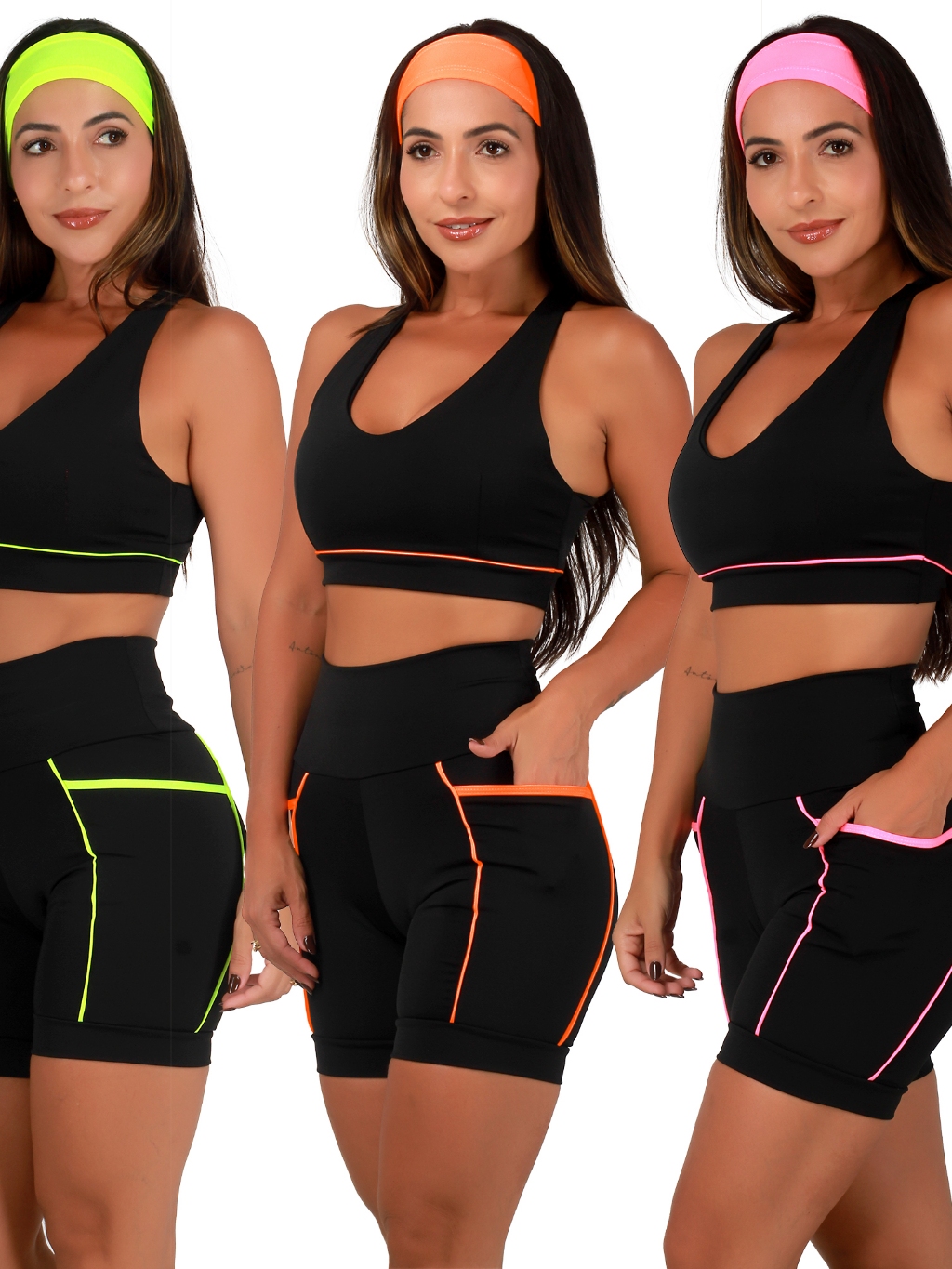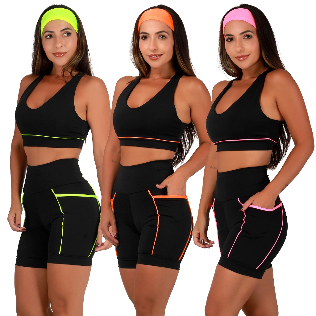 Kit 3 Conjuntos Fitness Feminino Top Academia + Bermuda Compressão Com Bolsos Laterais
