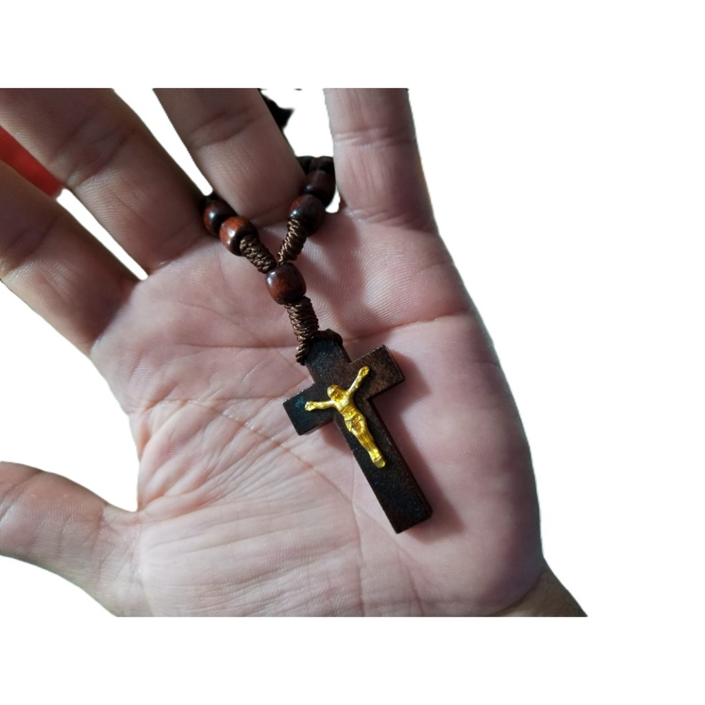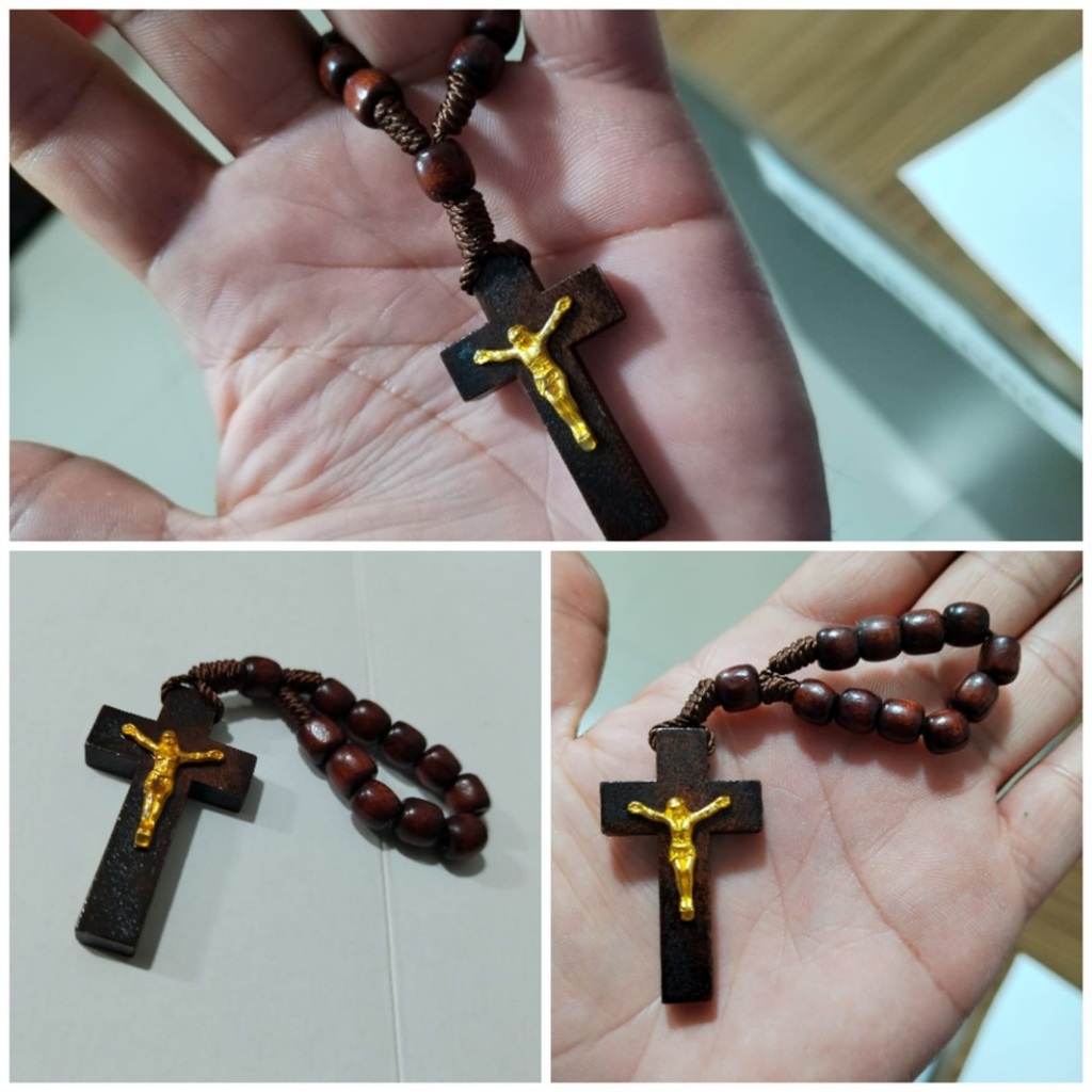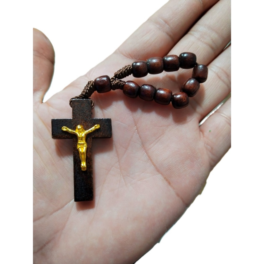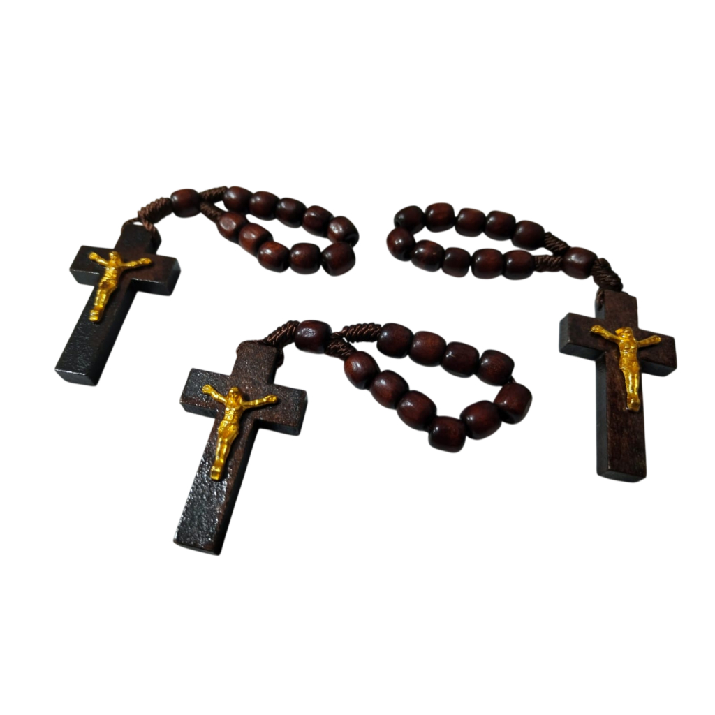 Terço de Dedo em Madeira com Crucifixo e Jesus em Dourado Tamanho 11cm - Missa Batizado Lembrancinha