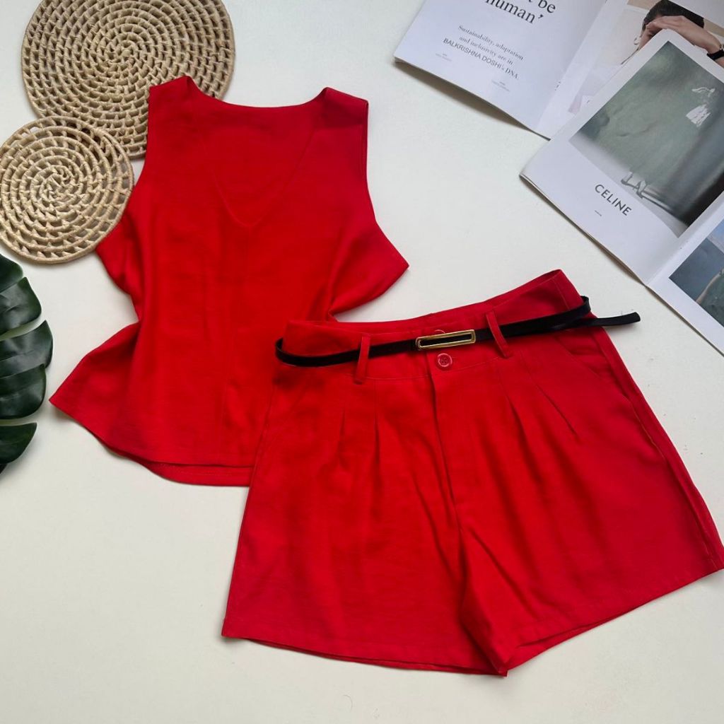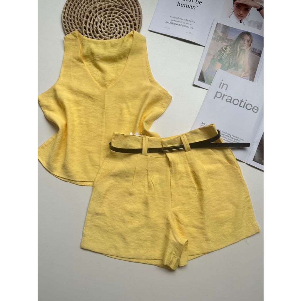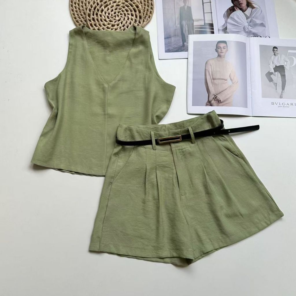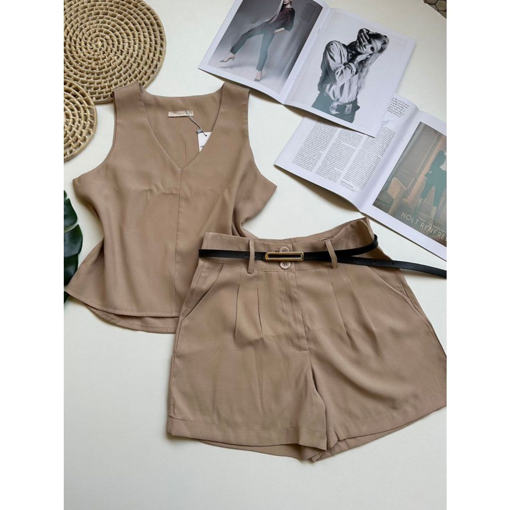 Conjunto marrant feminino de camiseta sem mangas e shorts com cinto