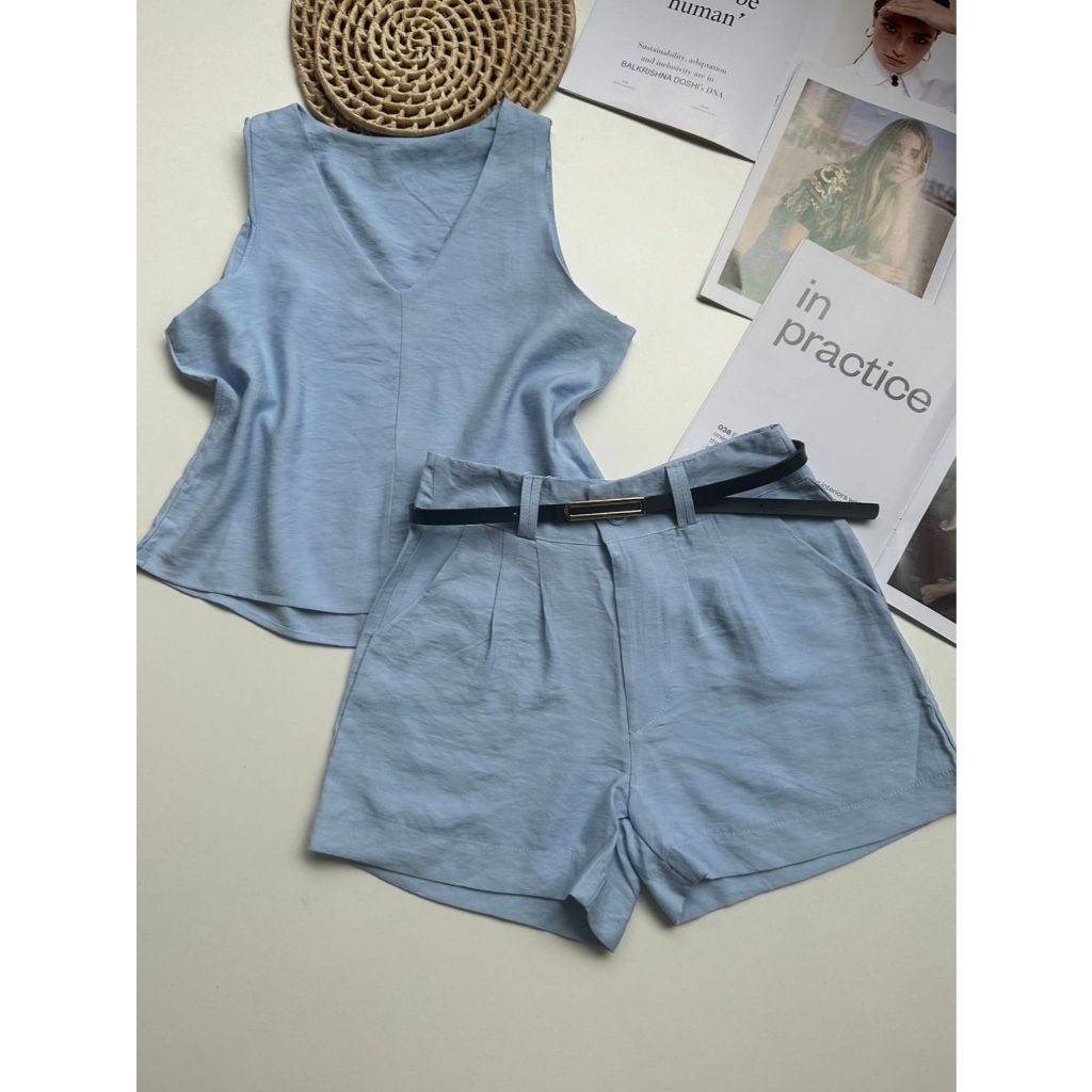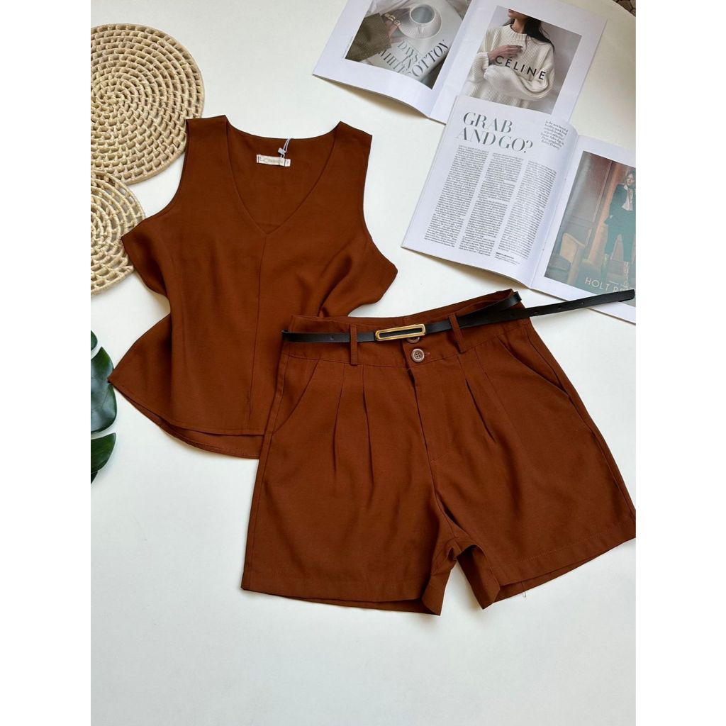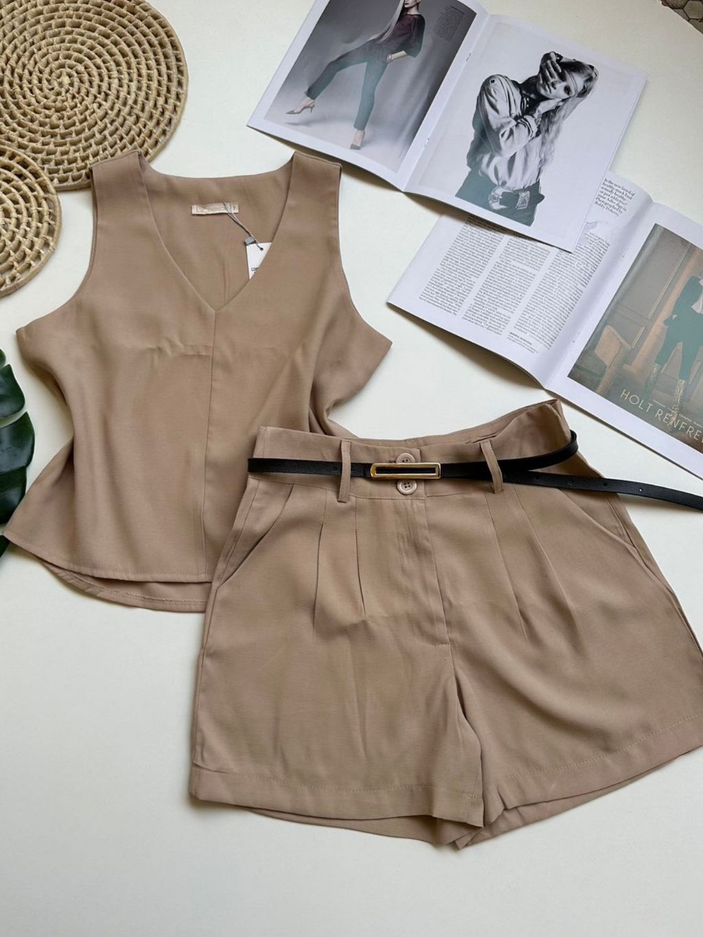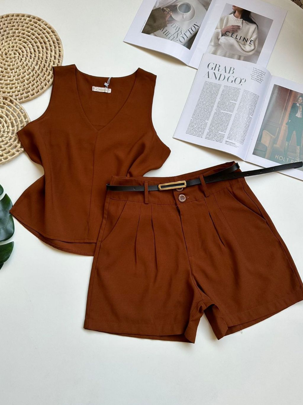 Conjunto marrant feminino de camiseta sem mangas e shorts com cinto