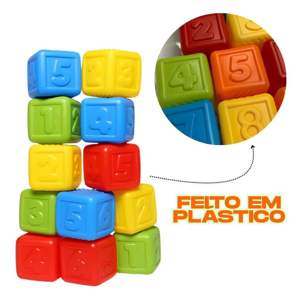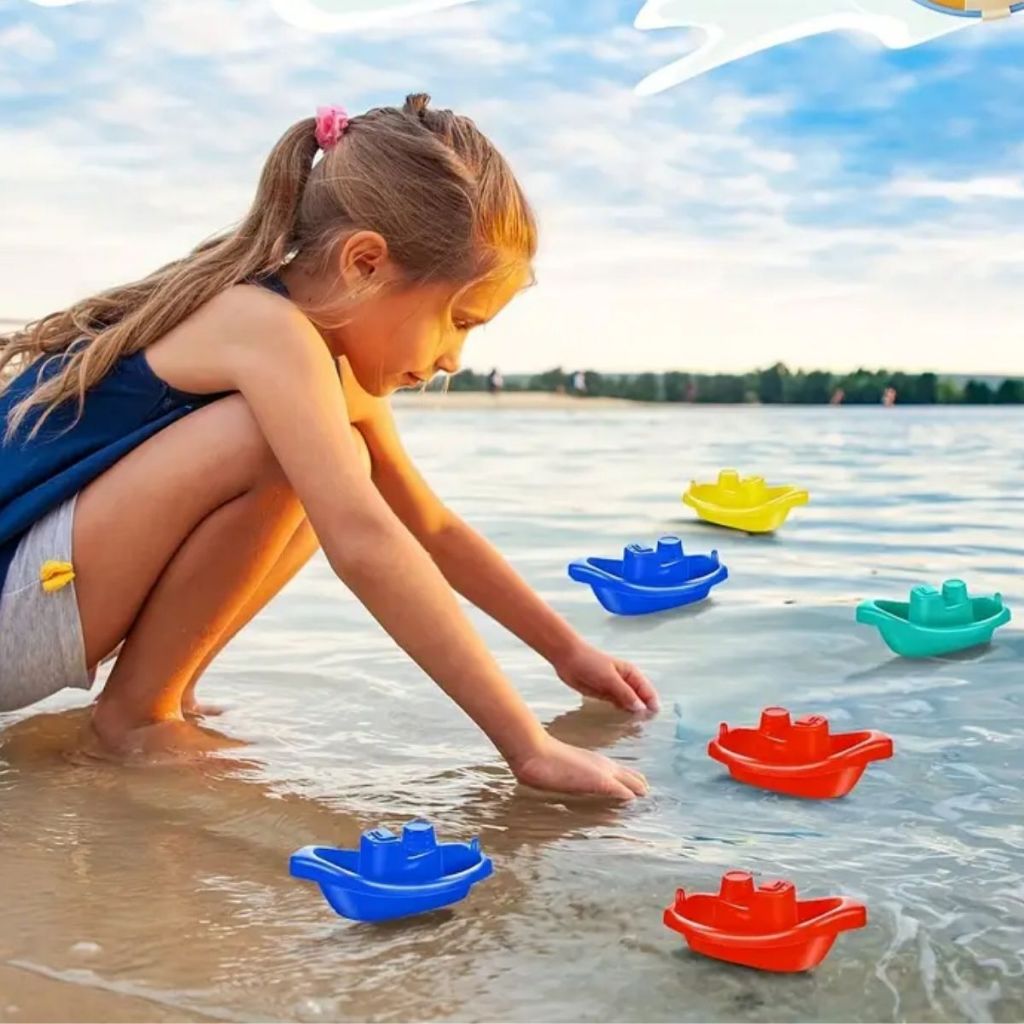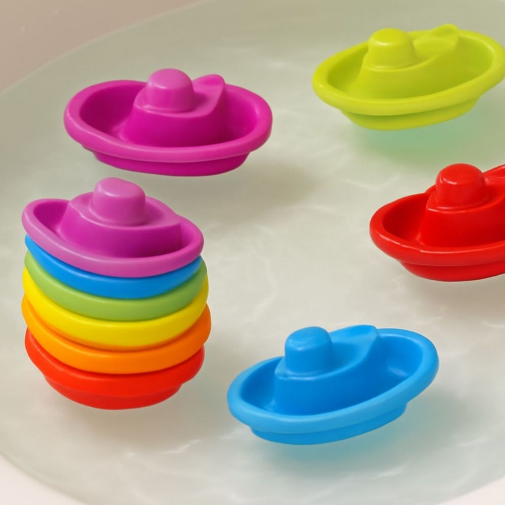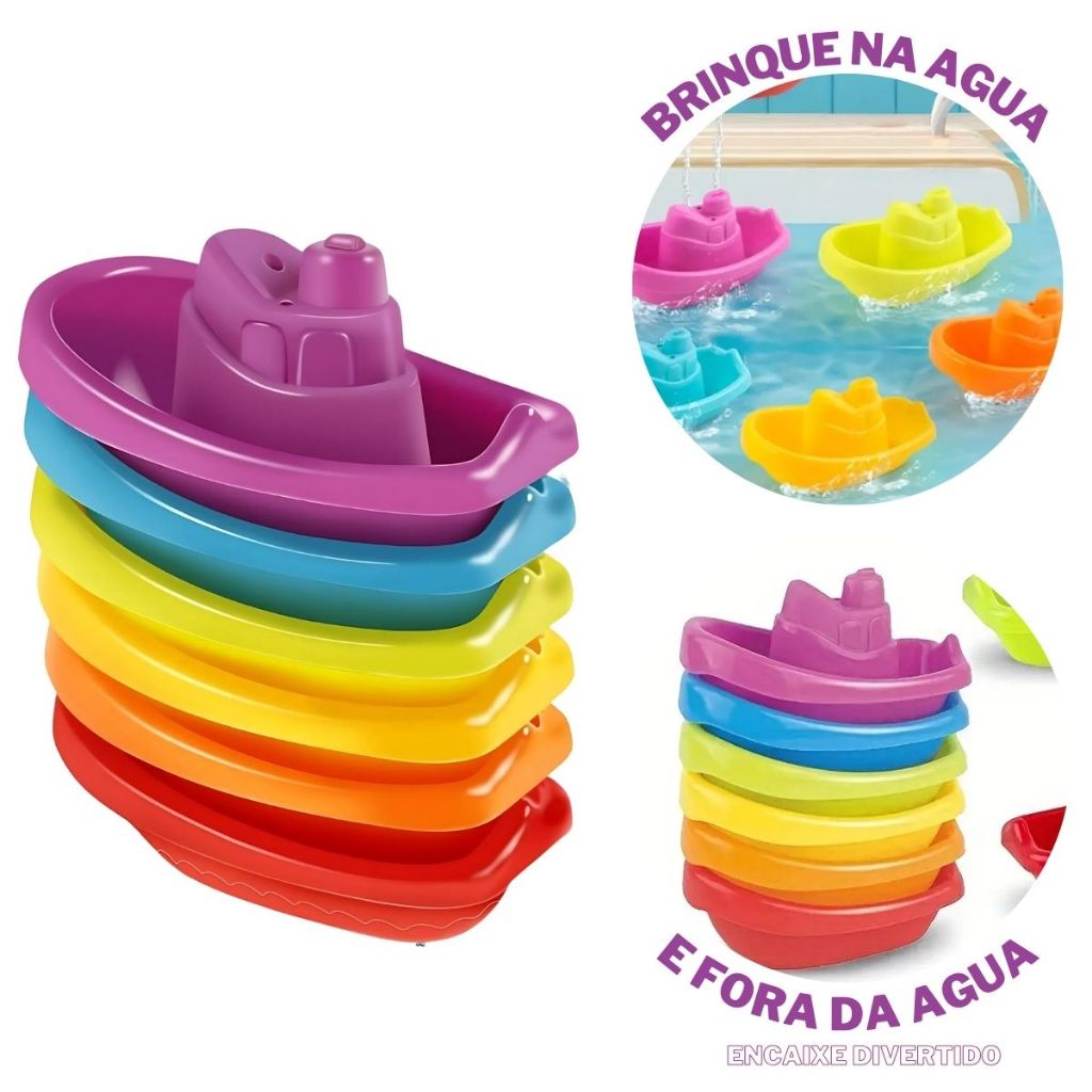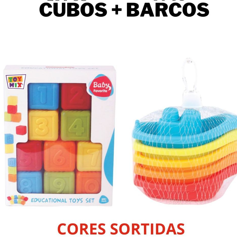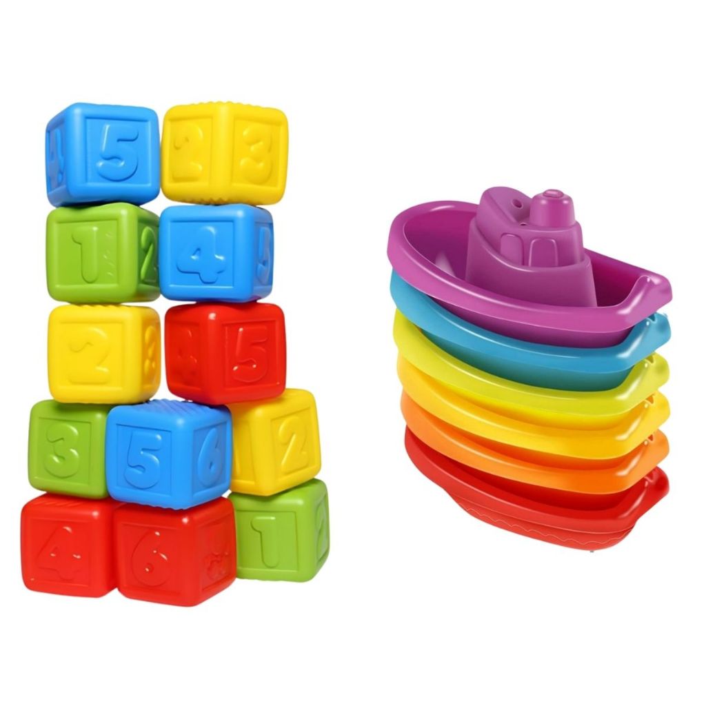 KIT Brinquedo Divertido 5 Barquinhos Encaixe + 10 Cubos Empilháveis Coloridos Números Educativo