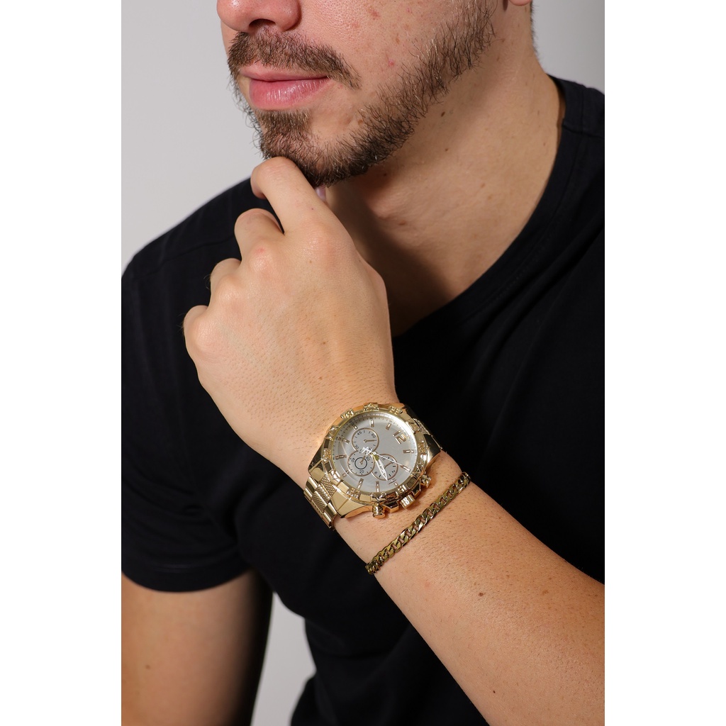 Kit Relógio Masculino Com Pulseira Banhada A Ouro 18k