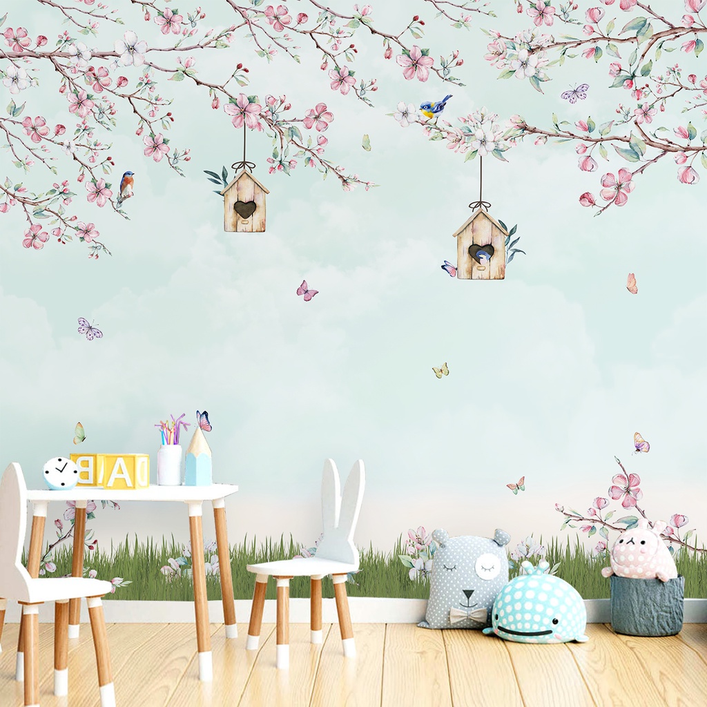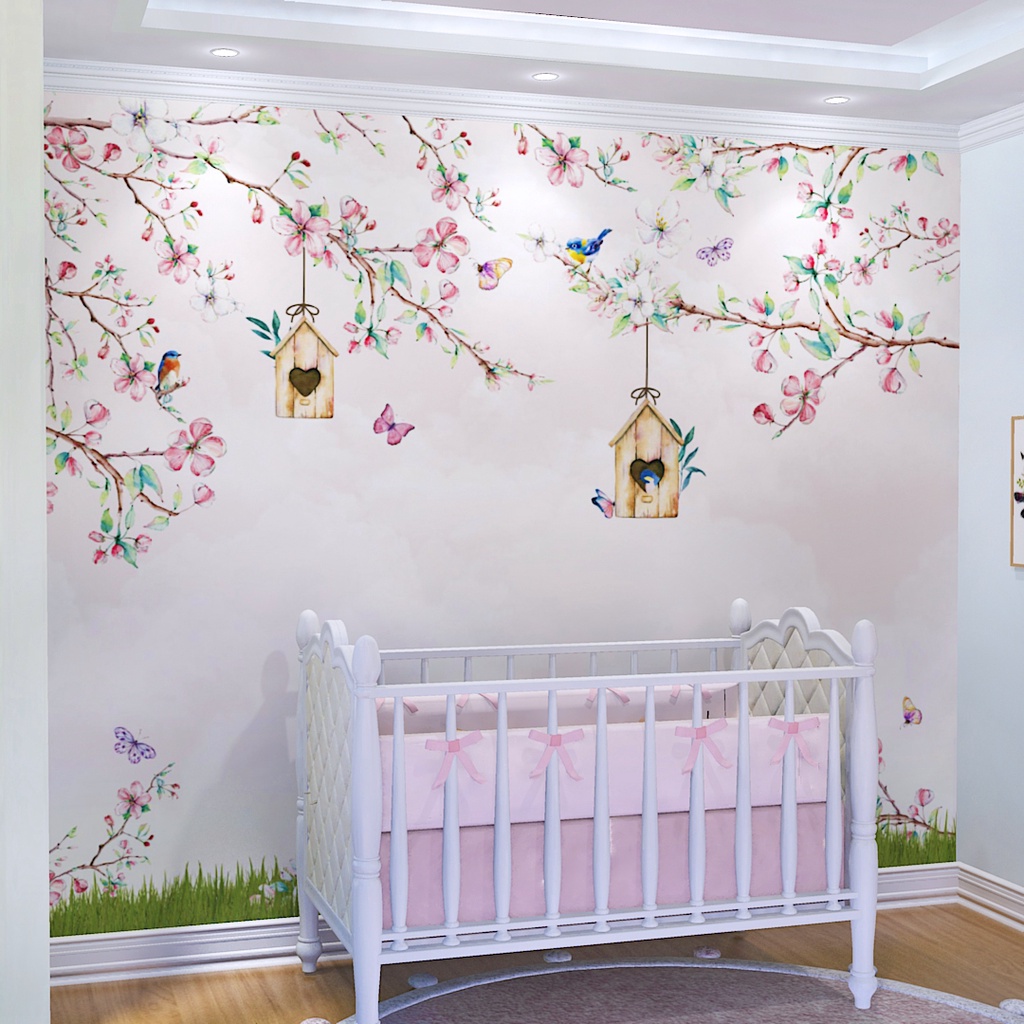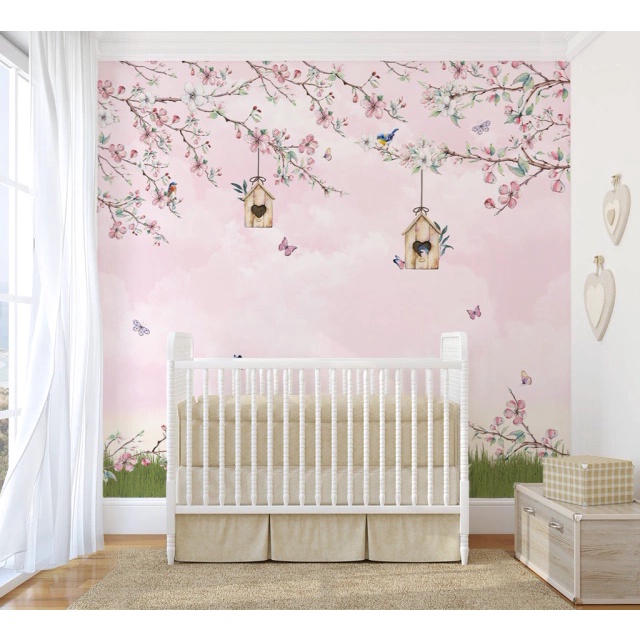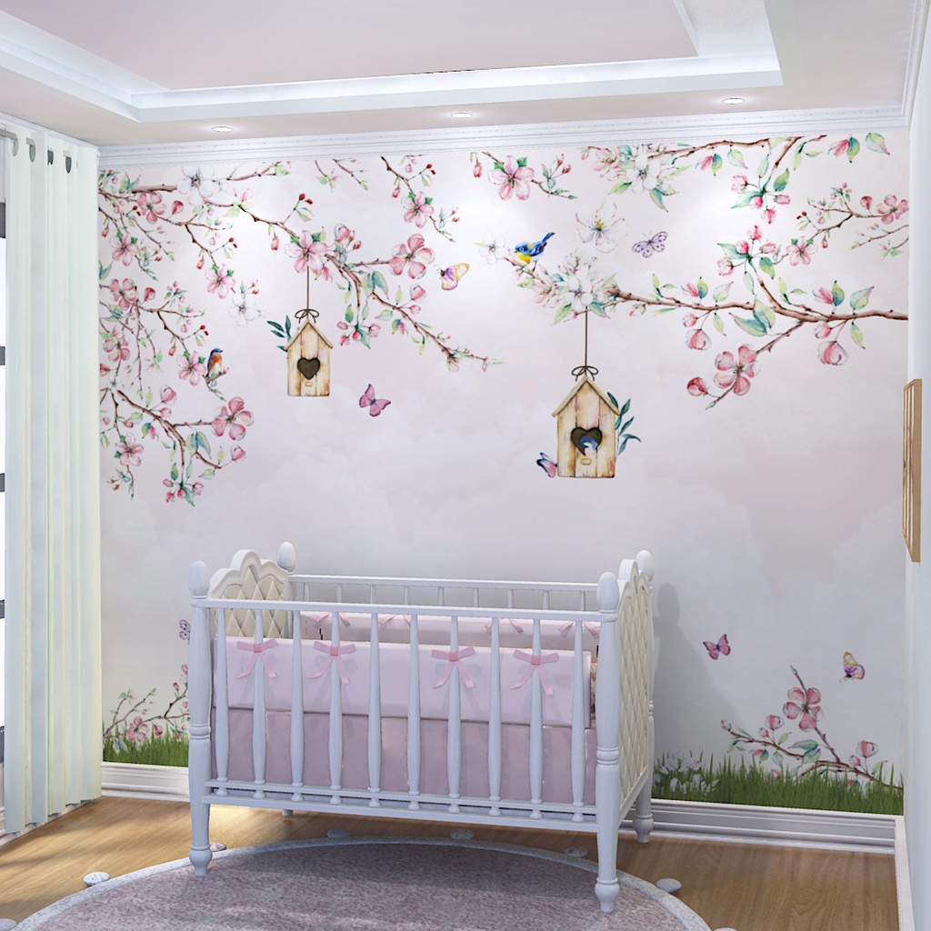 Papel de Parede Galhos e Flores Jardim Rosa Quarto Infantil de Bebê e Criança Personalizado m²