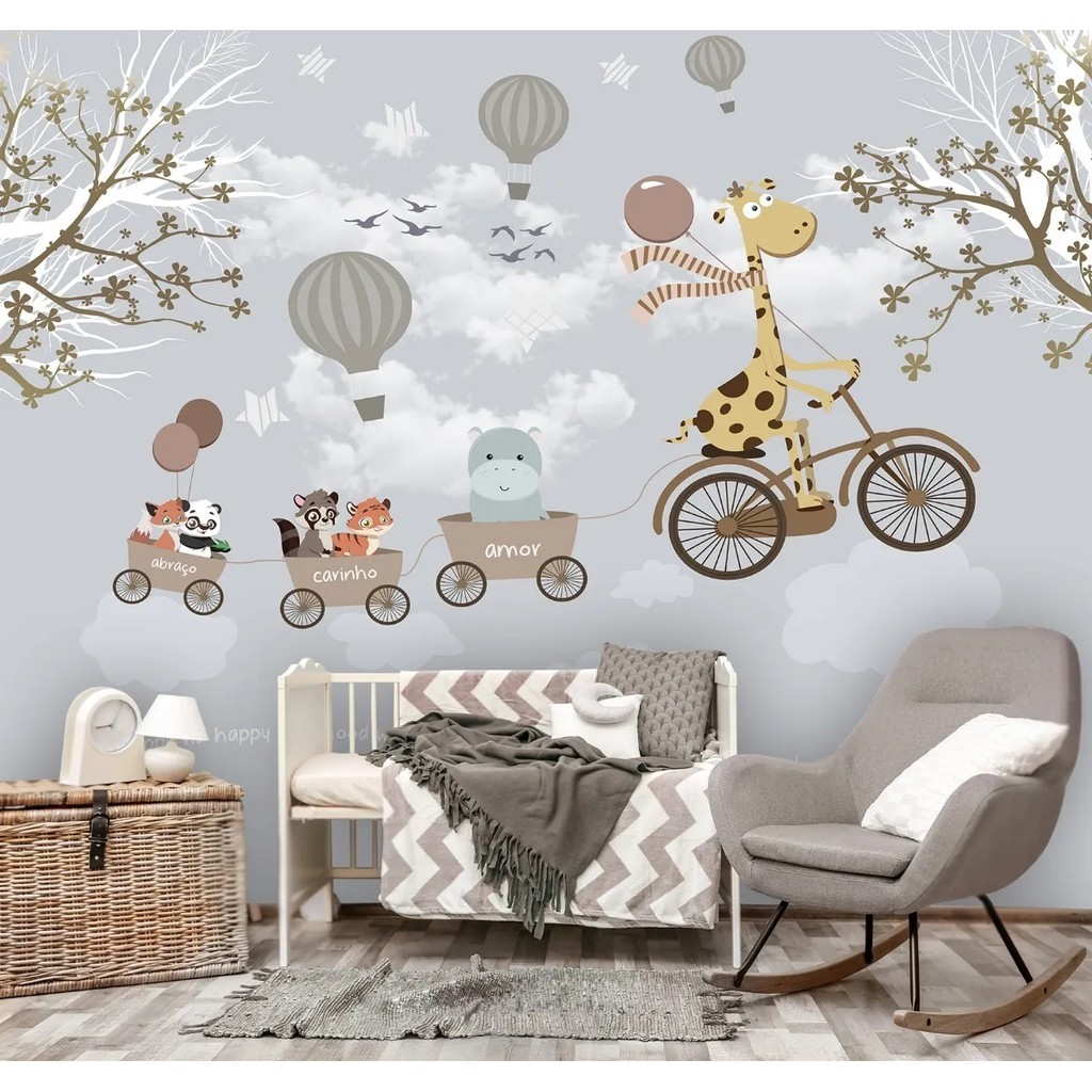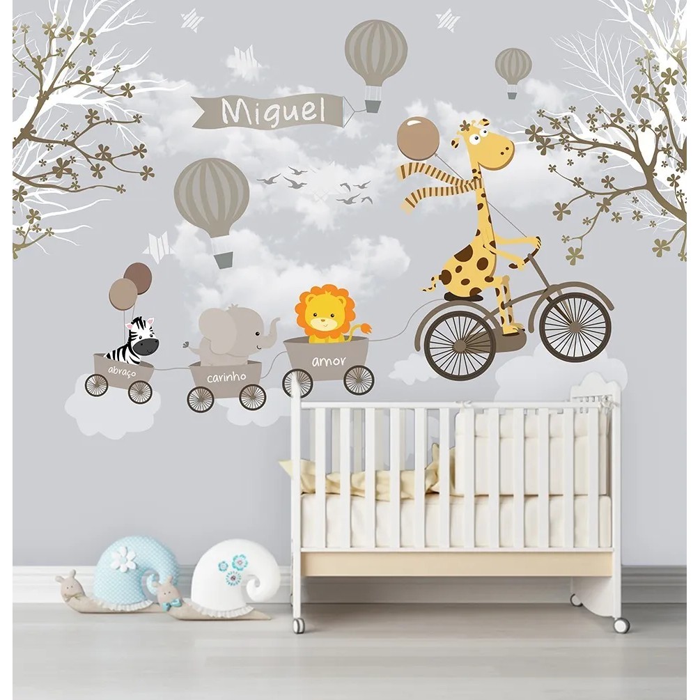 Papel de Parede Safari Cinza Quarto Infantil de Bebê e Criança Girafa Animais e Bicicleta