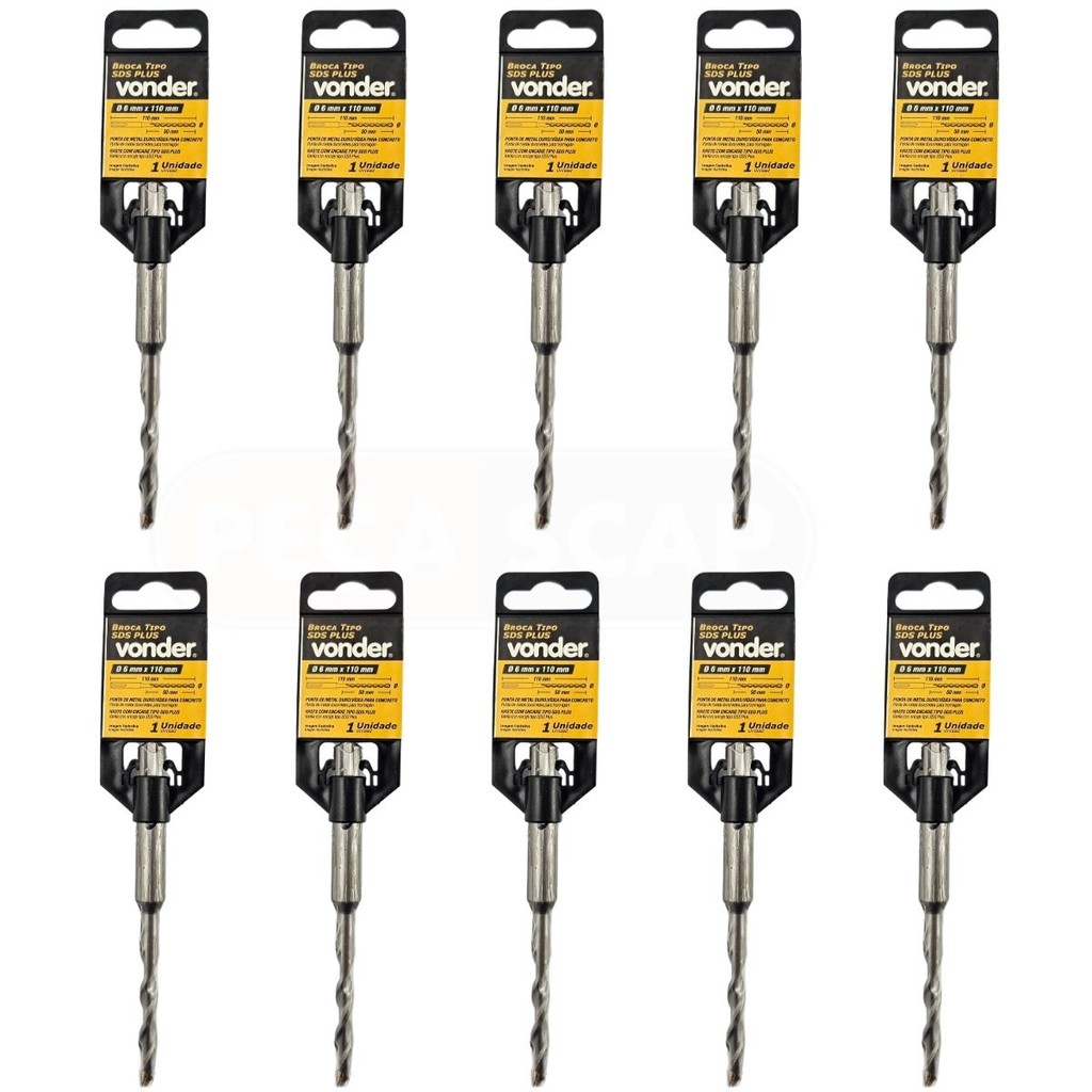 Kit 10 Brocas Com Encaixe Tipo SDS PLUS Para Pedras, Alvenaria E Concreto 6mm x 110mm - Vonder