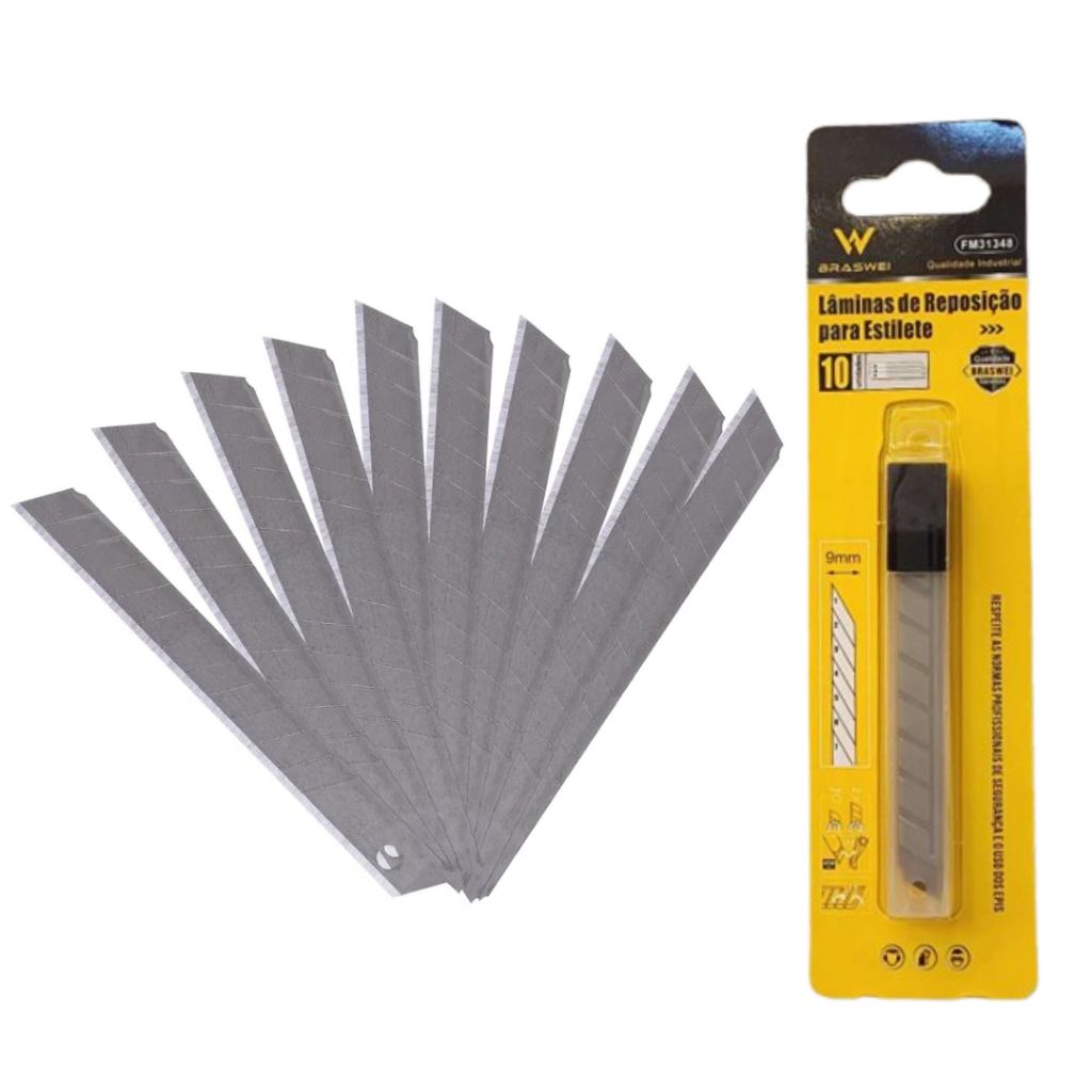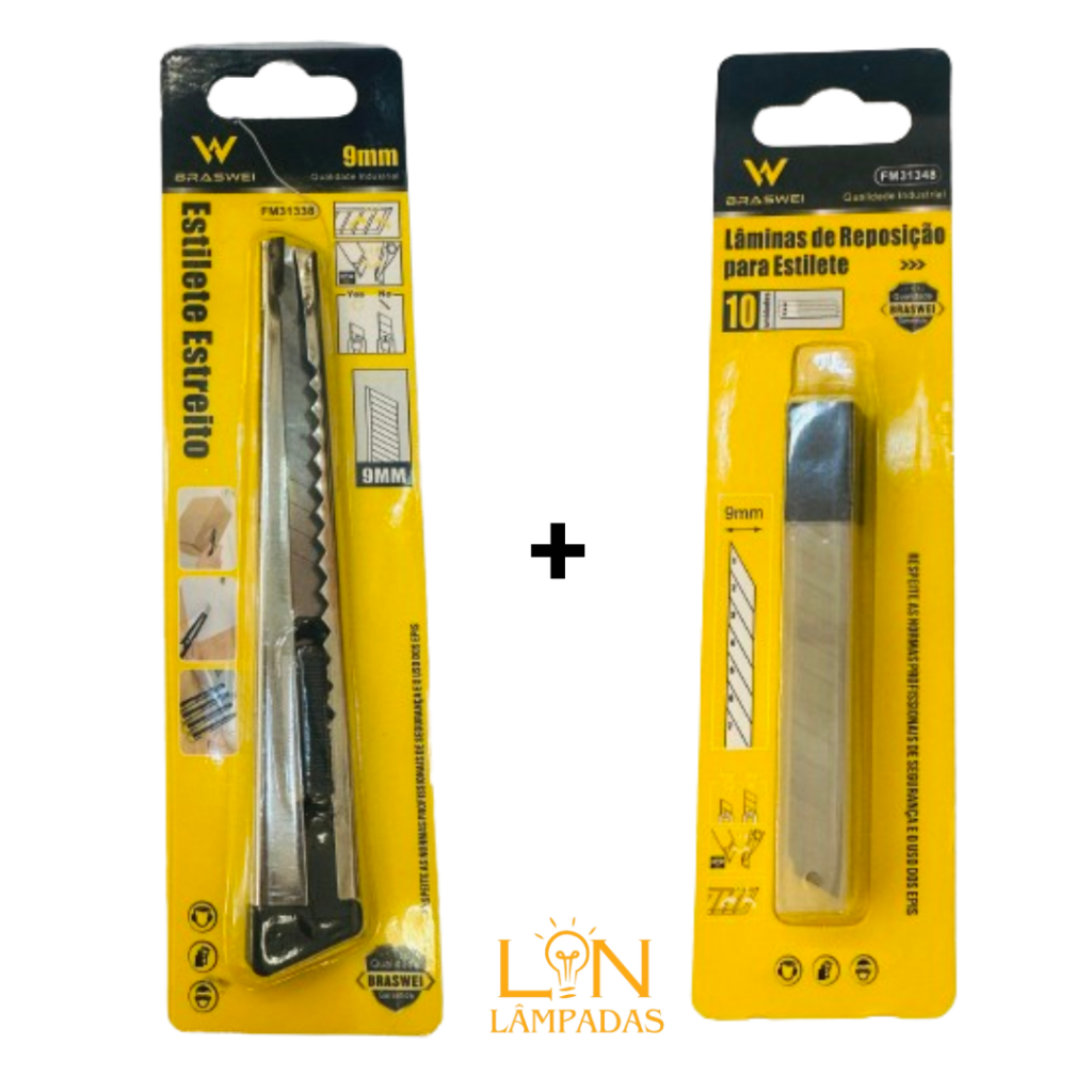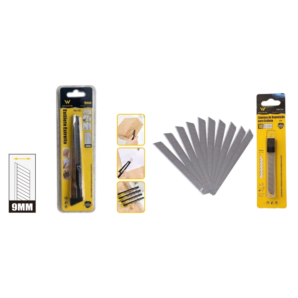 KIT Estilete Estreito de Metal Inox + 10 Lâminas de Reposição 9mm Profissional Cortes de Precisão