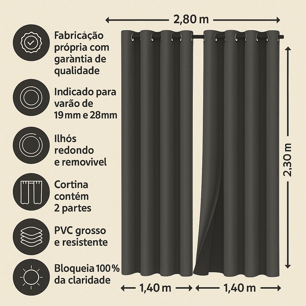 Cortina para Quarto, Cozinha, Sala Blackout Blecaute Vários Tamanhos 1,30 1,60 1,80 2,30 PVC Corta Luz 100%
